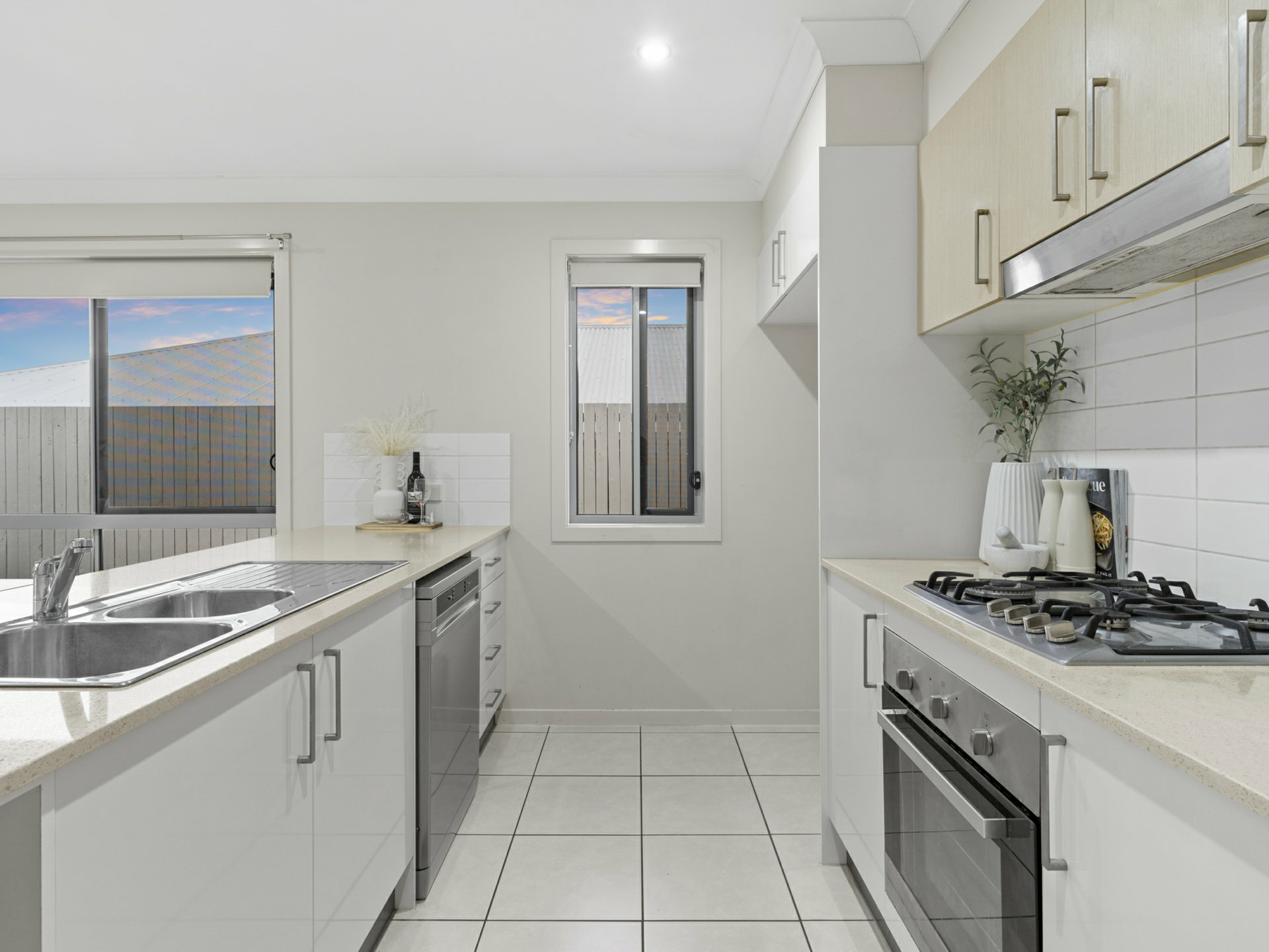 Modern kitchen with stone bench, gas cooktop, electric oven