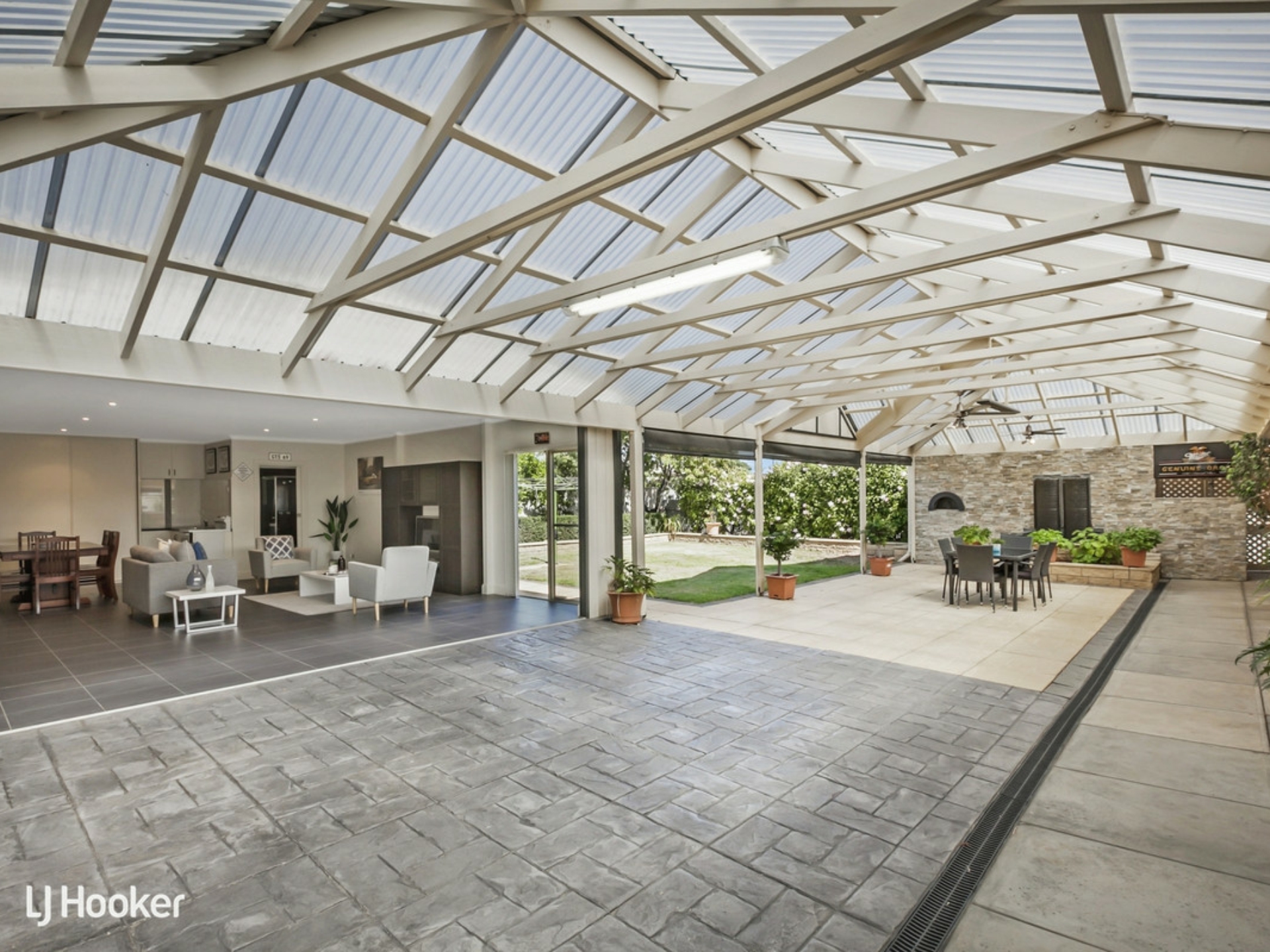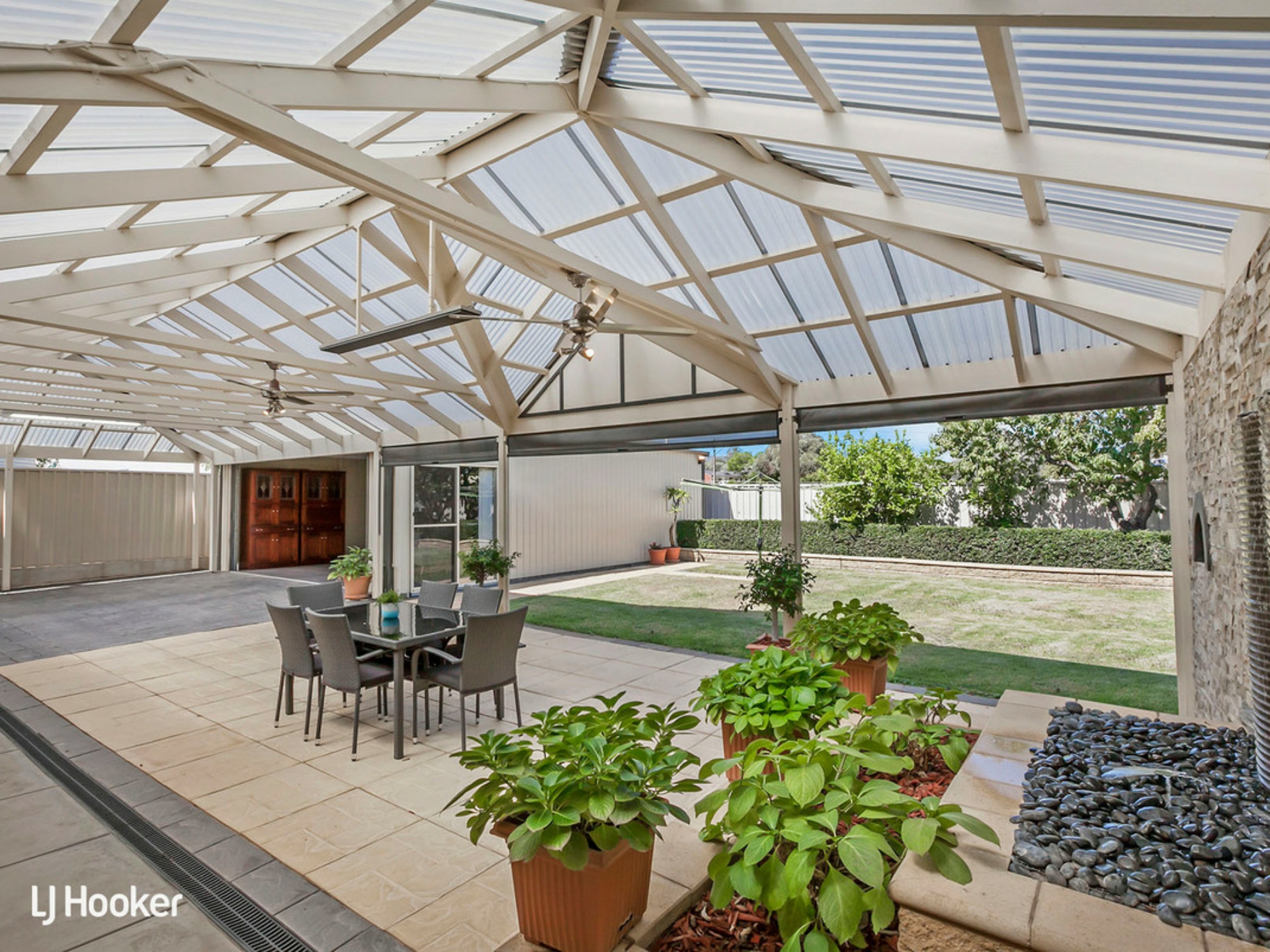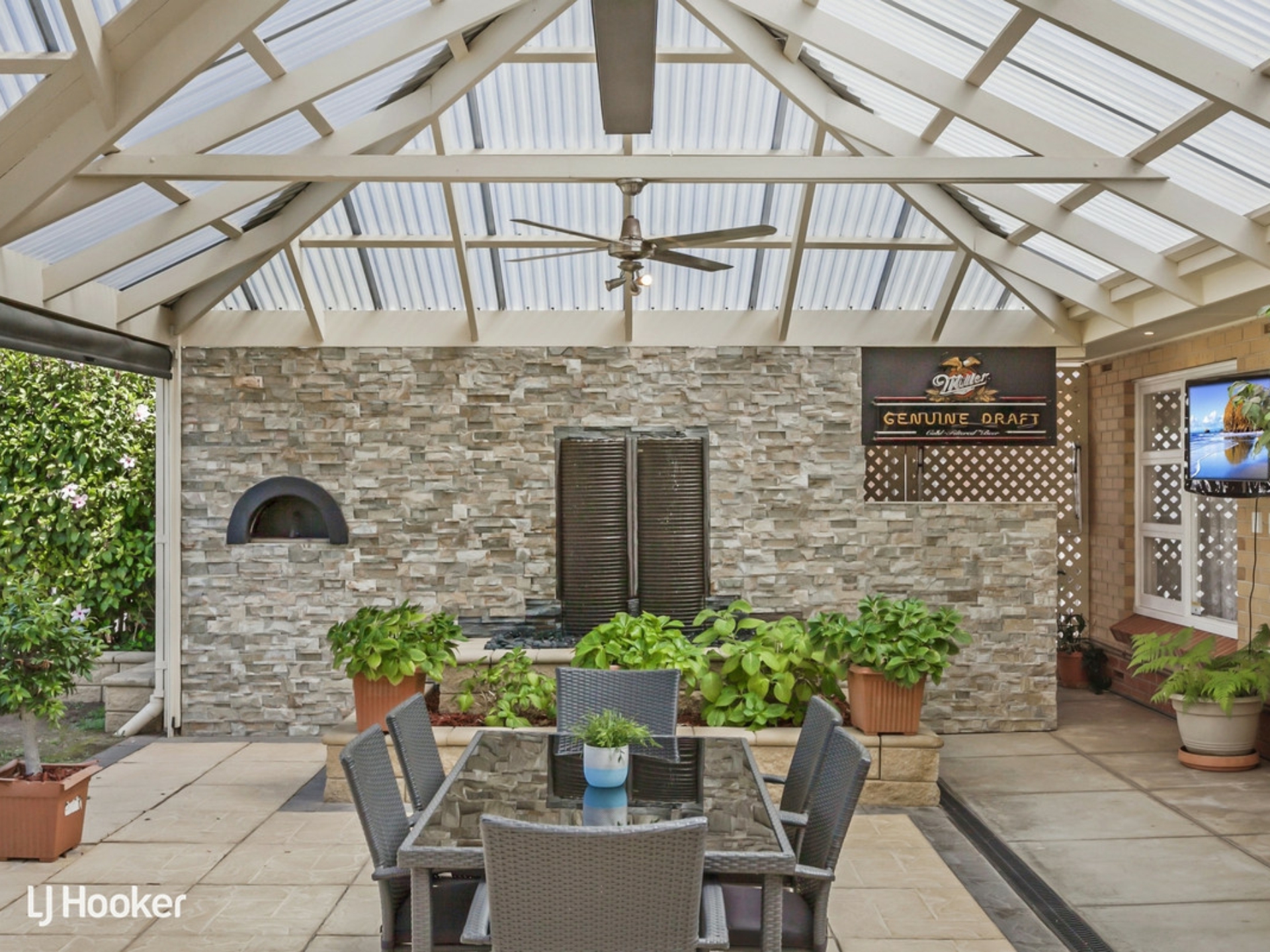 But it's the pull of the all-weather outdoors you cannot deny; heat strips, ceiling fans, the ambience of its water feature to those non-stop social days and nights deserving of its paved and airy expanse.