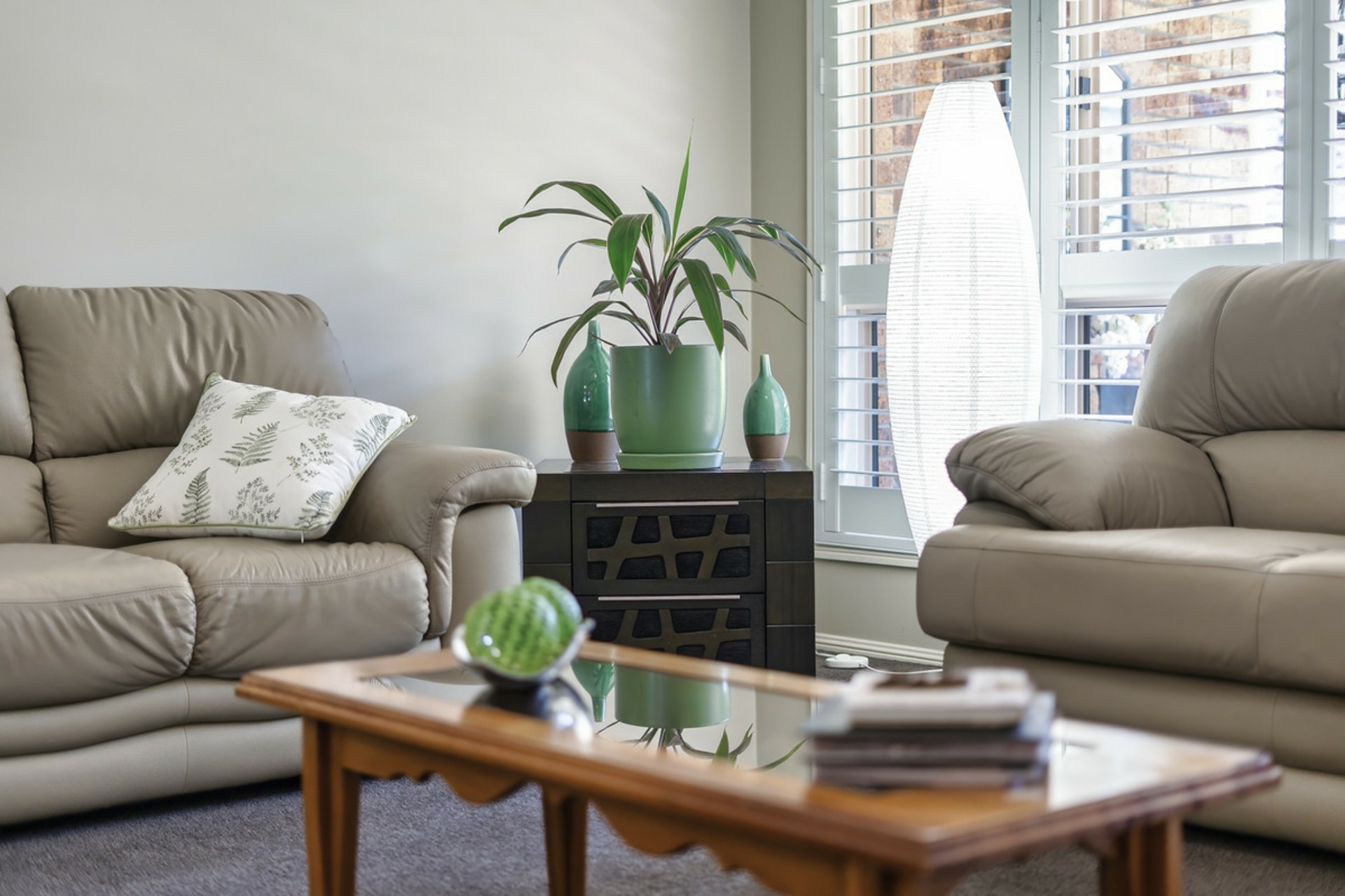 Both bedrooms are thoughtfully positioned, with built-in robes and ceiling fans, while the master enjoys direct access to the two-way bathroom for added privacy and practicality. Plantation shutters add a stylish finish and enhance natural light throughout.