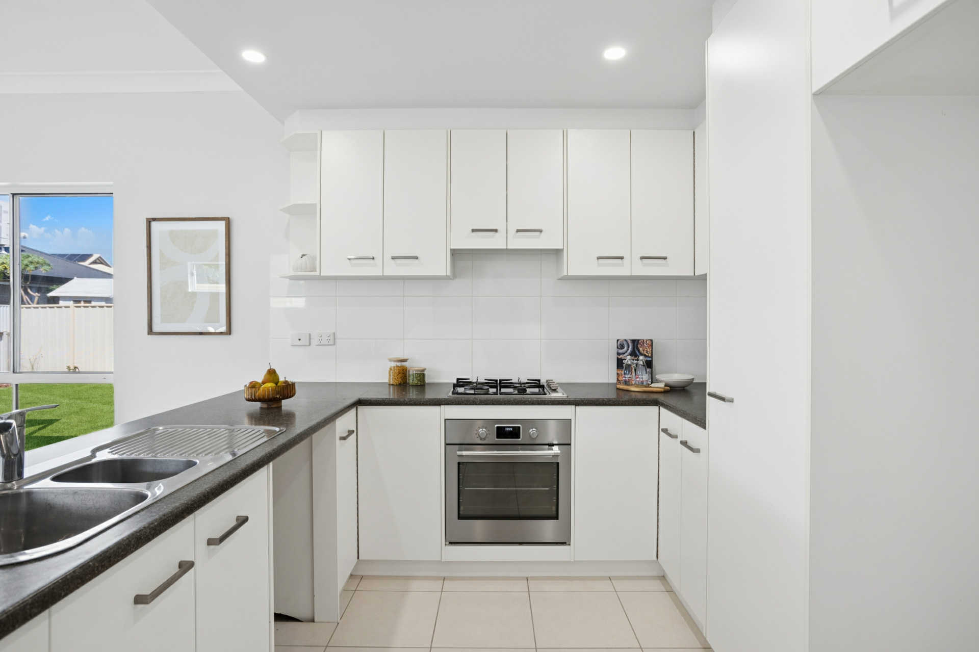 - Kitchen with gas cooktop, oven, breakfast bar and pantry cupboard