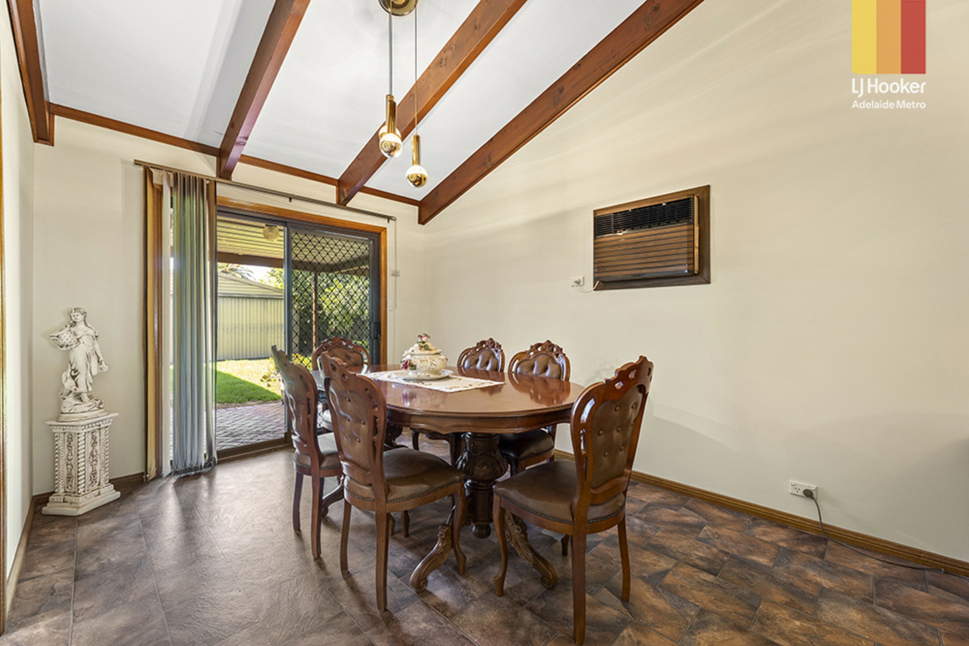 The lounge brings warmth and character with a pitched roof and exposed timber beams flowing through to the formal dining space with sliding door access outside.