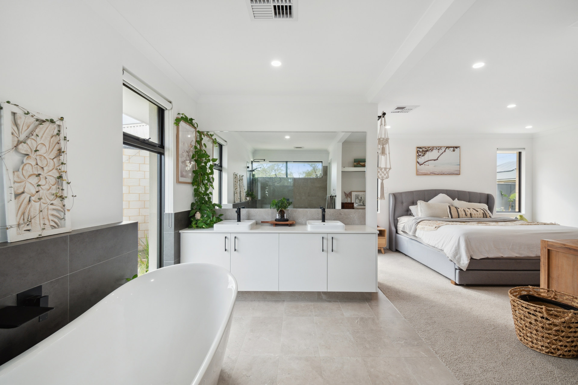 - Master en-suite with double stone top vanity, rain head shower, large freestanding bath and separate toilet
