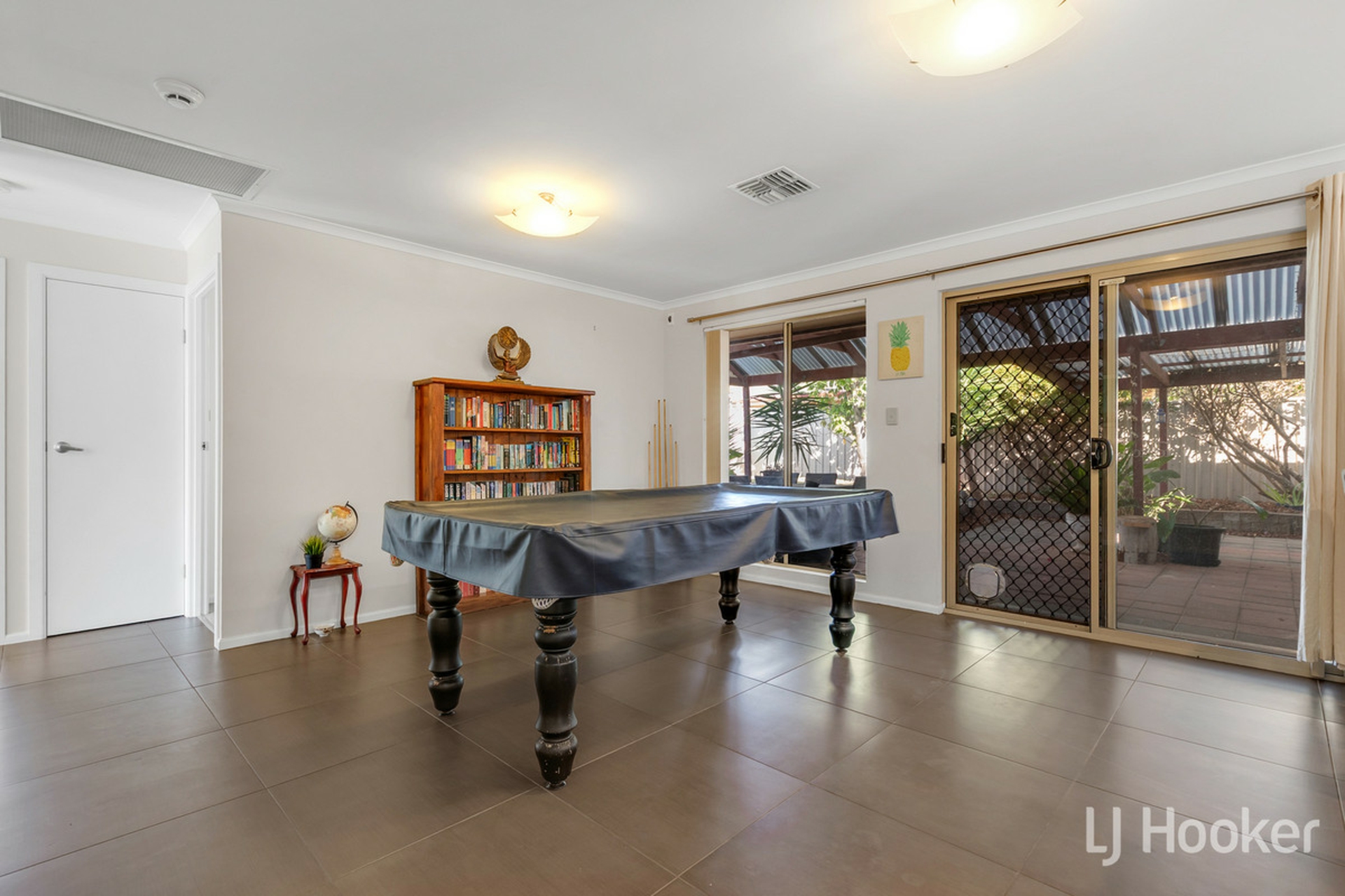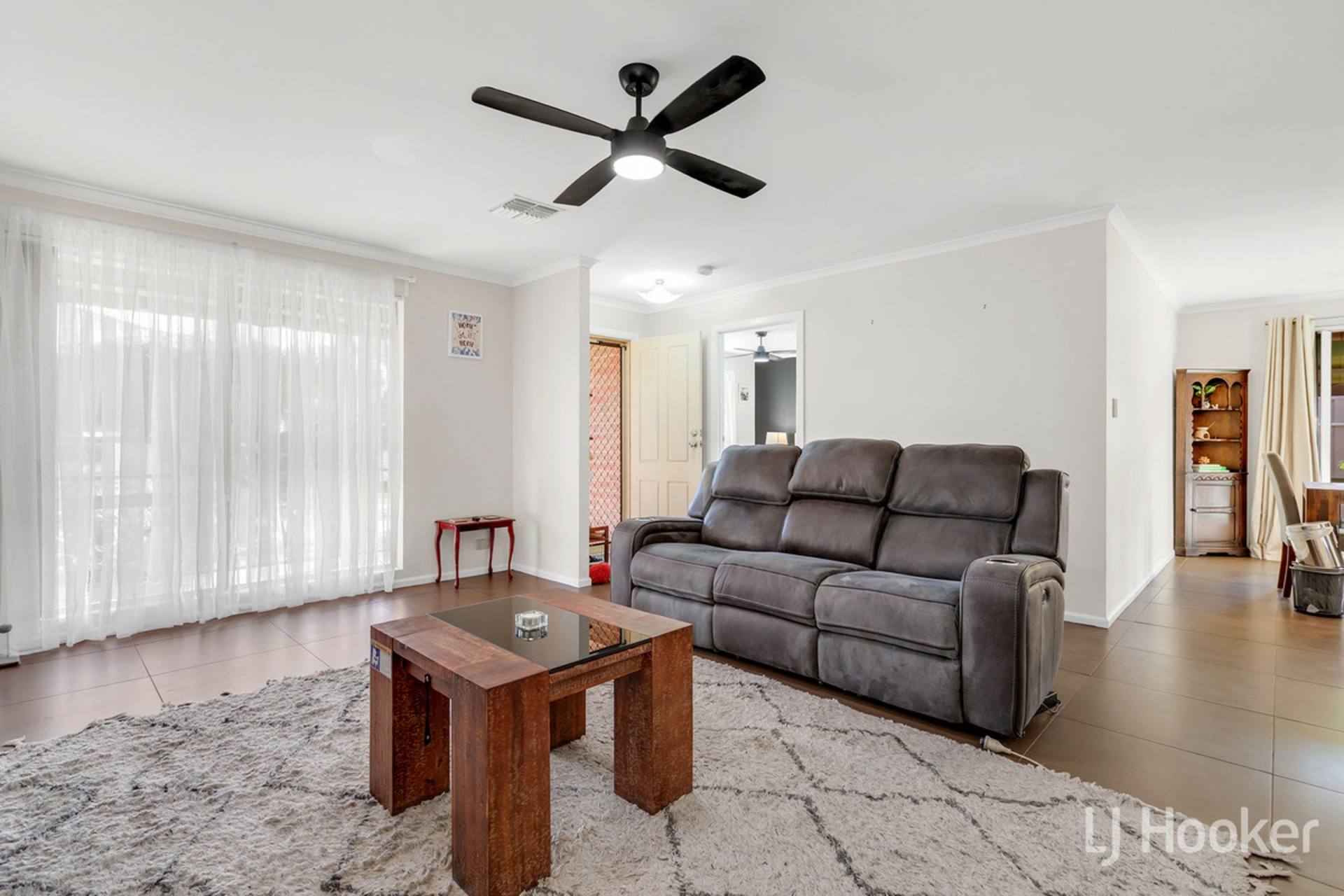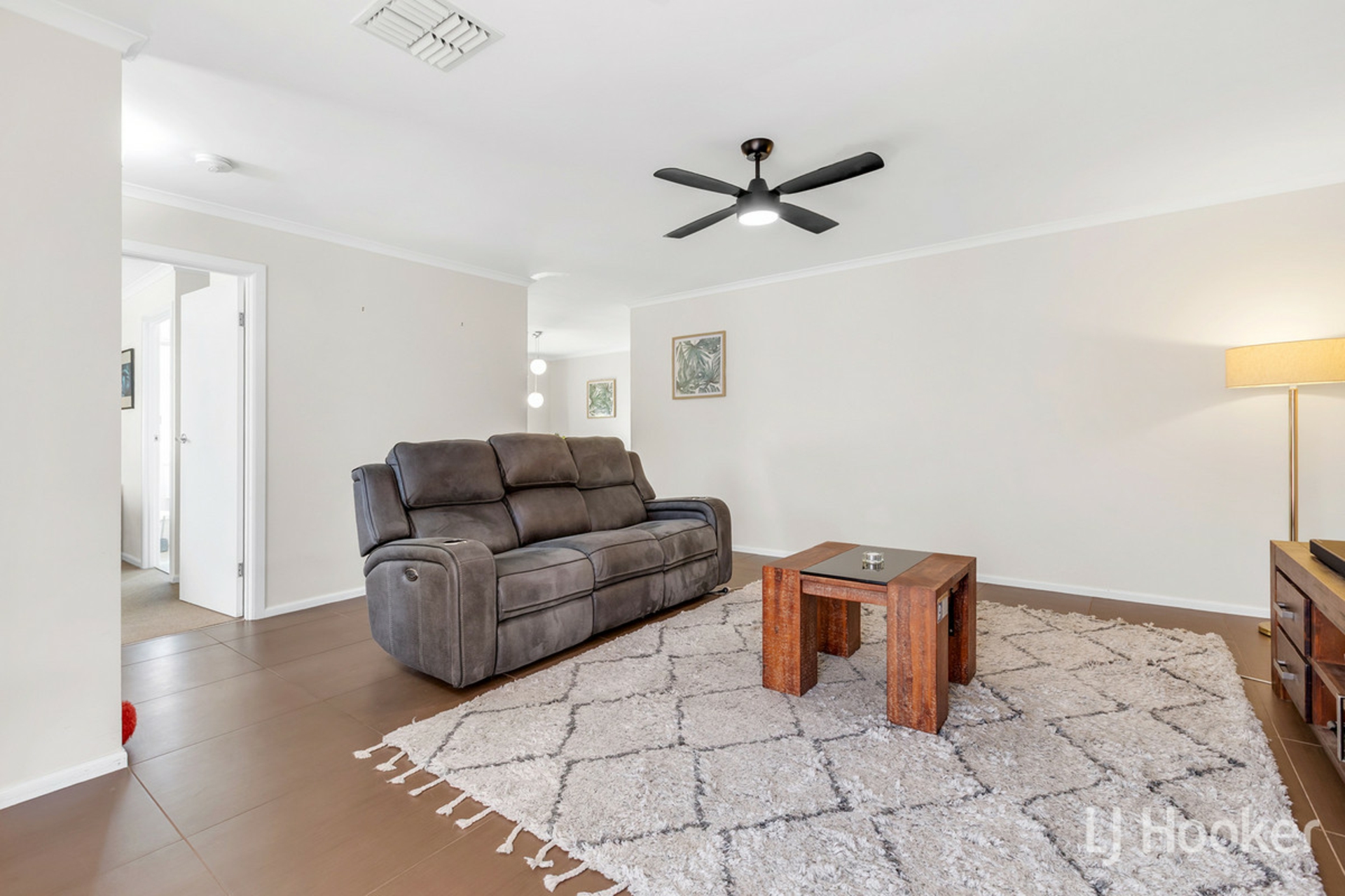 Stepping inside, your feet will find dependable large floor tiles, which run from front to back. The master to the left is complimented by a beautiful bay window, and striking black ceiling fan, not to mention a neat ensuite with tiled in window frame. The first living space to the right also features the same fan, as well as reverse cycle air conditioning, with outlets dotted throughout the home.