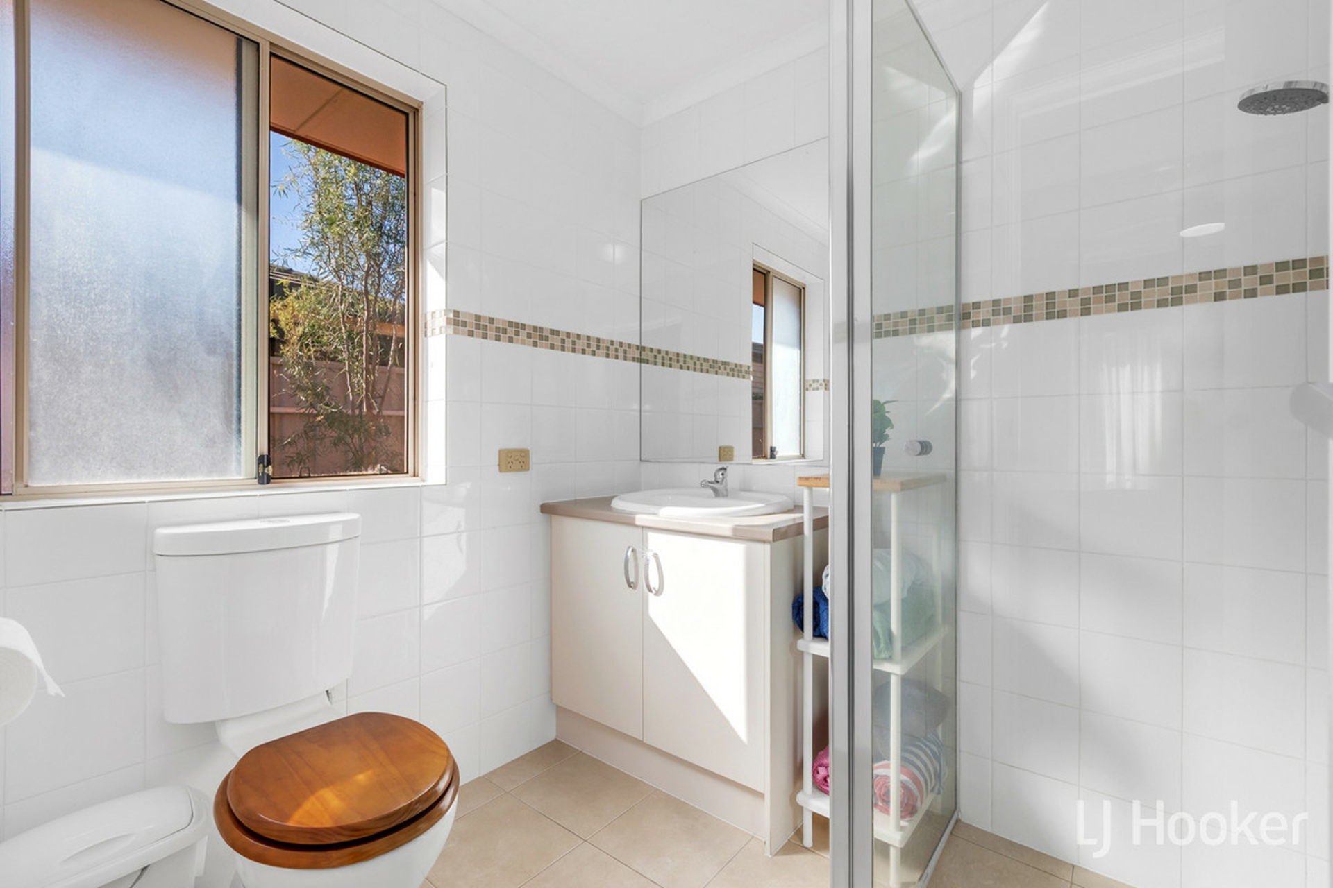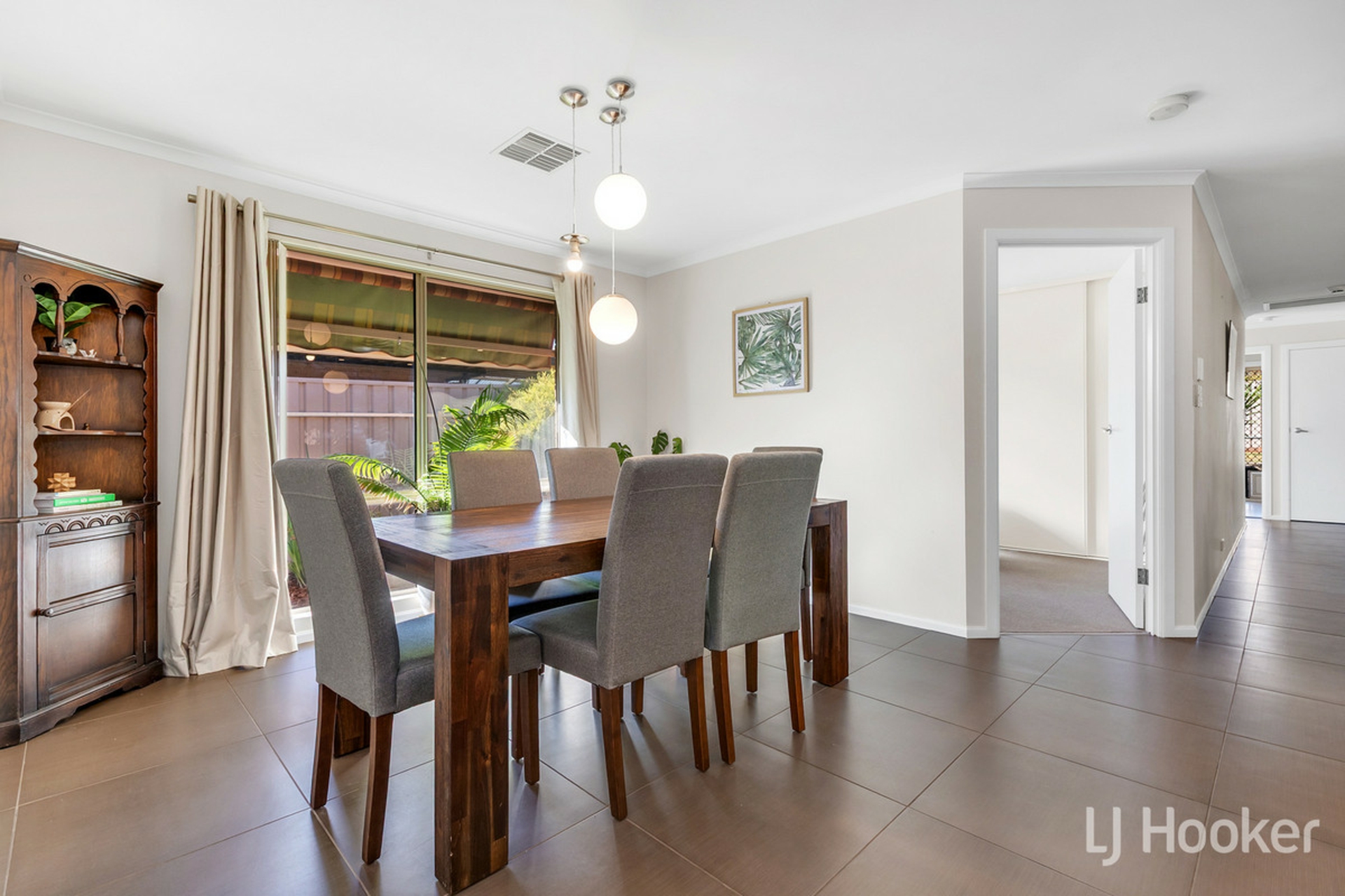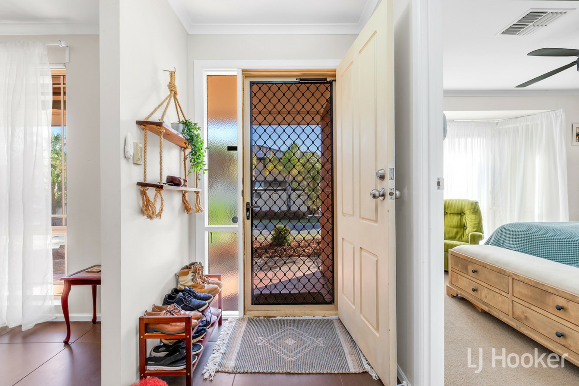 Stepping inside, your feet will find dependable large floor tiles, which run from front to back. The master to the left is complimented by a beautiful bay window, and striking black ceiling fan, not to mention a neat ensuite with tiled in window frame. The first living space to the right also features the same fan, as well as reverse cycle air conditioning, with outlets dotted throughout the home.