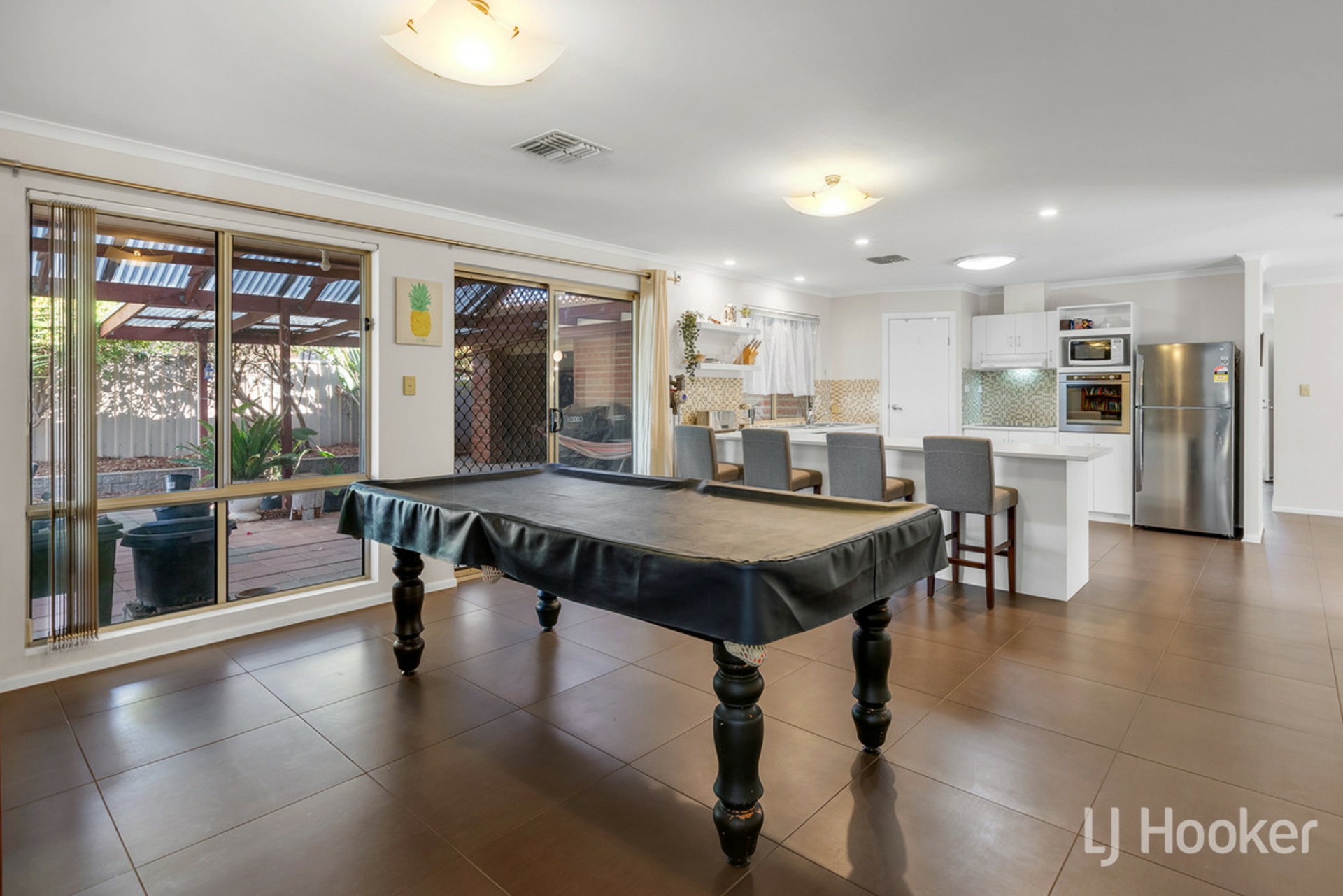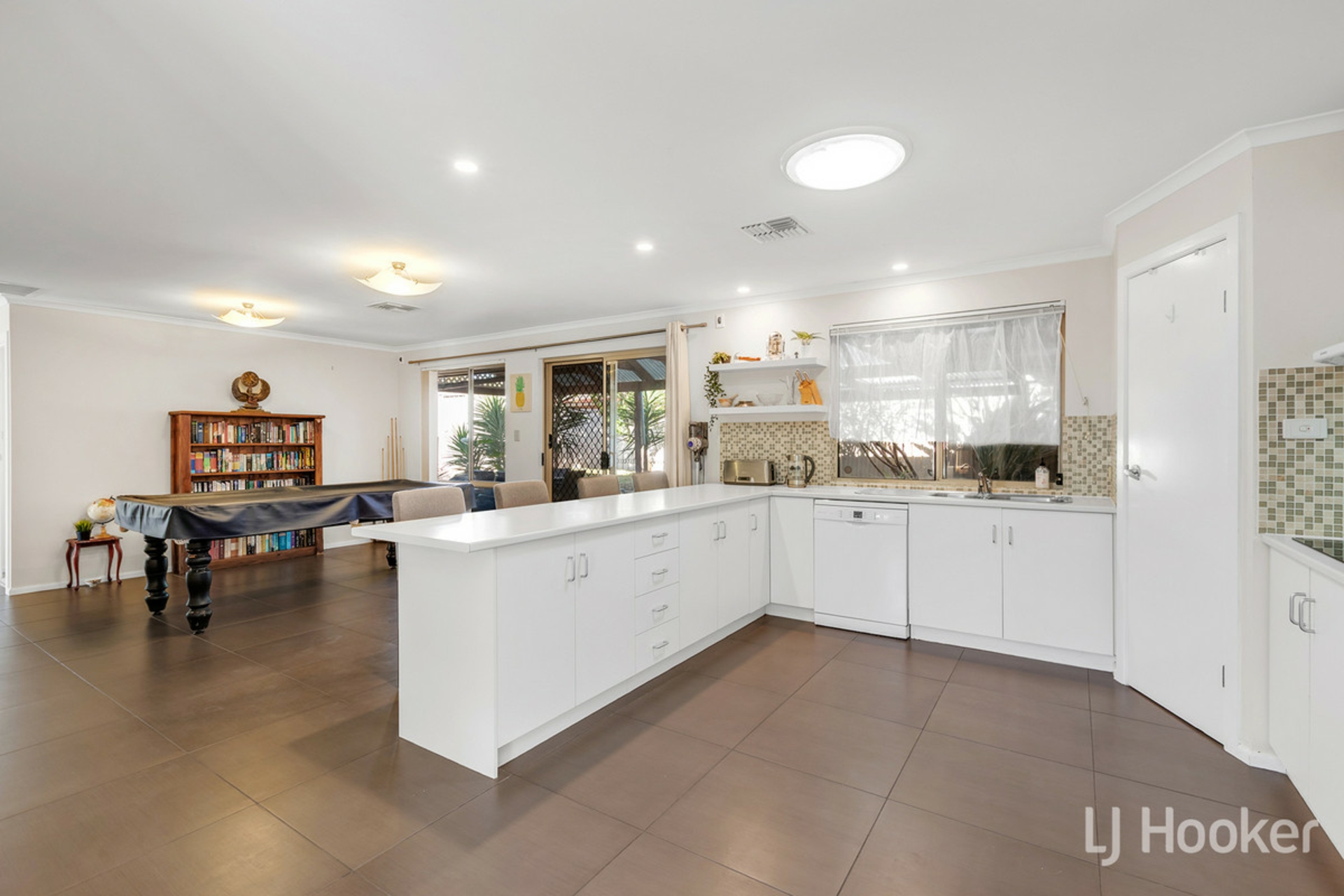 Moving into the centre of the home, you'll see an open plan space, featuring kitchen, dine, and second living. Charming pendants adorn the dining area, downlights highlight the kitchen bench, and a skylight brings some of that daylight indoors. The kitchen itself is more than functional, with wall oven, spacious proportions, and convenient breakfast bar if the cornflakes don't quite make it to the table in the morning.