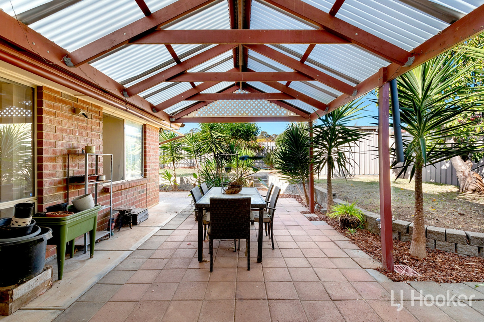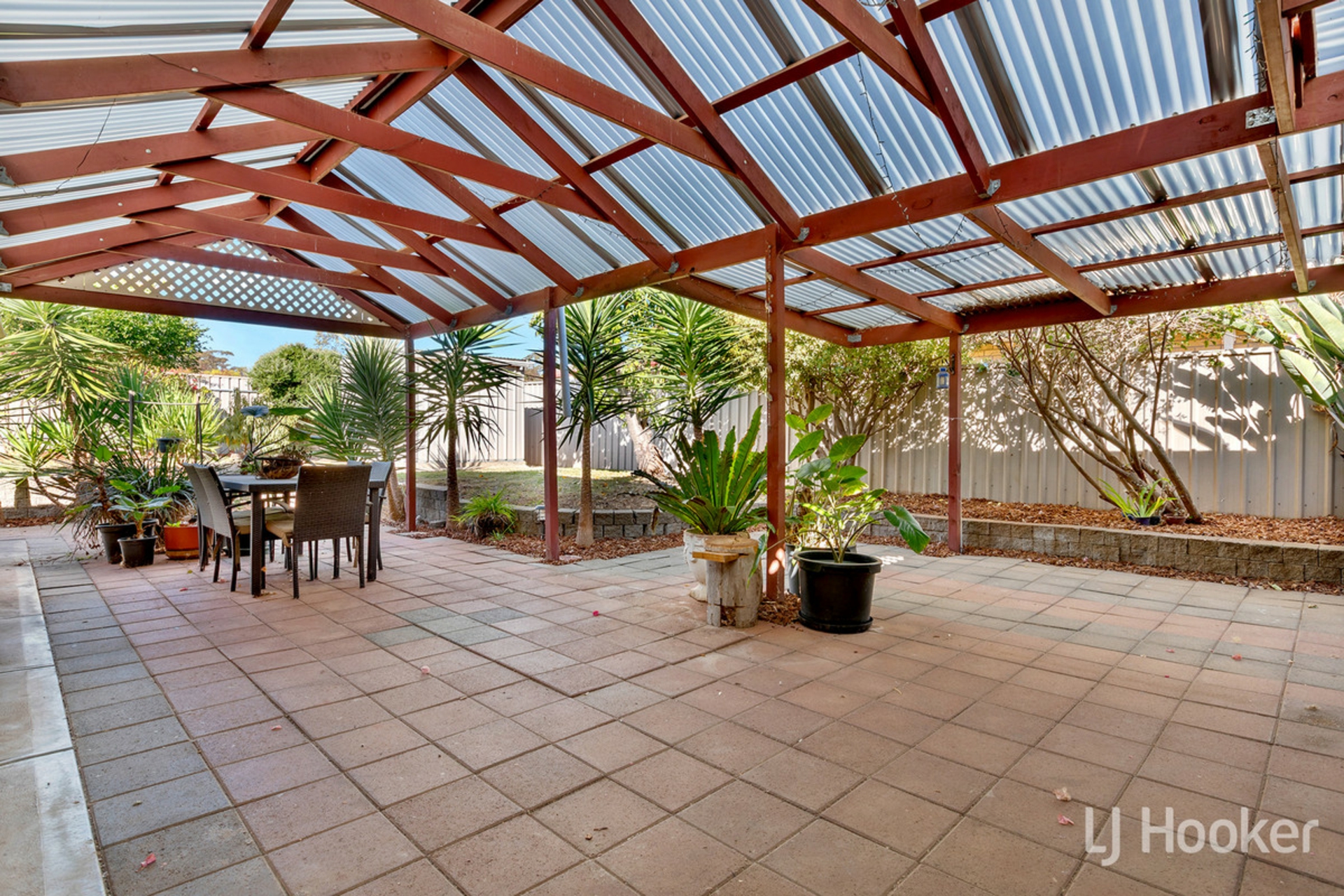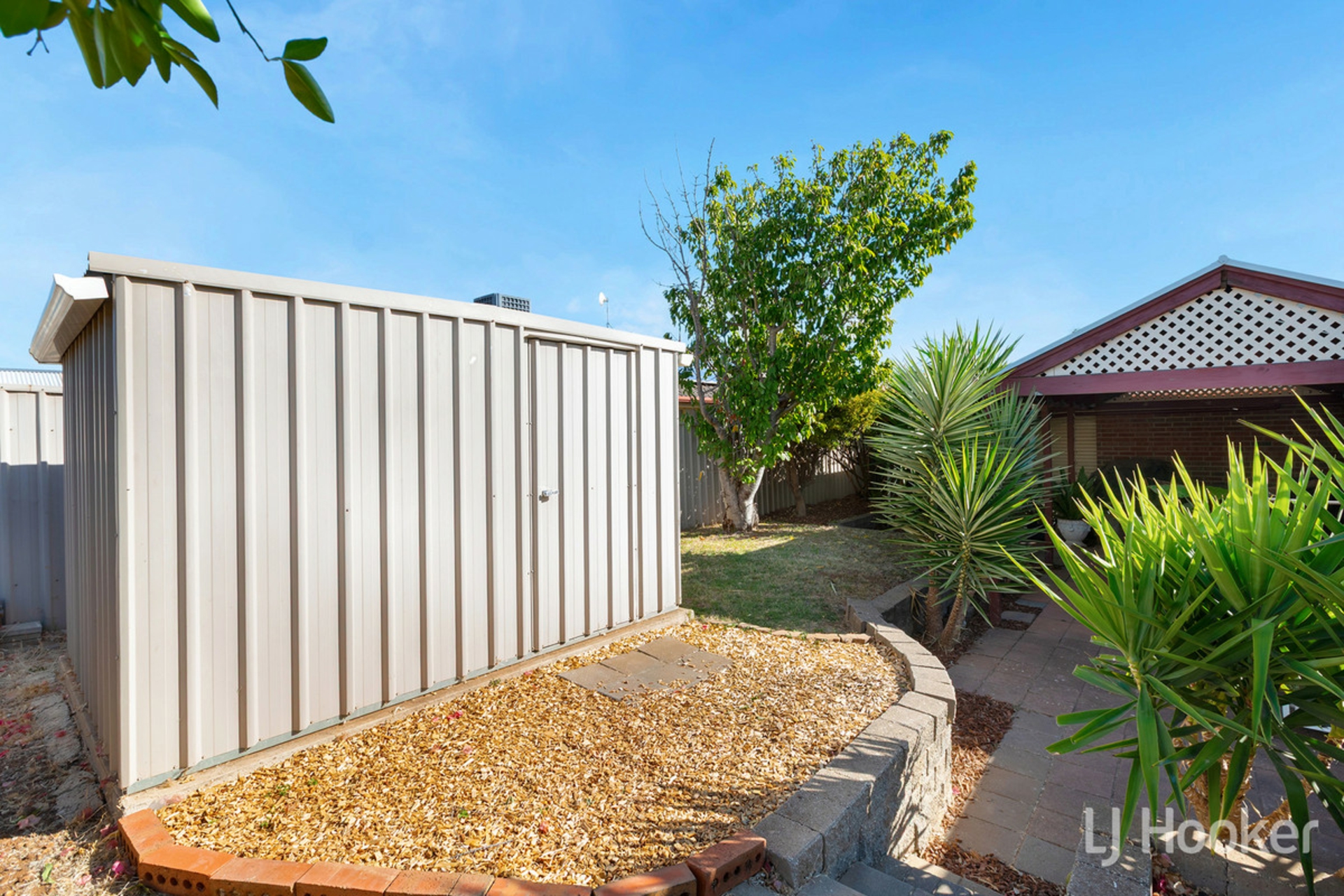 Each of the remaining three bedrooms are backed by built in robes, and serviced by the second bathroom, featuring the same lighter finishes of the first. Stepping outside, is the vast undercover entertaining area, with sheeting that filters in natural light, and protects the paved area below. At the rear of the property is a raised lawn area, for the kids or canines to enjoy, as well as a garden shed for added outdoor storage.