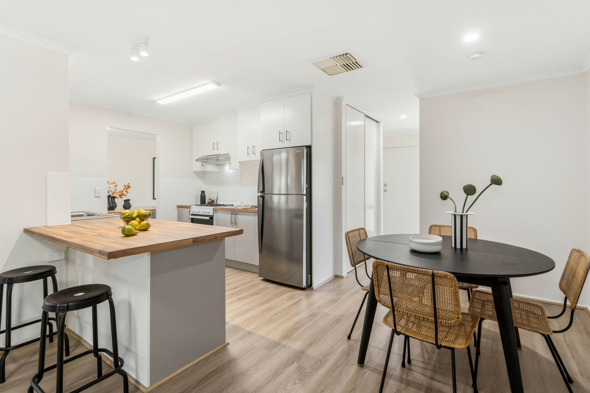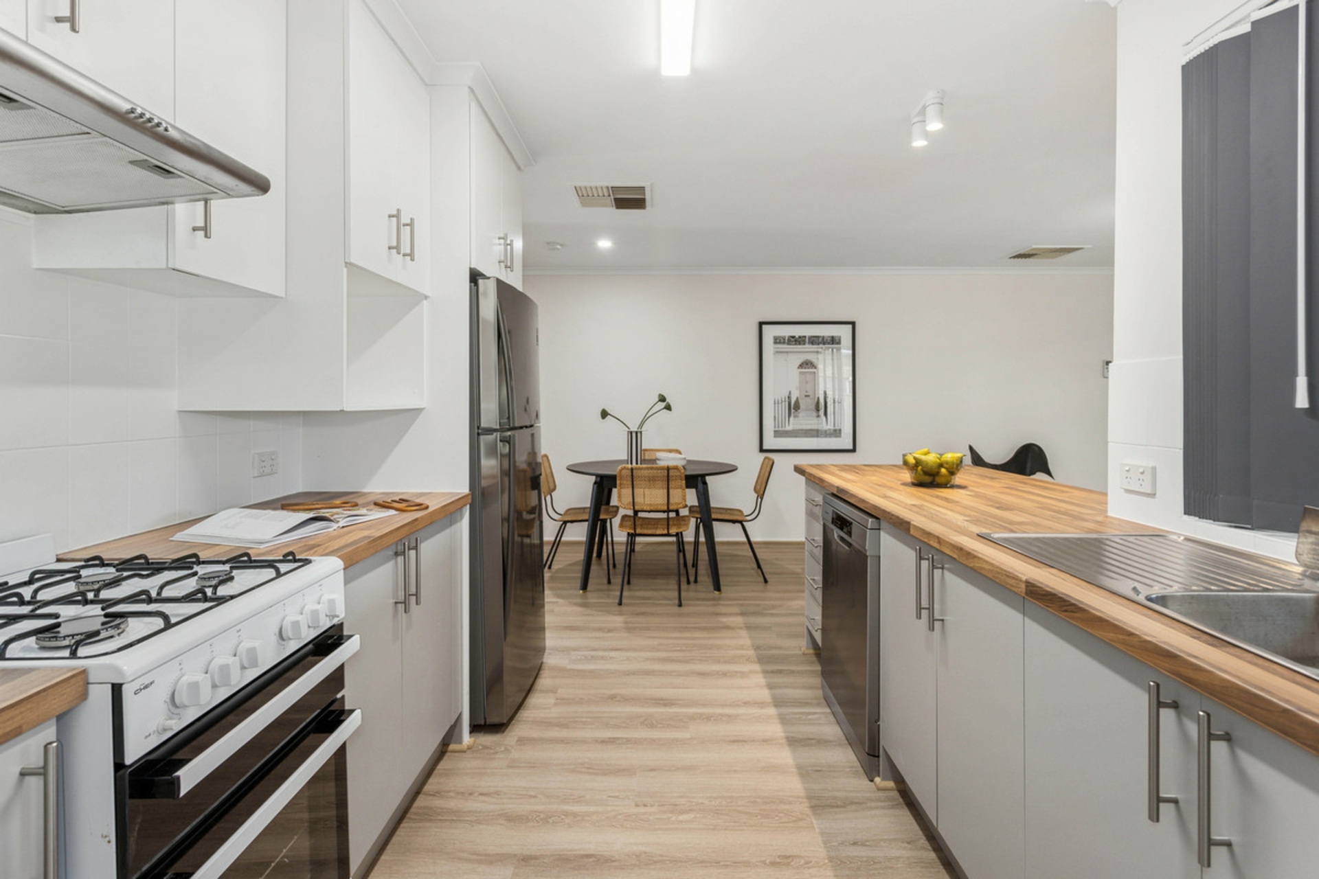 • Kitchen with gas cooktop, dishwasher, vinyl timber benchtop and built in hallway pantry