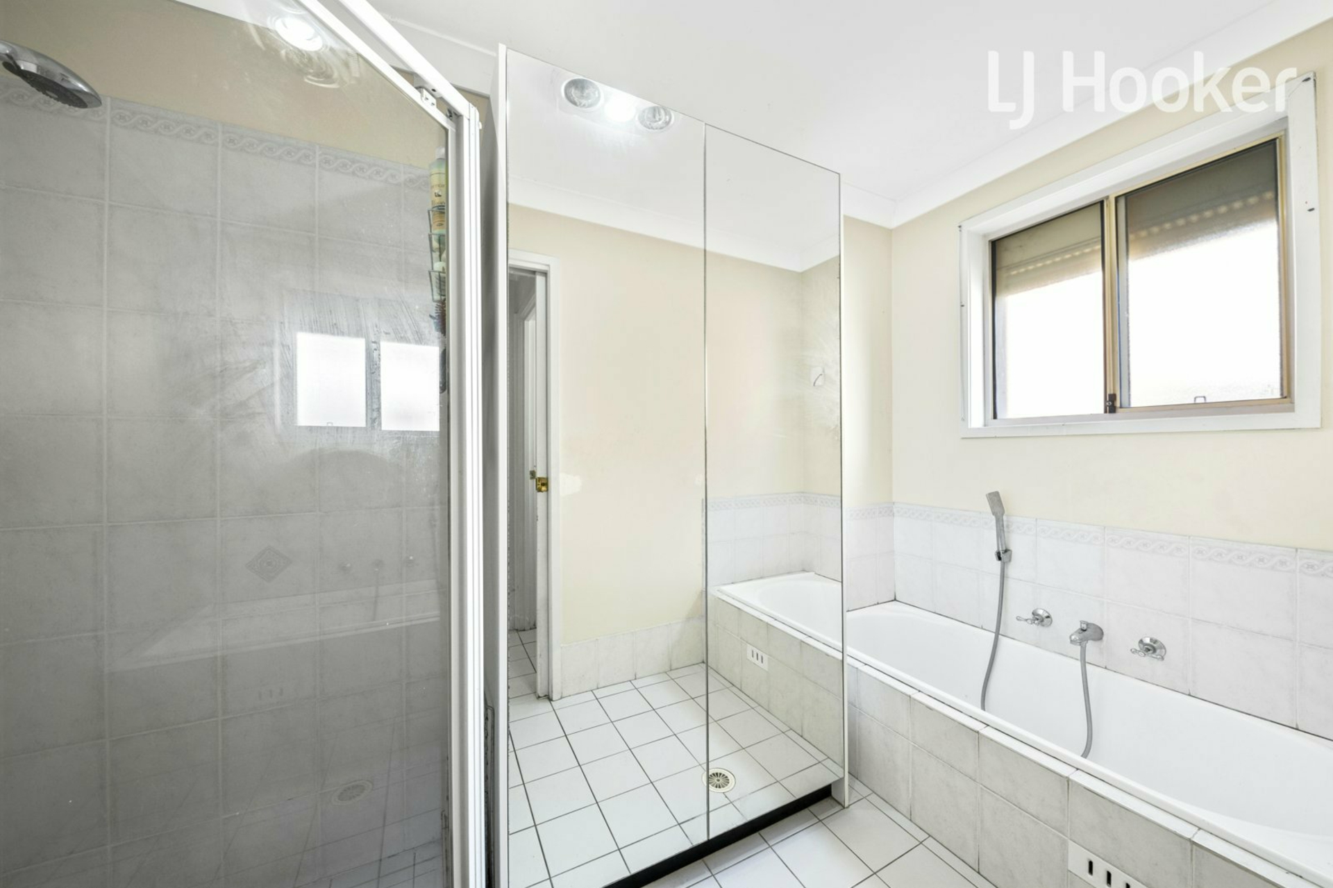 - Expansive fully tiled main bathroom with glass shower and bath.