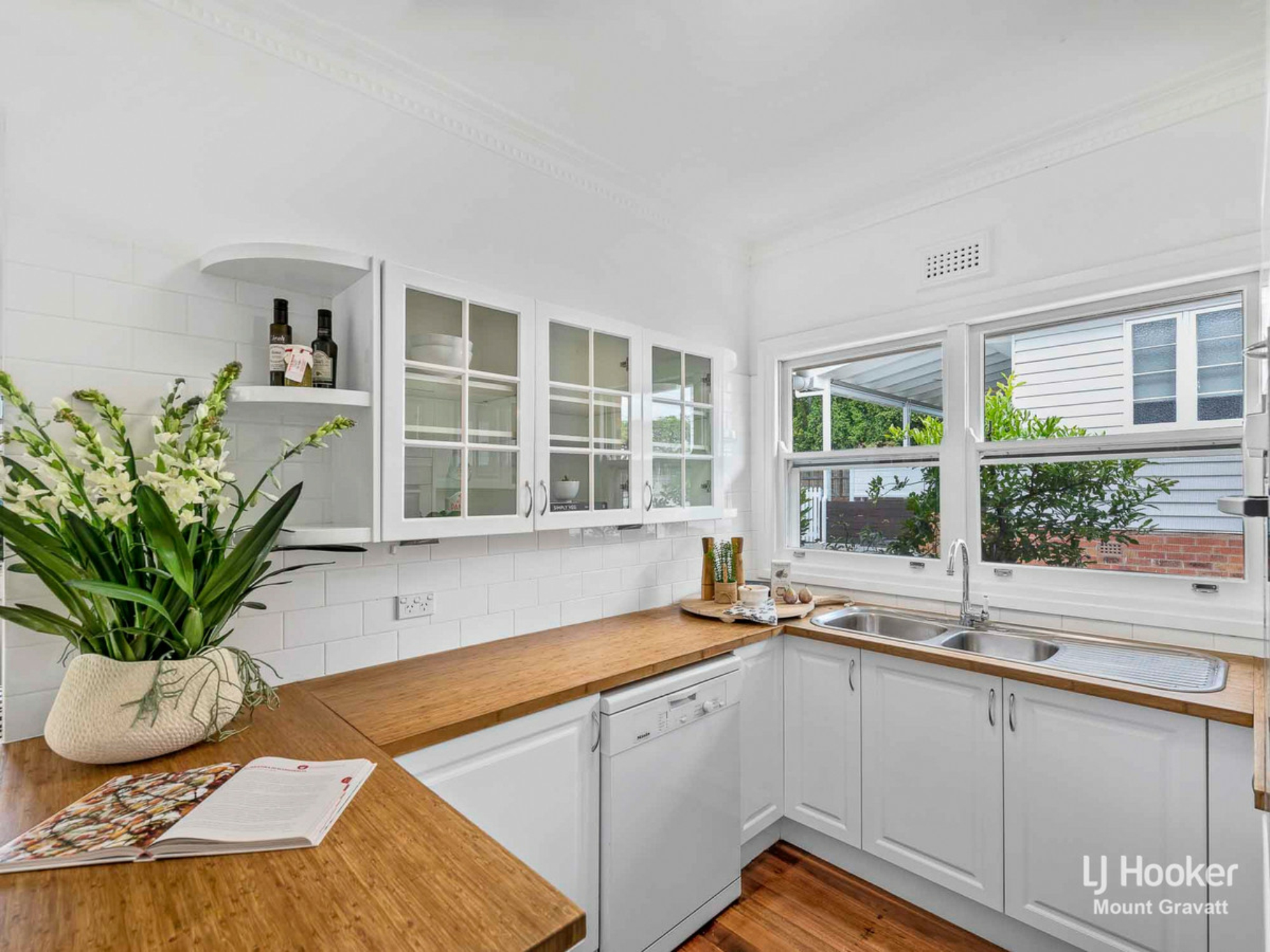 Next door is the newly renovated kitchen which boasts direct access to the dining area. Radiant and stylish, it's been adorned with timber countertops, trendy white cabinetry with mullioned window features, a dishwasher, subway-tile splashbacks, and plenty of sunlight from large windows above the sink. This contemporary kitchen is modern enough for the needs of a 21st century family but still matches the charming aesthetic of this character home.