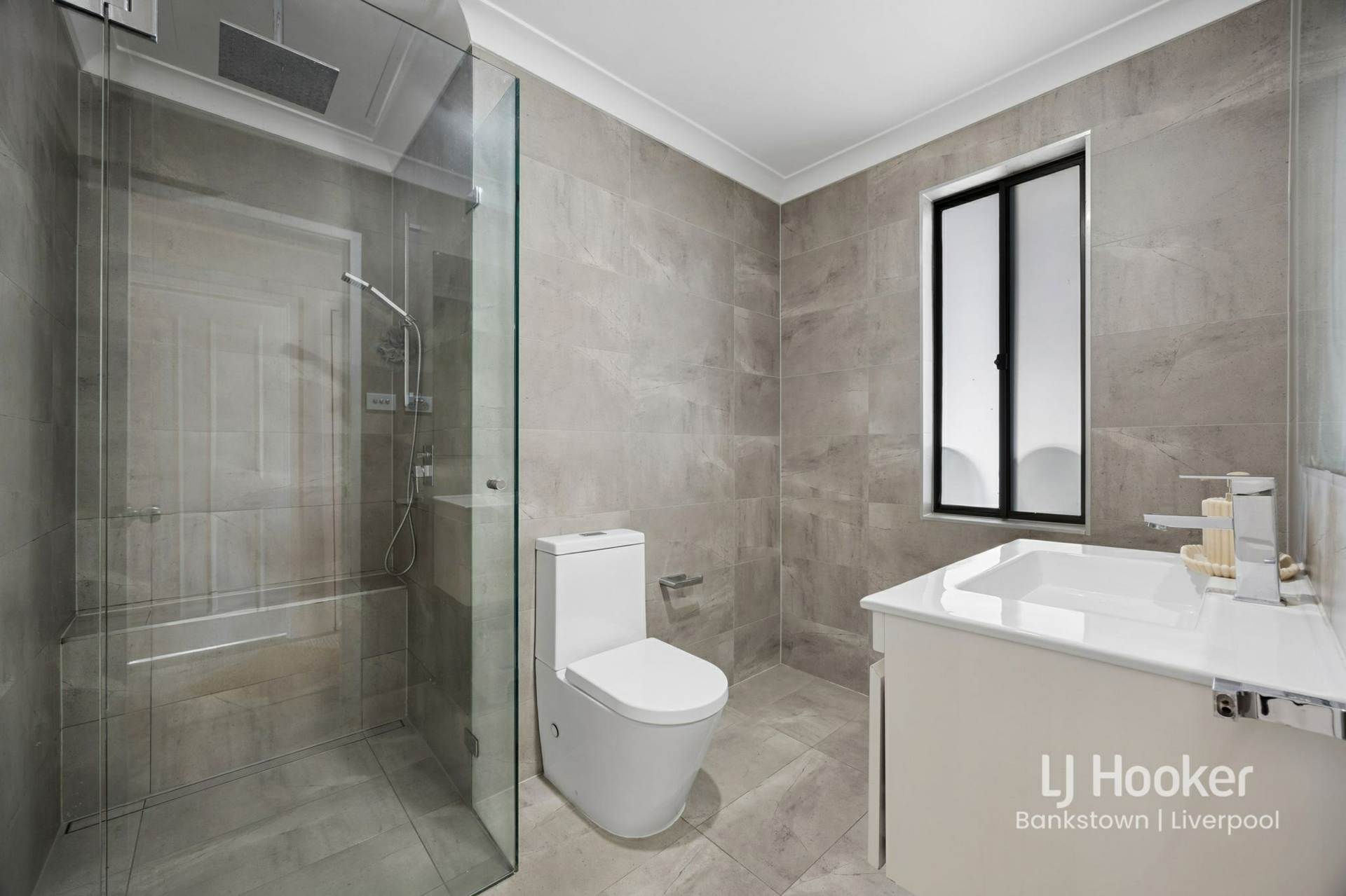- Modern bathroom with floor-to-ceiling tiles