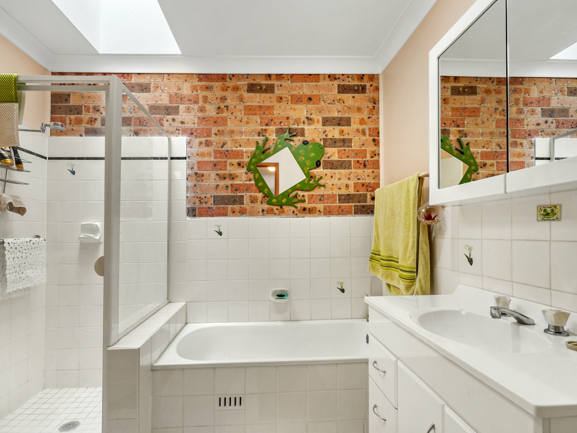 A big bathroom with a skylight.