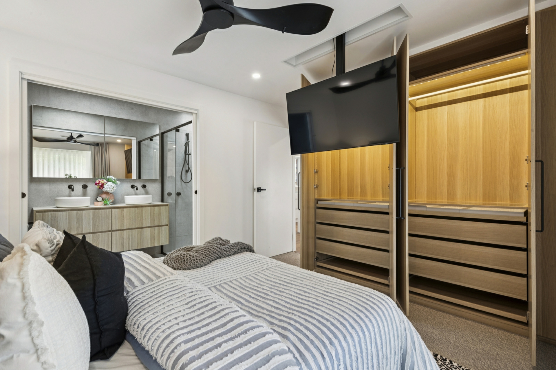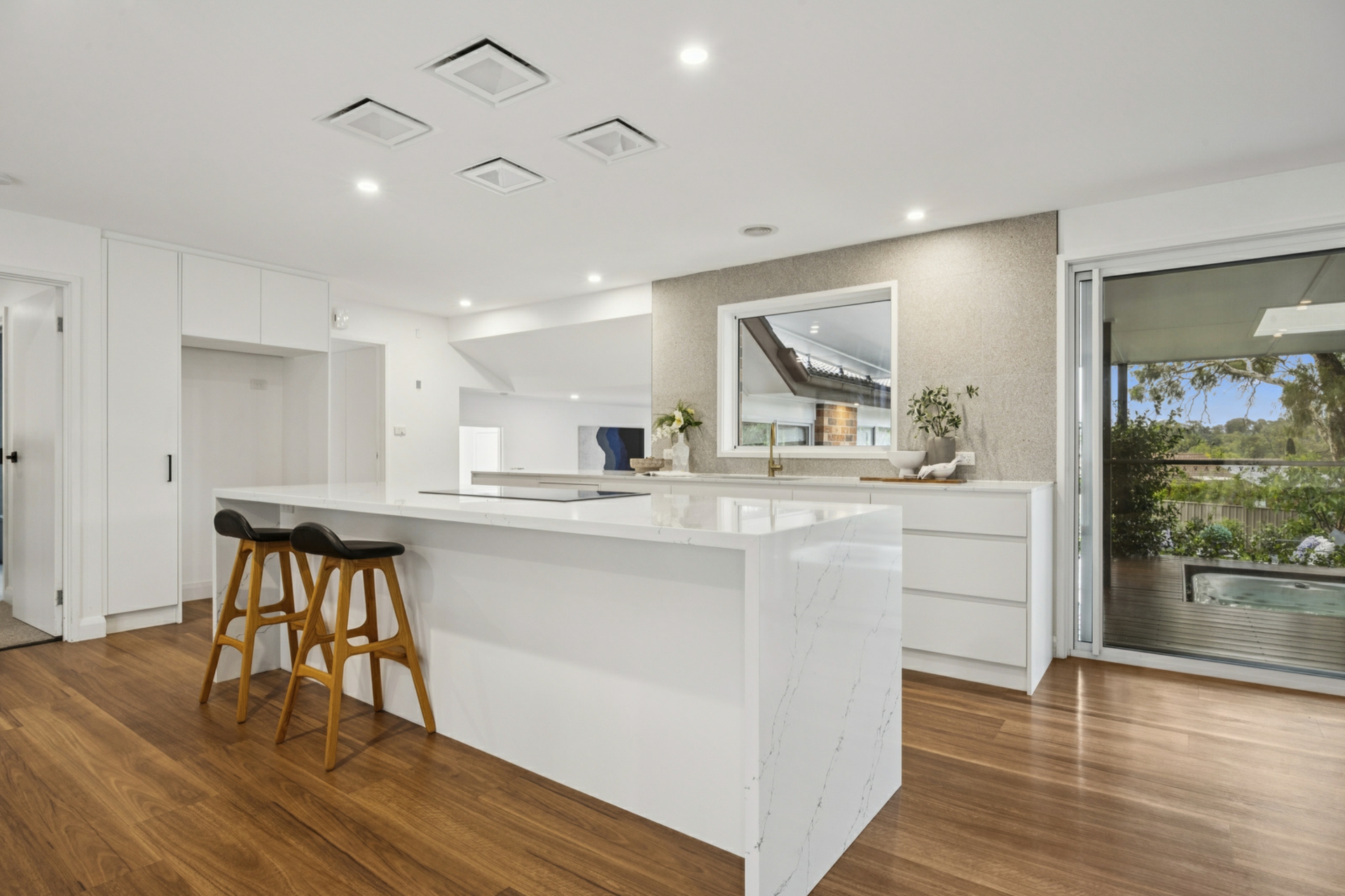 • Designer kitchen with waterfall stone island & butler's pantry, 900mm oven & cooktop, silent in ceiling range hood, dishwasher & extensive storage