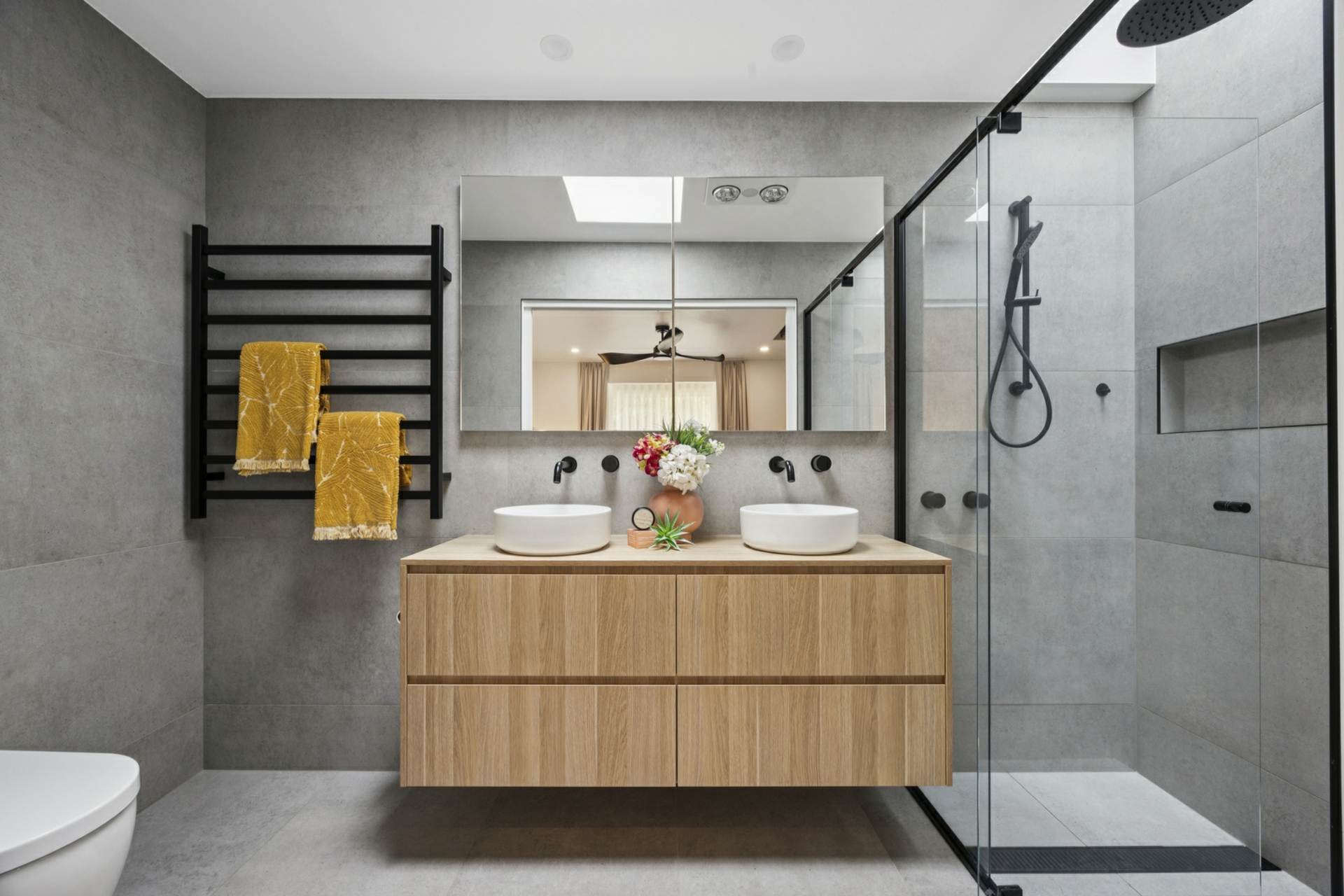 The main suite is a true retreat, complete with built-in robes with custom storage & lighting, ceiling fan, bay window overlooking the beautiful front courtyard and gardens plus a ceiling-mounted retractable TV mechanism for streamlined living. The beautifully renovated ensuite showcases dual vanities, skylights and heated towel rails, creating a luxurious, hotel-inspired feel. Four additional bedrooms, all with built-in robes and new carpet, ensure abundant accommodation for family and guests. Three bedrooms are positioned off the rumpus room downstairs for ideal family segregation.