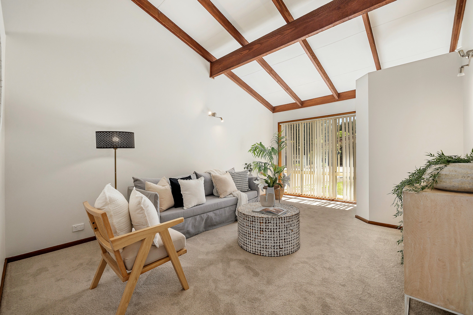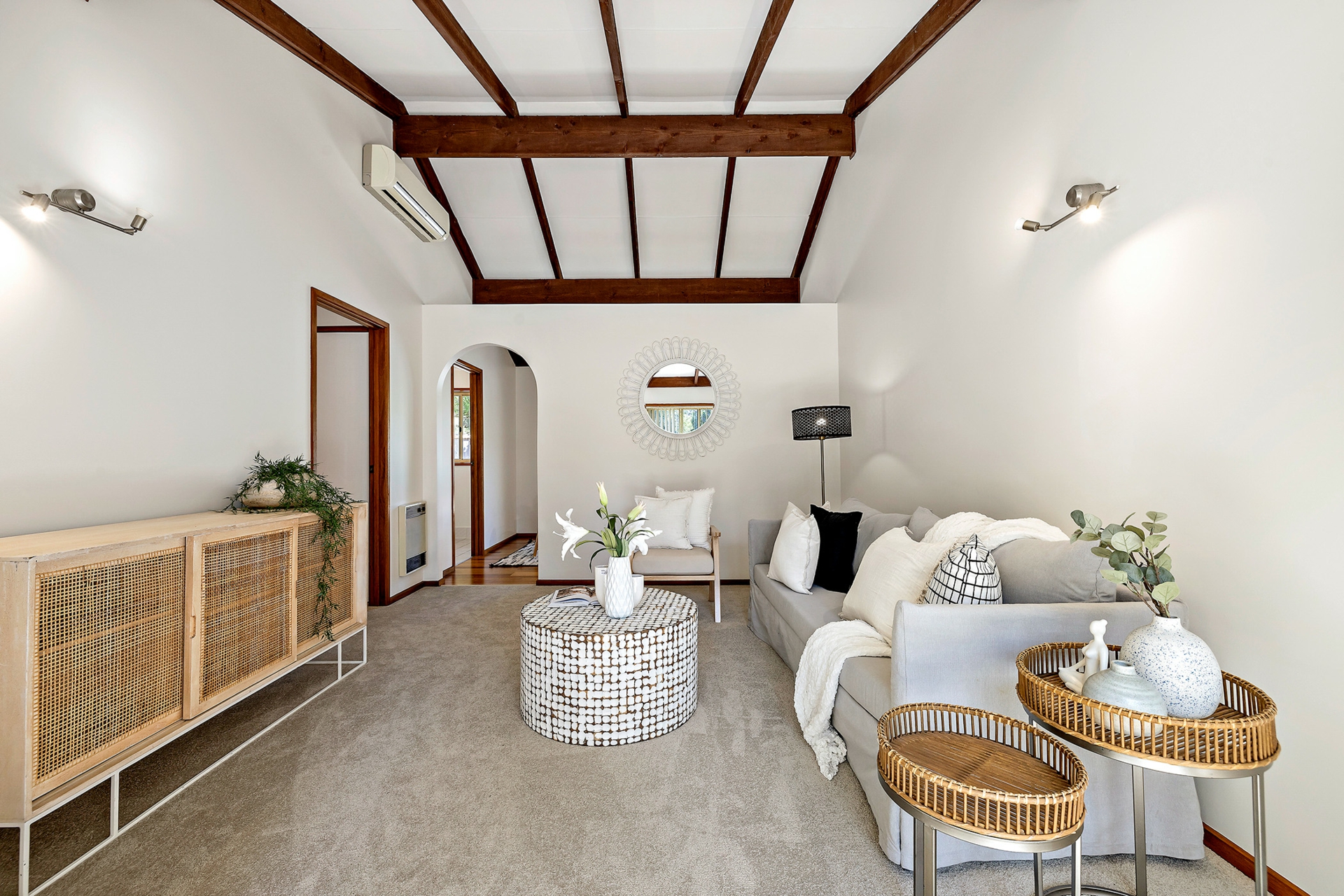 Just repainted and recarpeted, this home offers a functional layout that includes a bright living room with high ceilings and exposed beams designed to capture natural light and warmth. An additional living area sits just off the updated kitchen, providing extra space to relax or entertain.