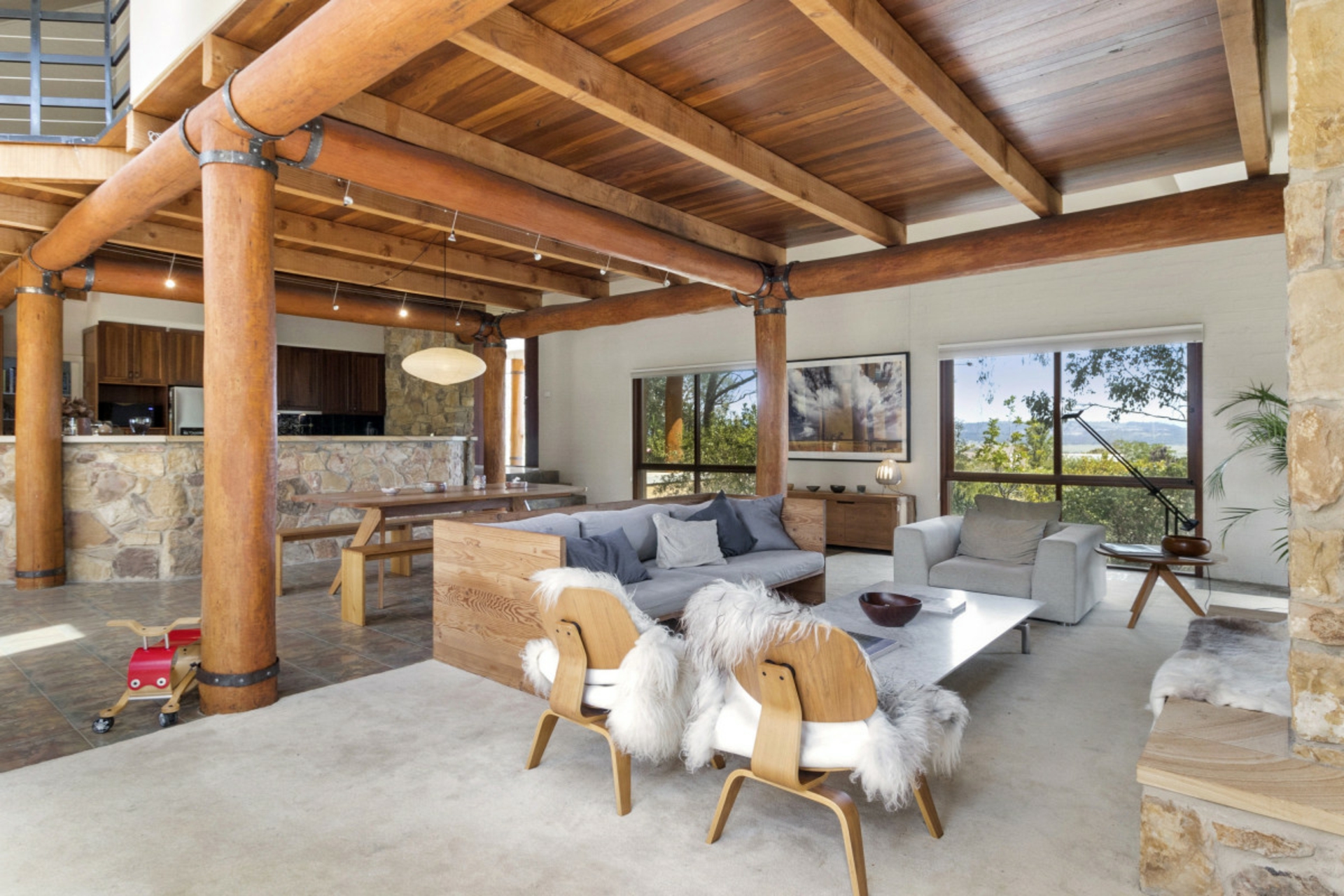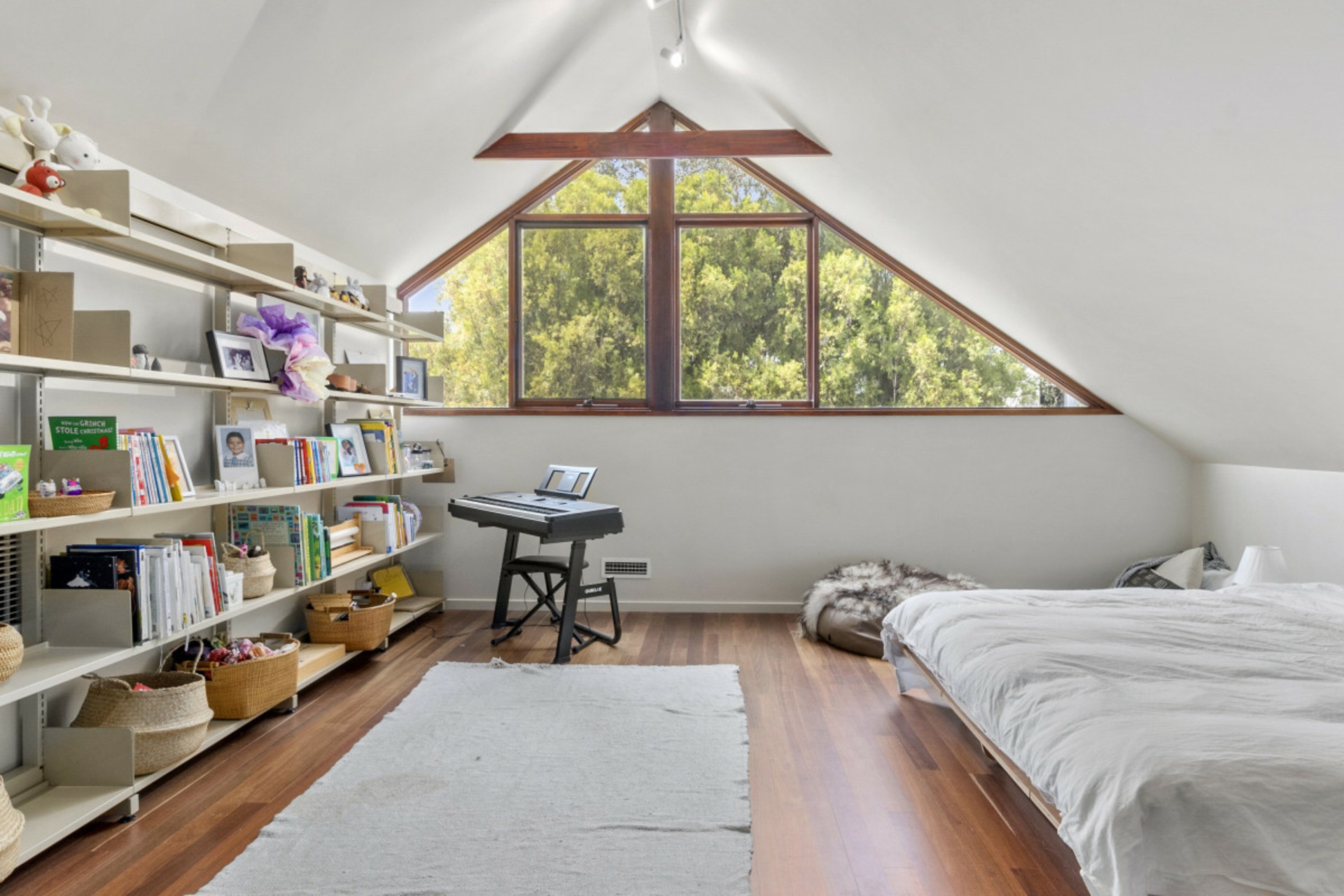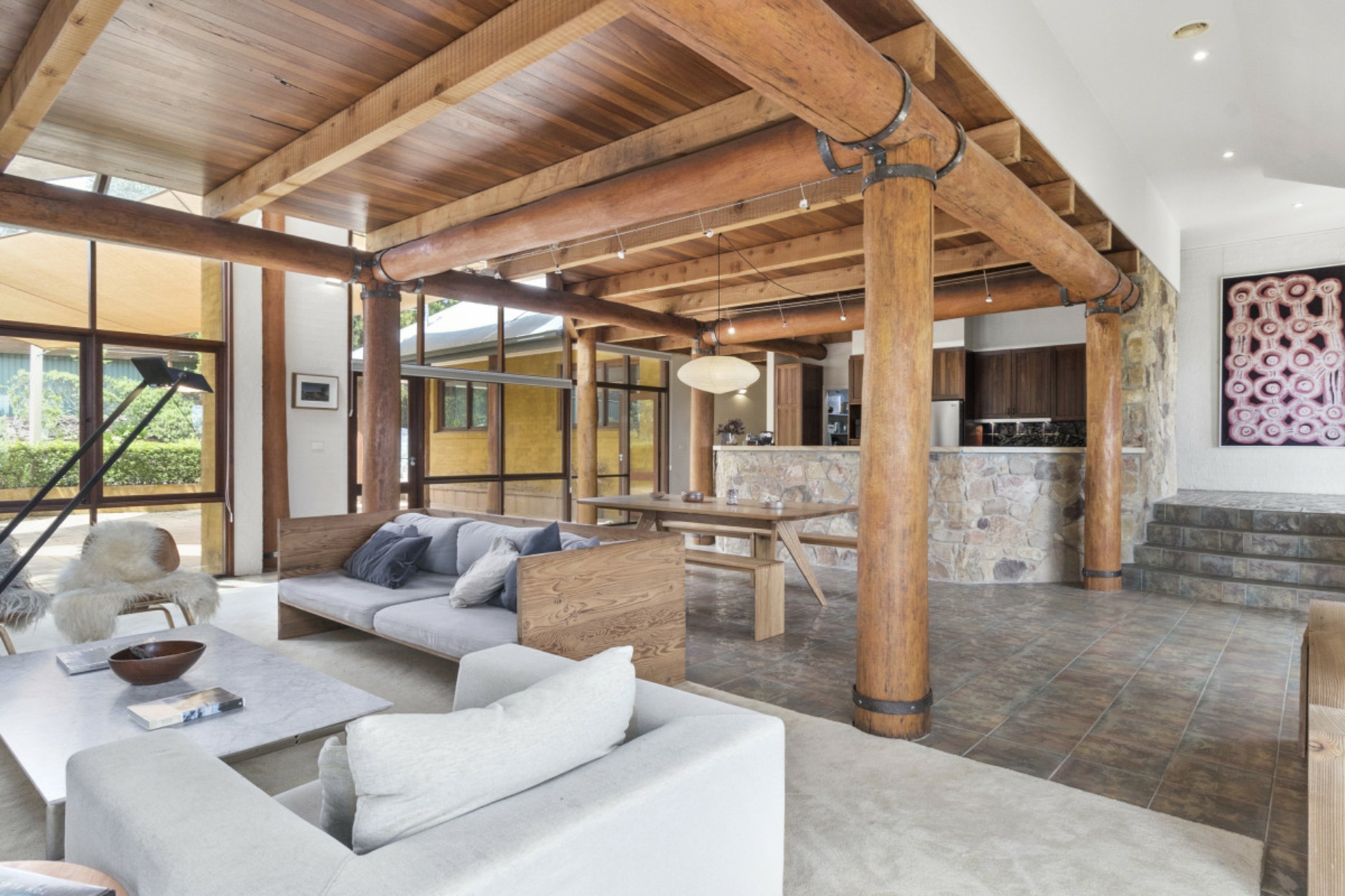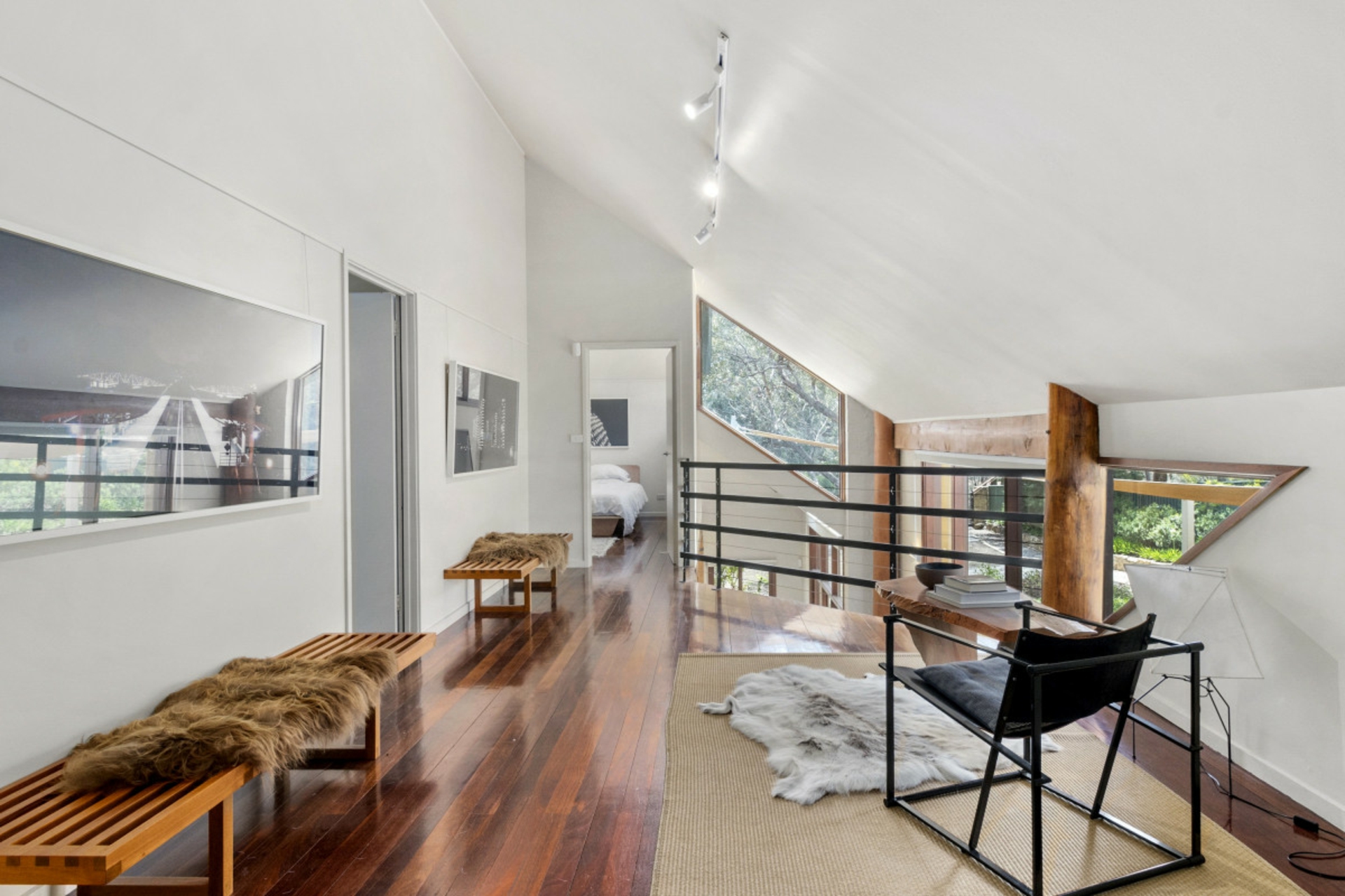 The open plan living, dining, kitchen area with its exquisite stonework and exposed timber detailing, is a wonderful space for entertaining. The upper level with its unusual angles, expansive windows and mezzanine style layout is a stunning representation of how light and space work in perfect harmony.