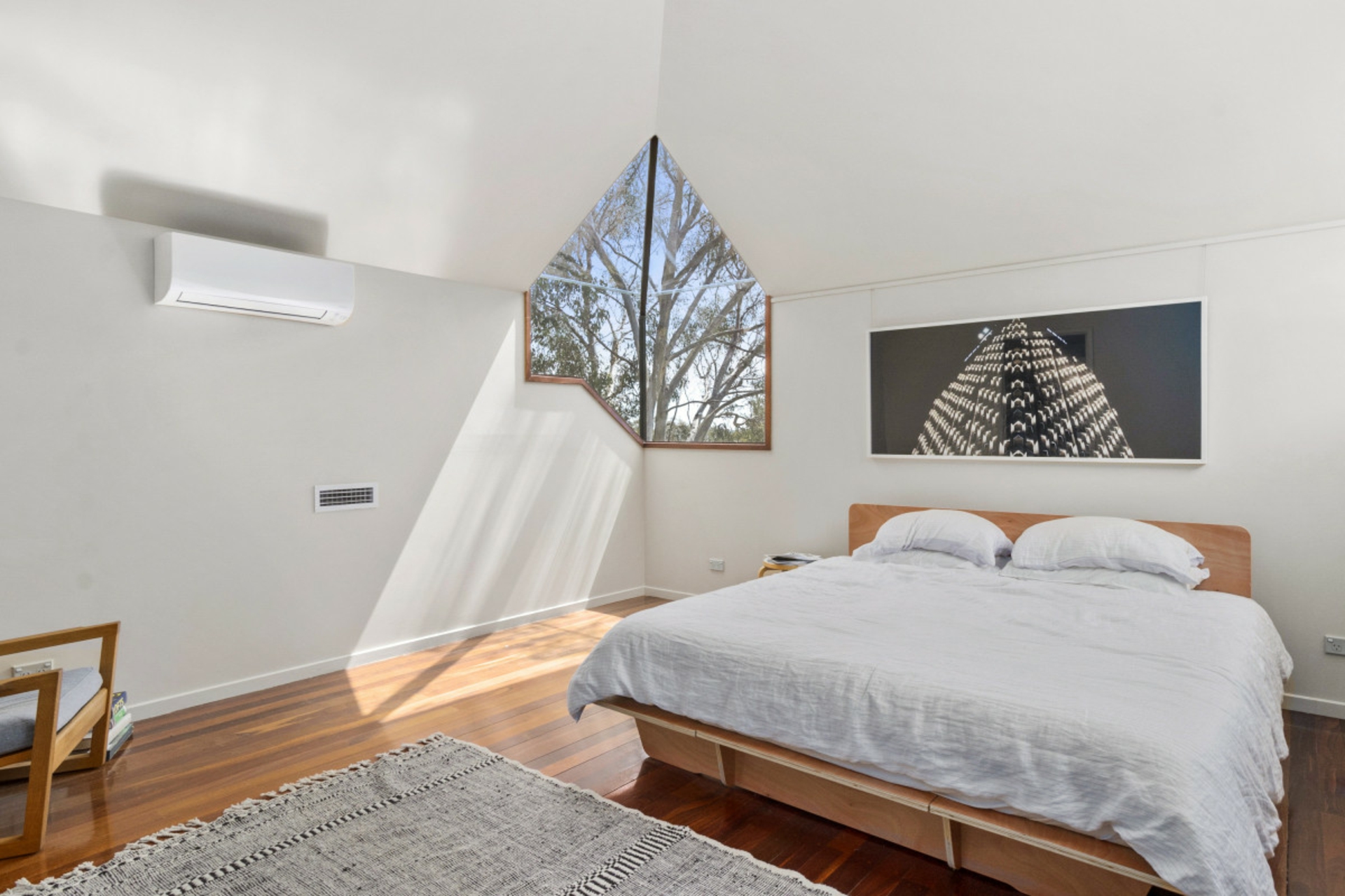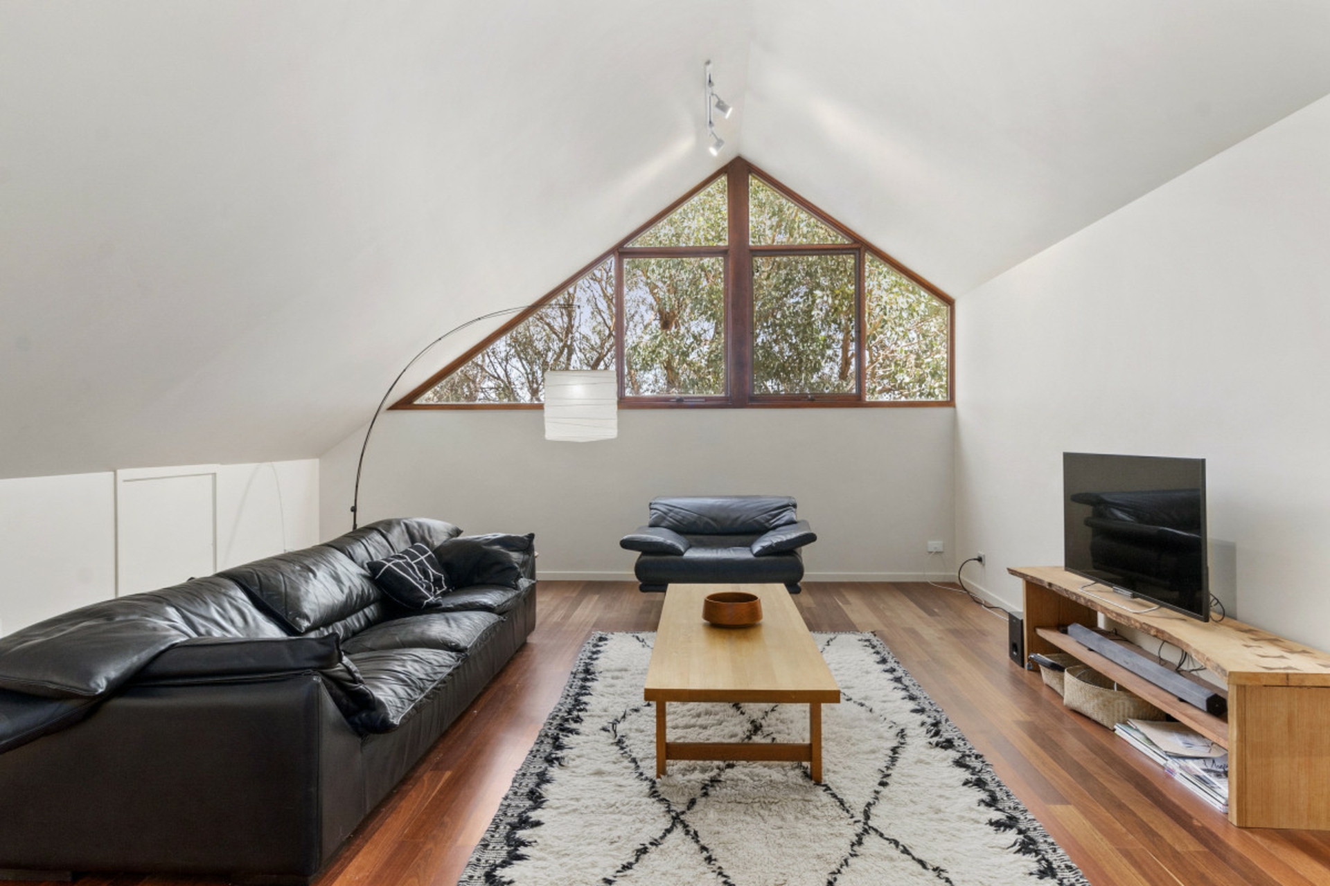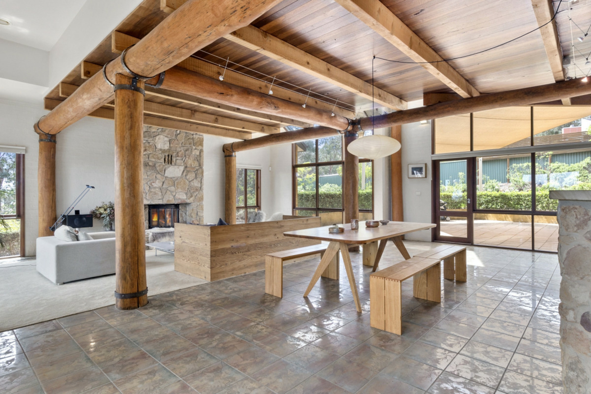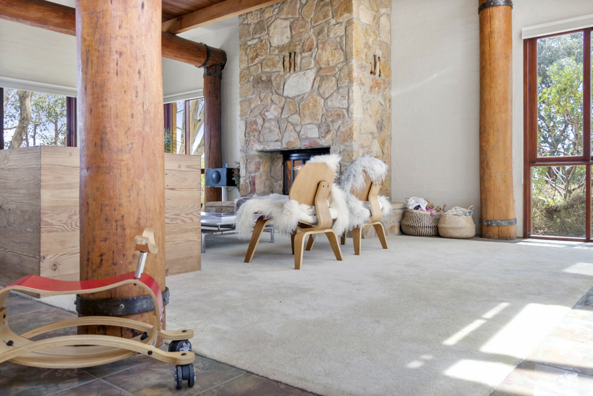 The open plan living, dining, kitchen area with its exquisite stonework and exposed timber detailing, is a wonderful space for entertaining. The upper level with its unusual angles, expansive windows and mezzanine style layout is a stunning representation of how light and space work in perfect harmony.
