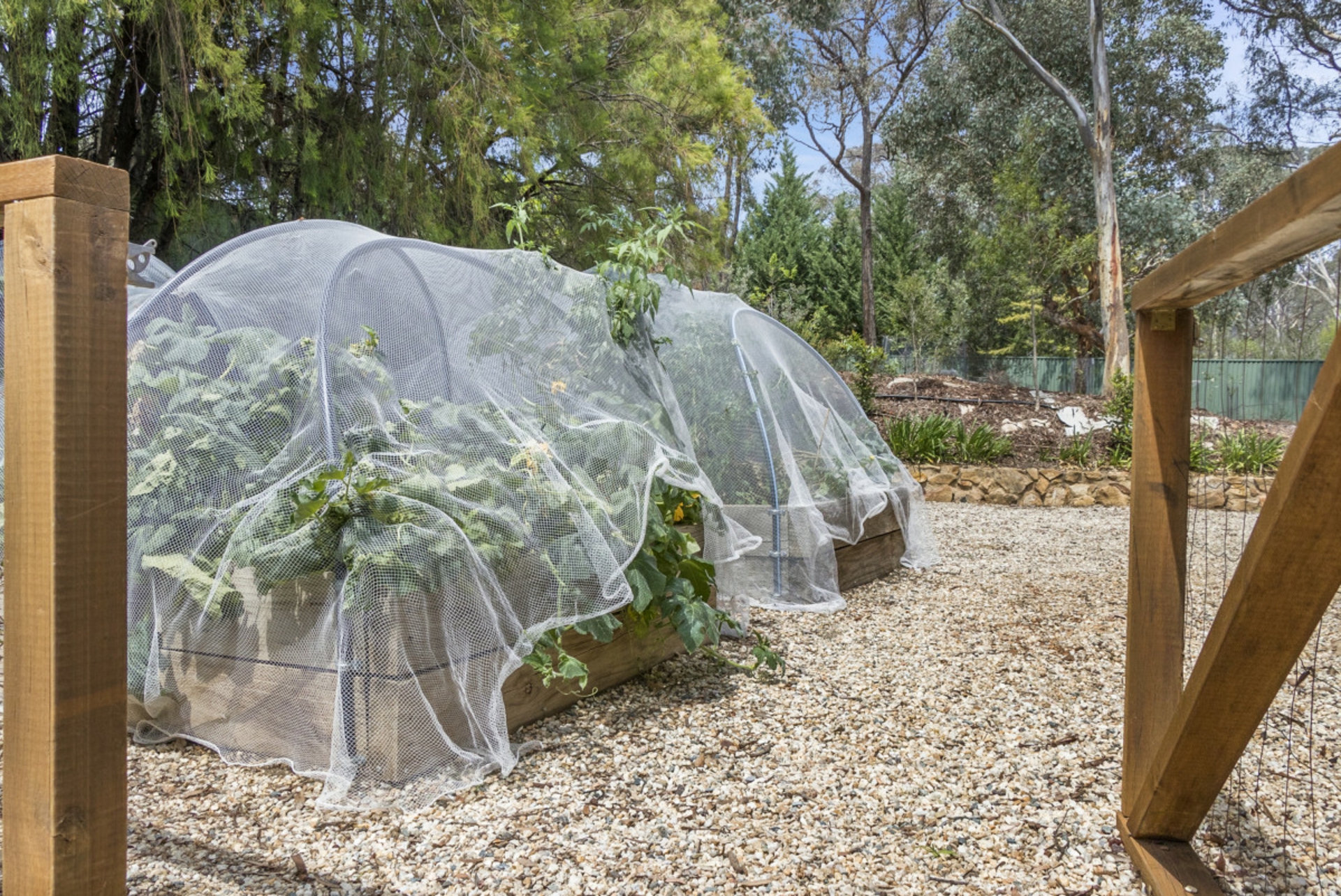 - Manicured and expansive gardens with elevated vegetable patches and diverse range of mature trees and plants