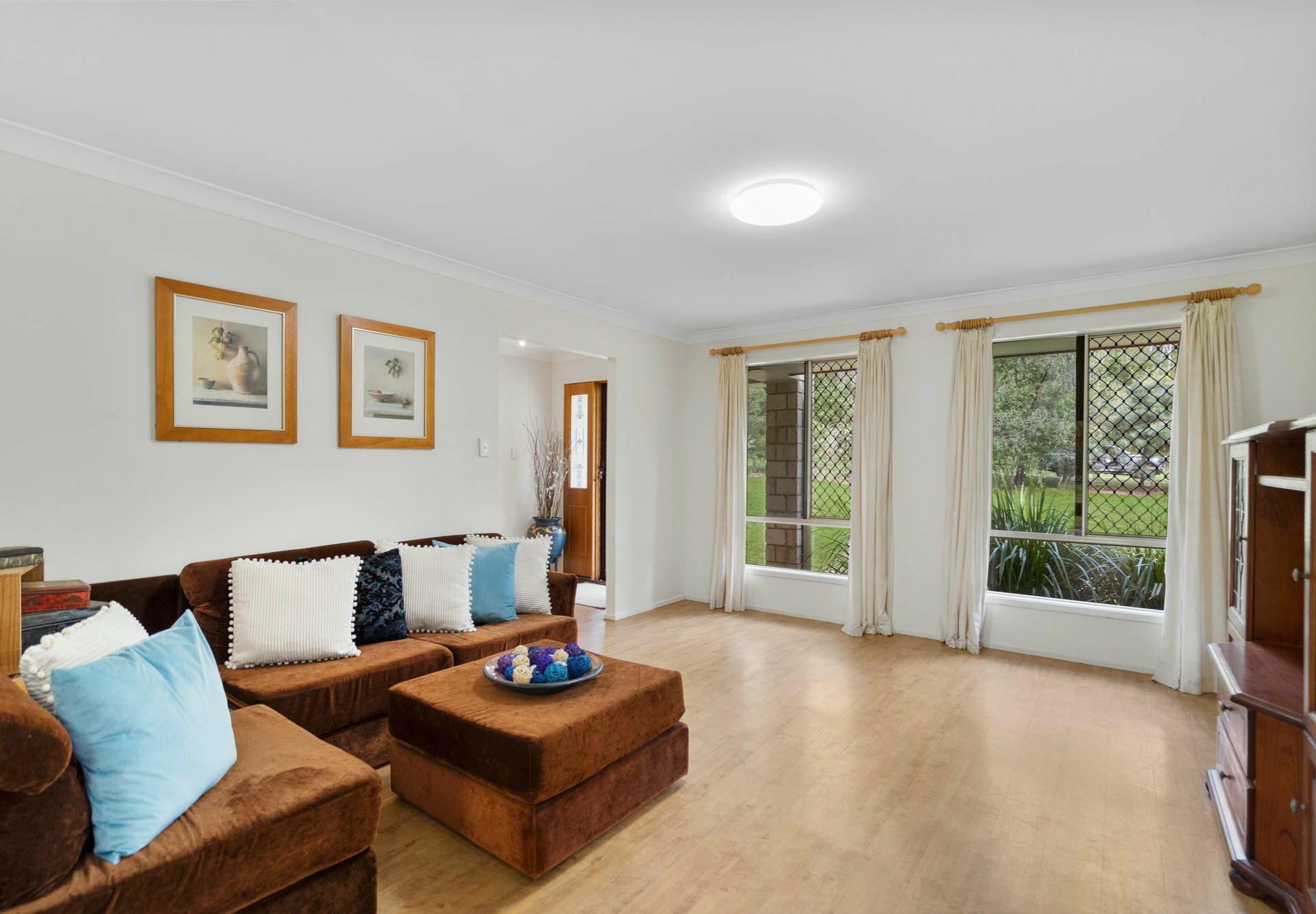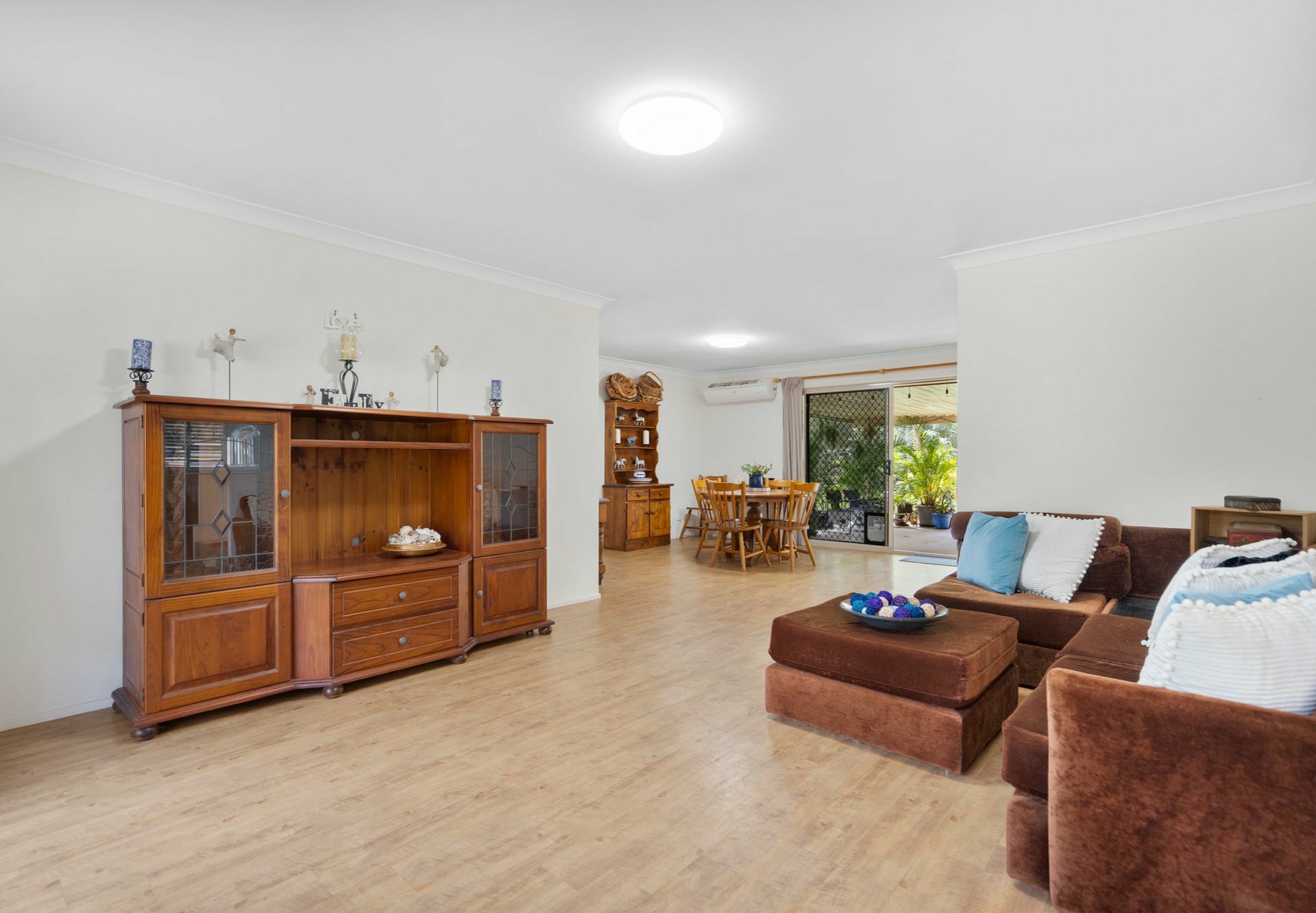 - South-facing, easy-care brick lowset with double living and dining areas
