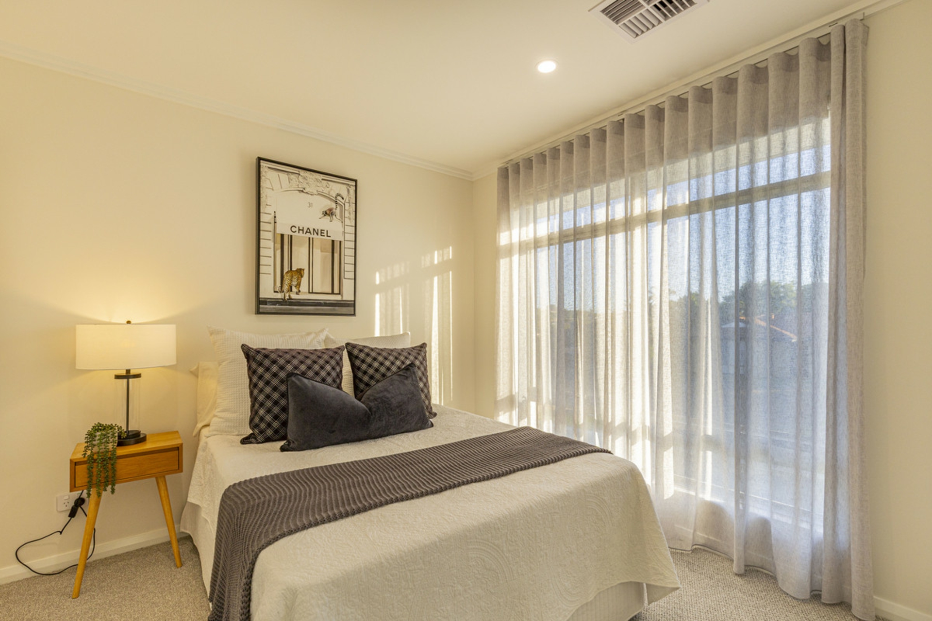 The interiors are defined by spacious open-plan living areas that feel bright, open and welcoming. Large windows and high ceilings invite natural light throughout the day, while the designer kitchen sits at the centre of the home, finished with stone surfaces, generous cabinetry and modern appliances that make everyday living effortless.