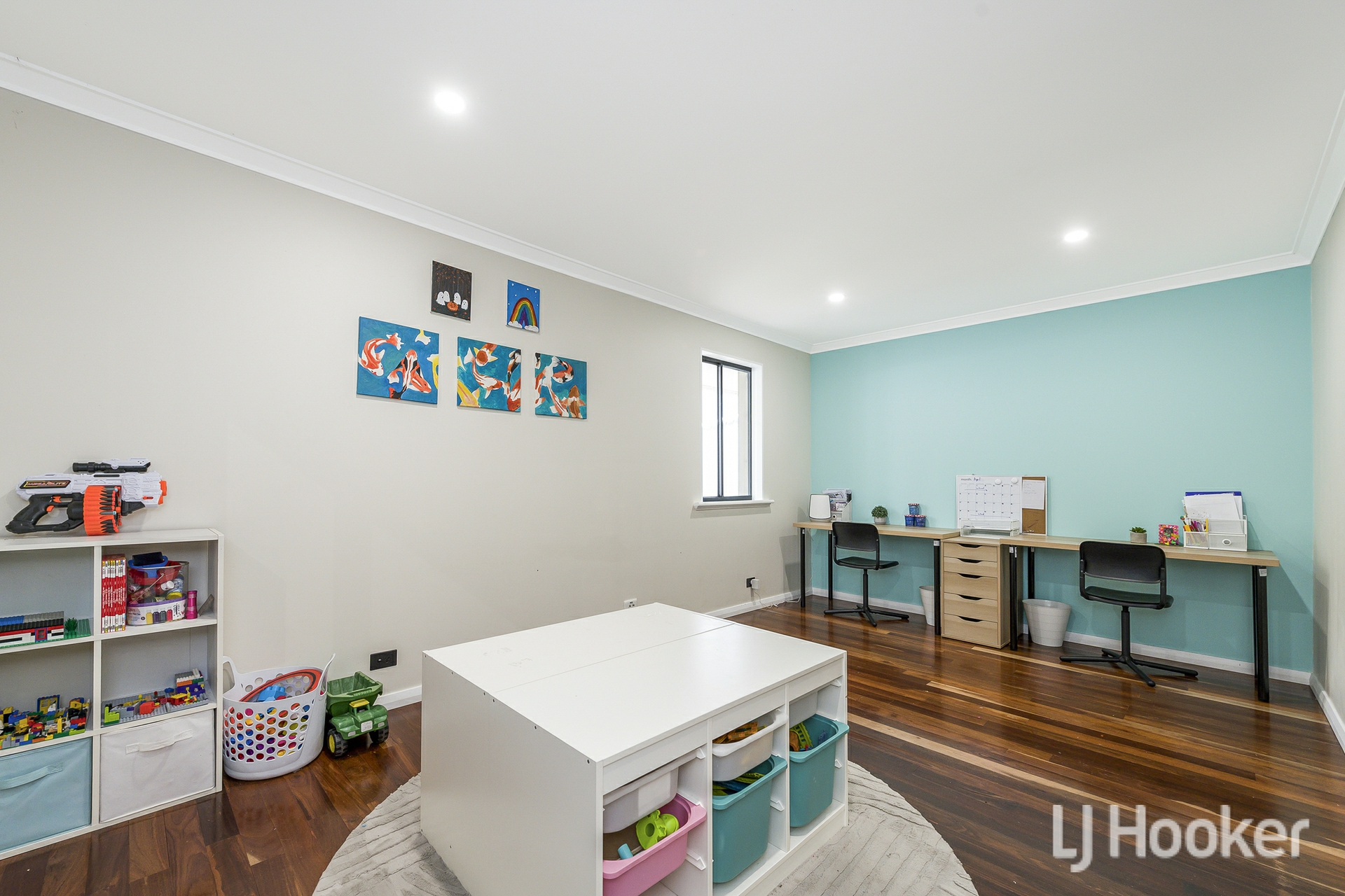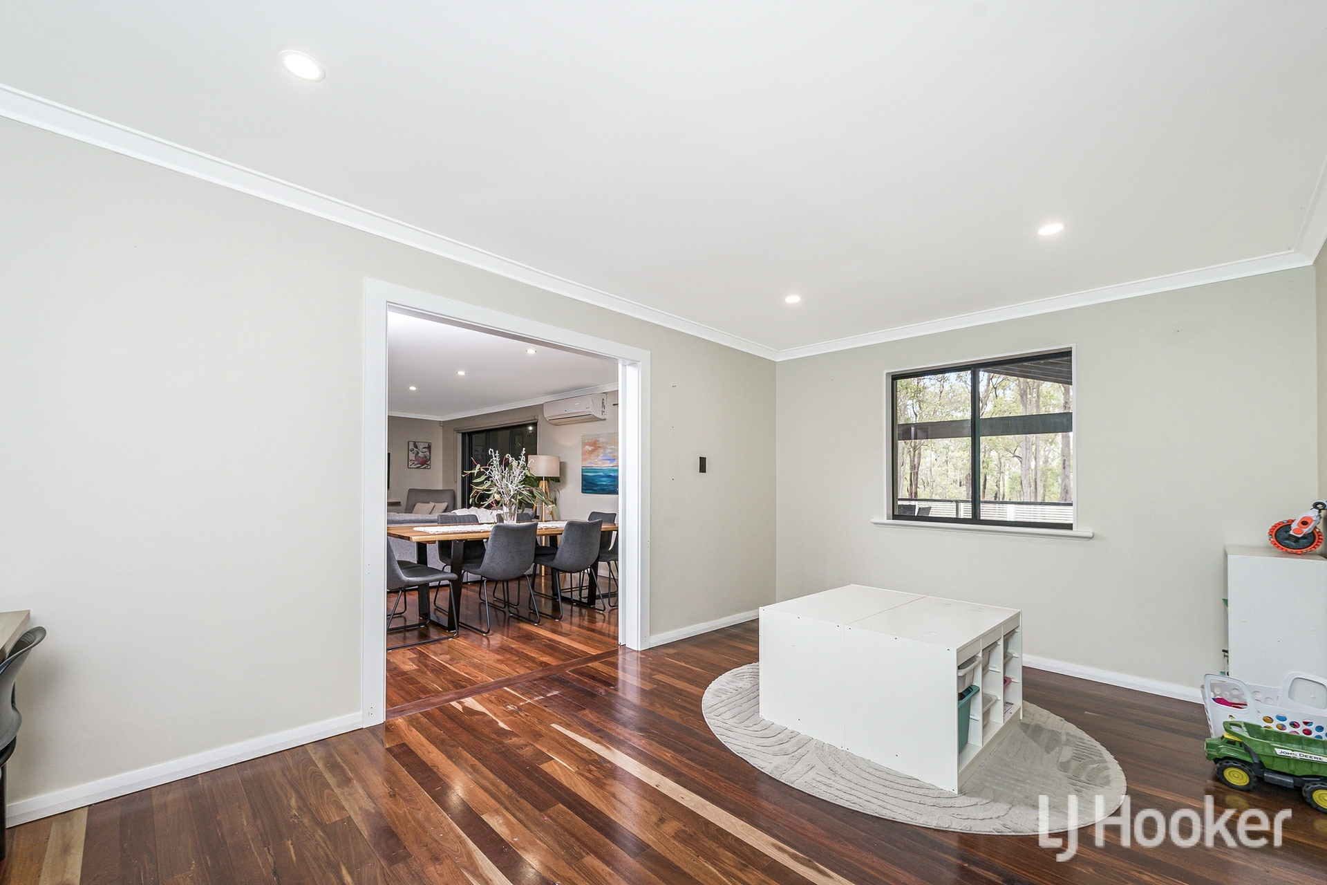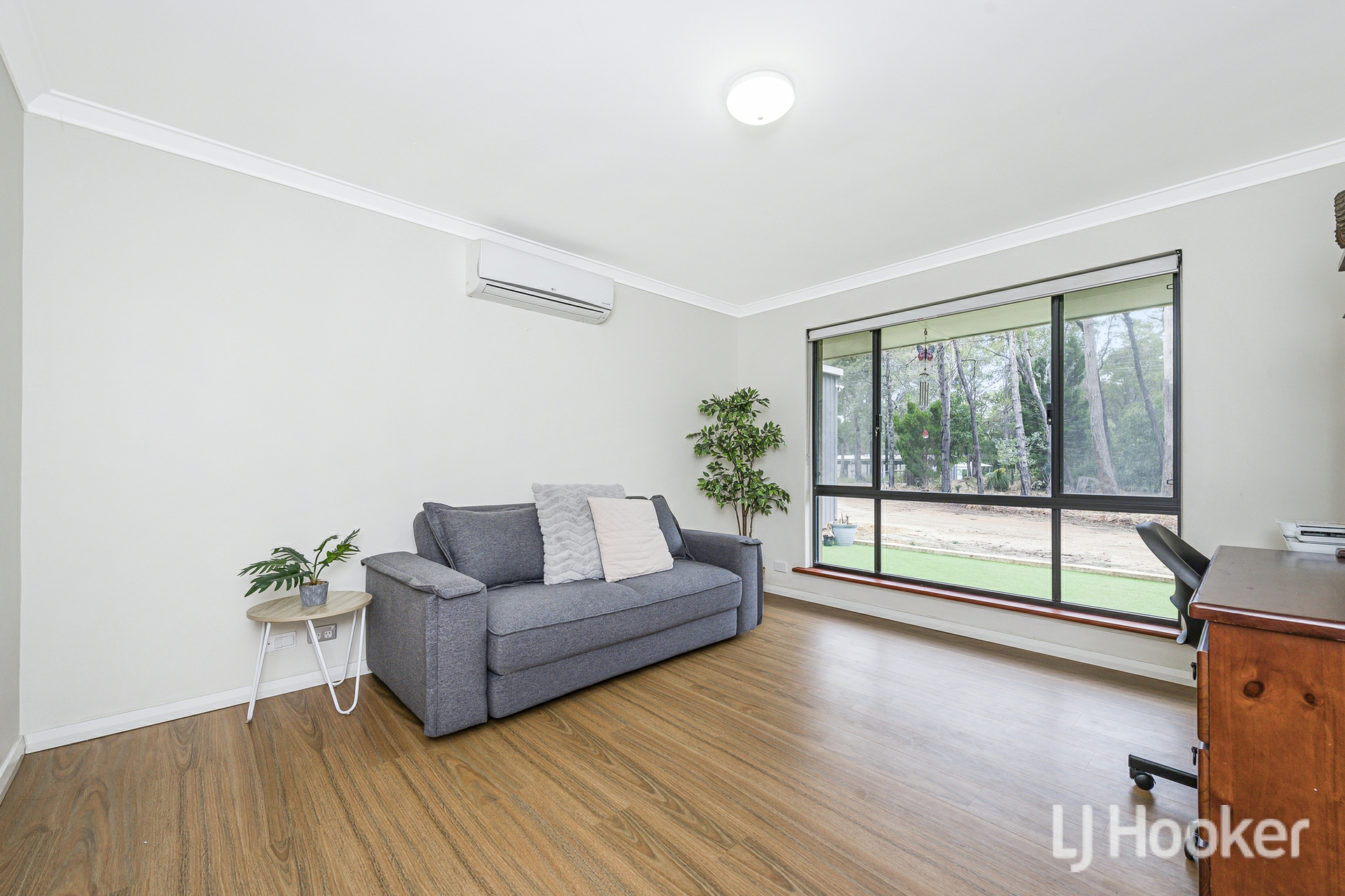 The home's exterior is neat and contemporary, featuring exposed aggregate pathway and low maintenance synthetic lawn. Inside, polished floorboards flow through the living areas, setting a warm and inviting tone. To one side of the entry sits a sunken lounge currently used as a theatre room spacious, comfortable and perfect for unwinding. Opposite is a generous bedroom, now functioning as a home office, complete with its own split system air conditioner.