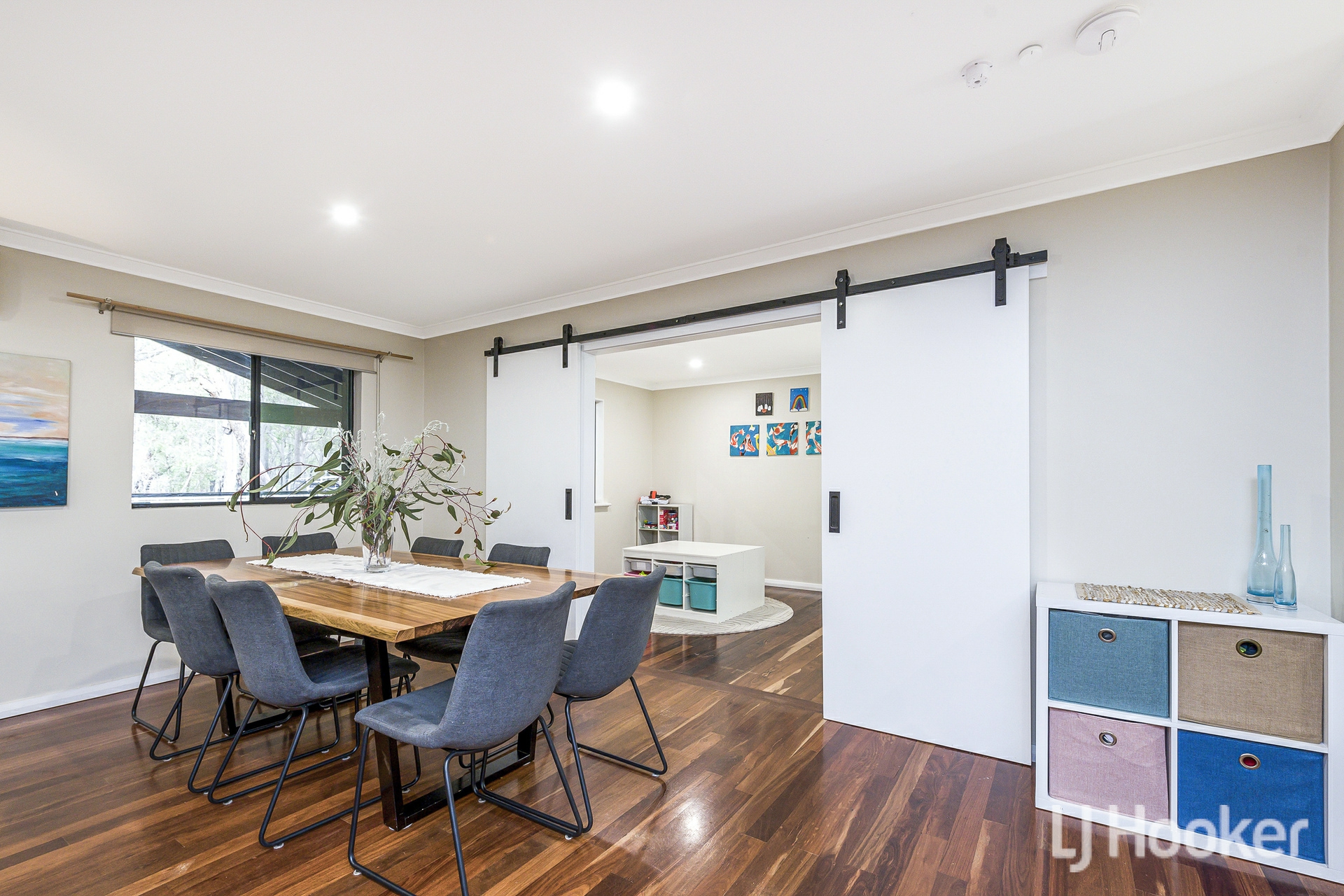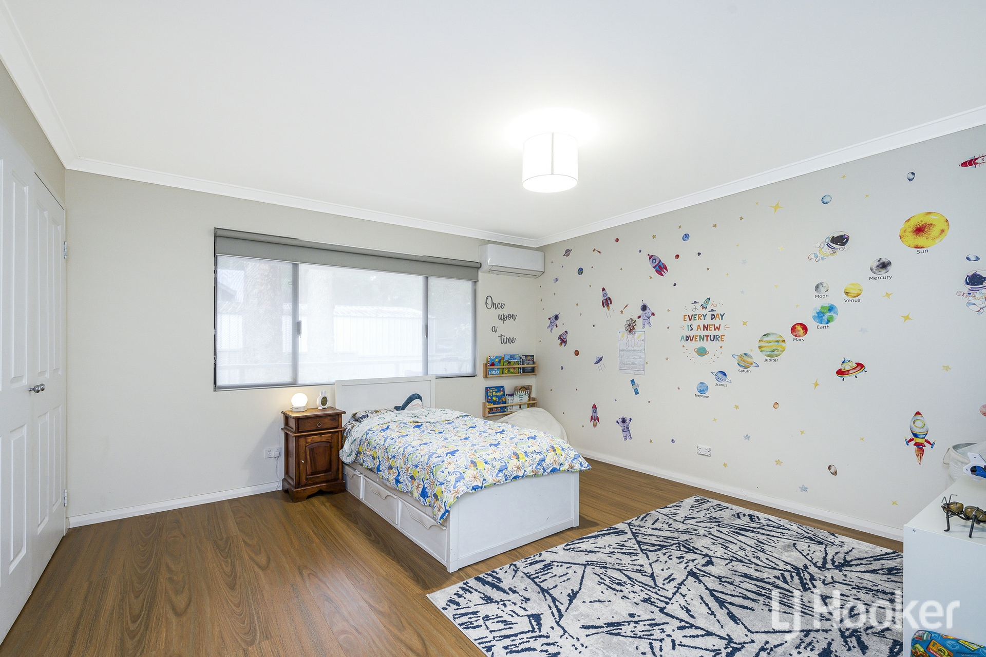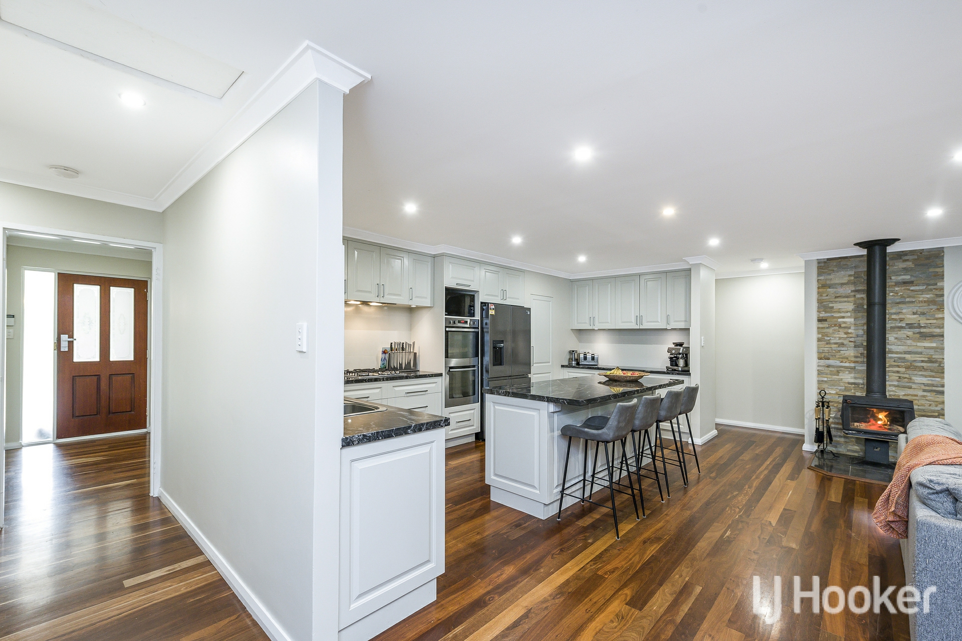 The home's exterior is neat and contemporary, featuring exposed aggregate pathway and low maintenance synthetic lawn. Inside, polished floorboards flow through the living areas, setting a warm and inviting tone. To one side of the entry sits a sunken lounge currently used as a theatre room spacious, comfortable and perfect for unwinding. Opposite is a generous bedroom, now functioning as a home office, complete with its own split system air conditioner.