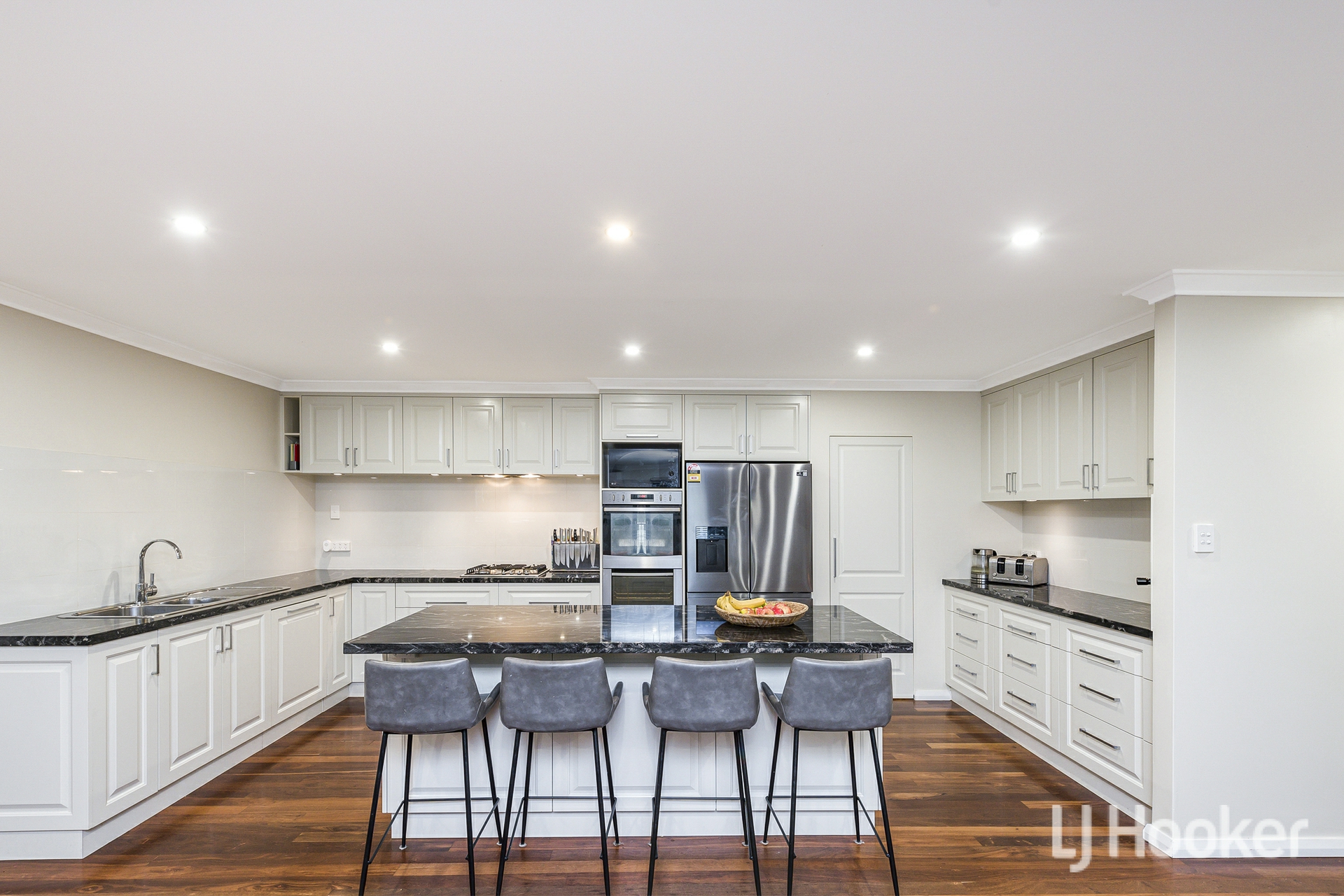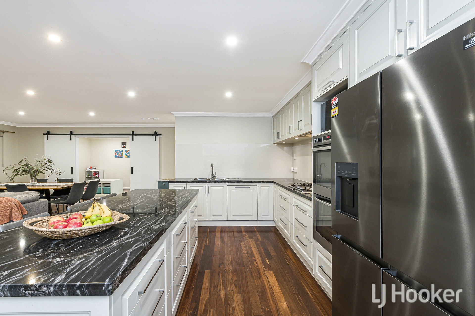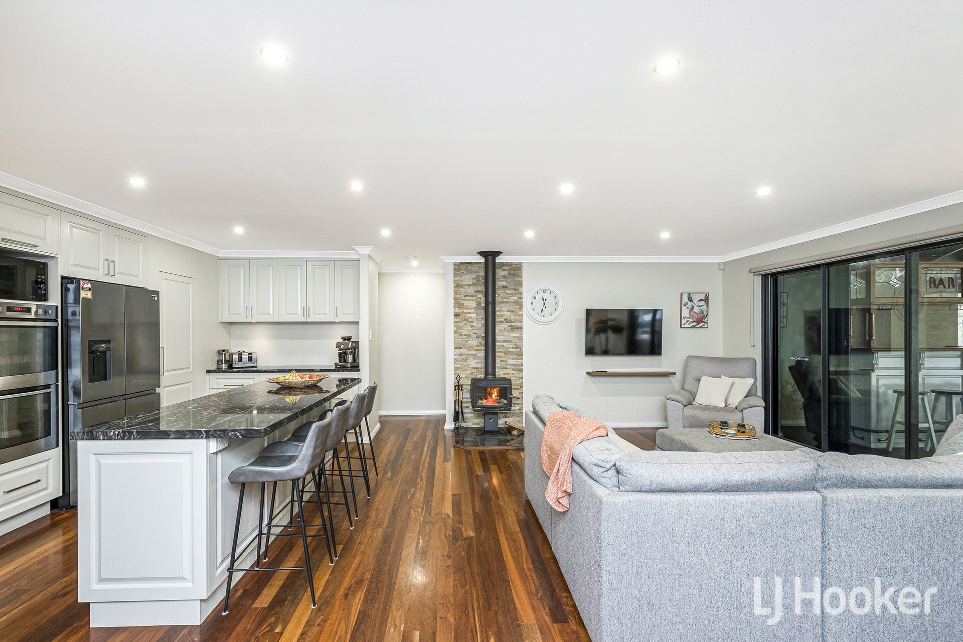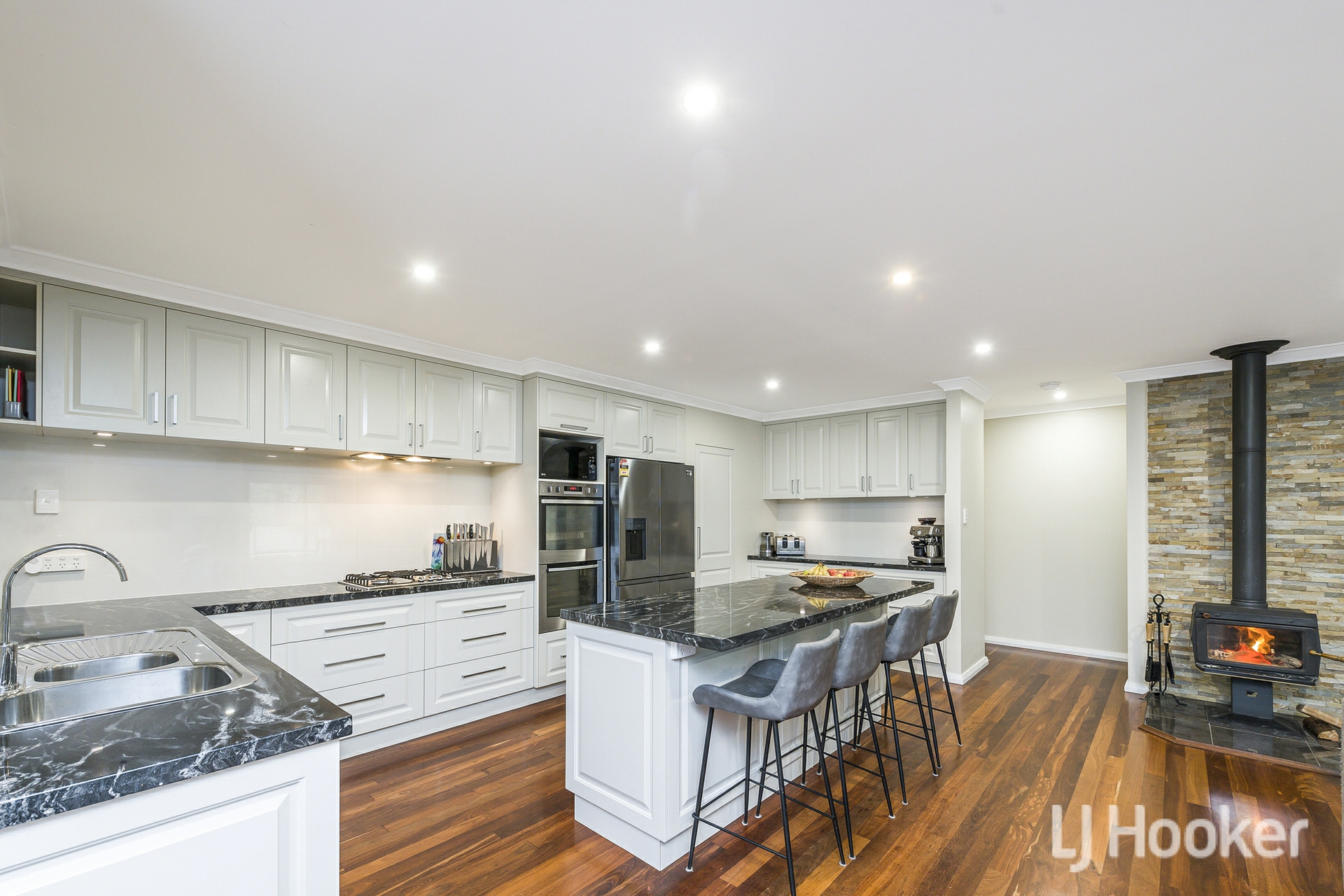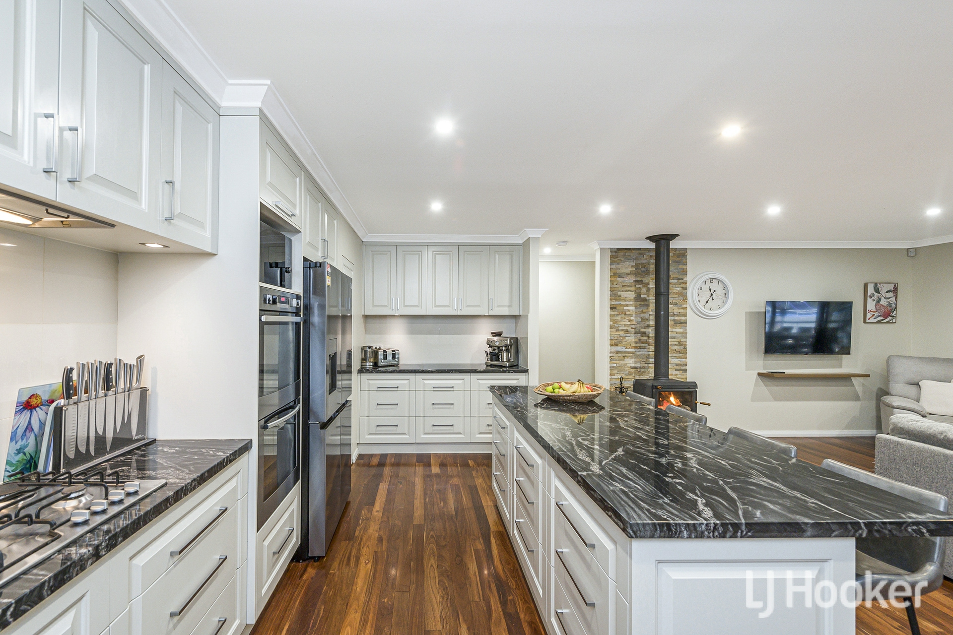 The heart of the home is the expansive open plan living and dining area, enhanced by a large split system air conditioner and a cosy combustion fireplace for winter nights. Overlooking this space is a chef's kitchen designed to impress, featuring three stone wrapped benches including a breakfast bar, abundant cabinetry, twin 600mm ovens, a large gas cooktop and a walk in pantry. Adjacent sits a generous games room behind twin barn doors, easily accommodating a pool table and additional furnishings.