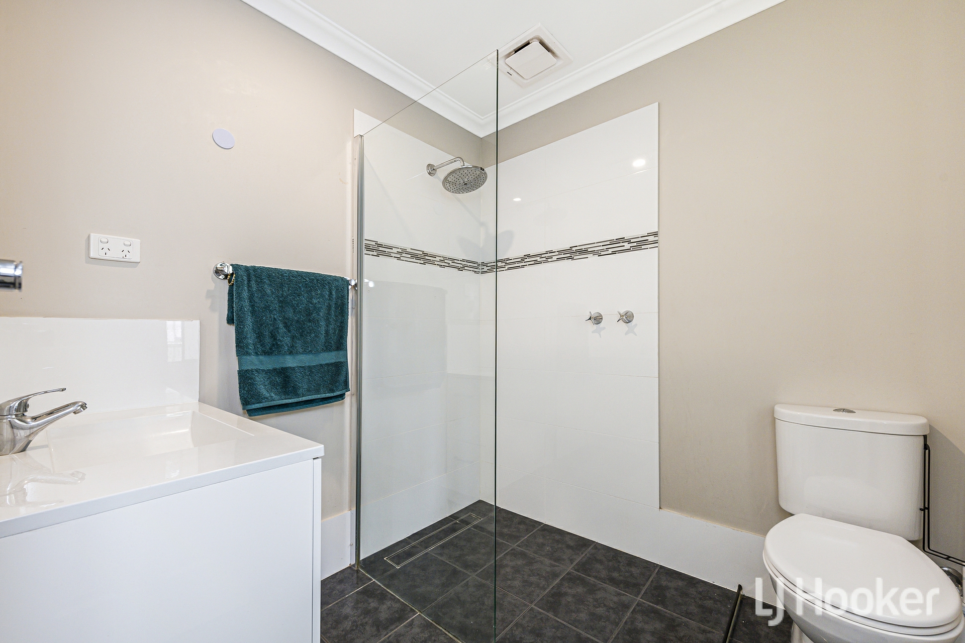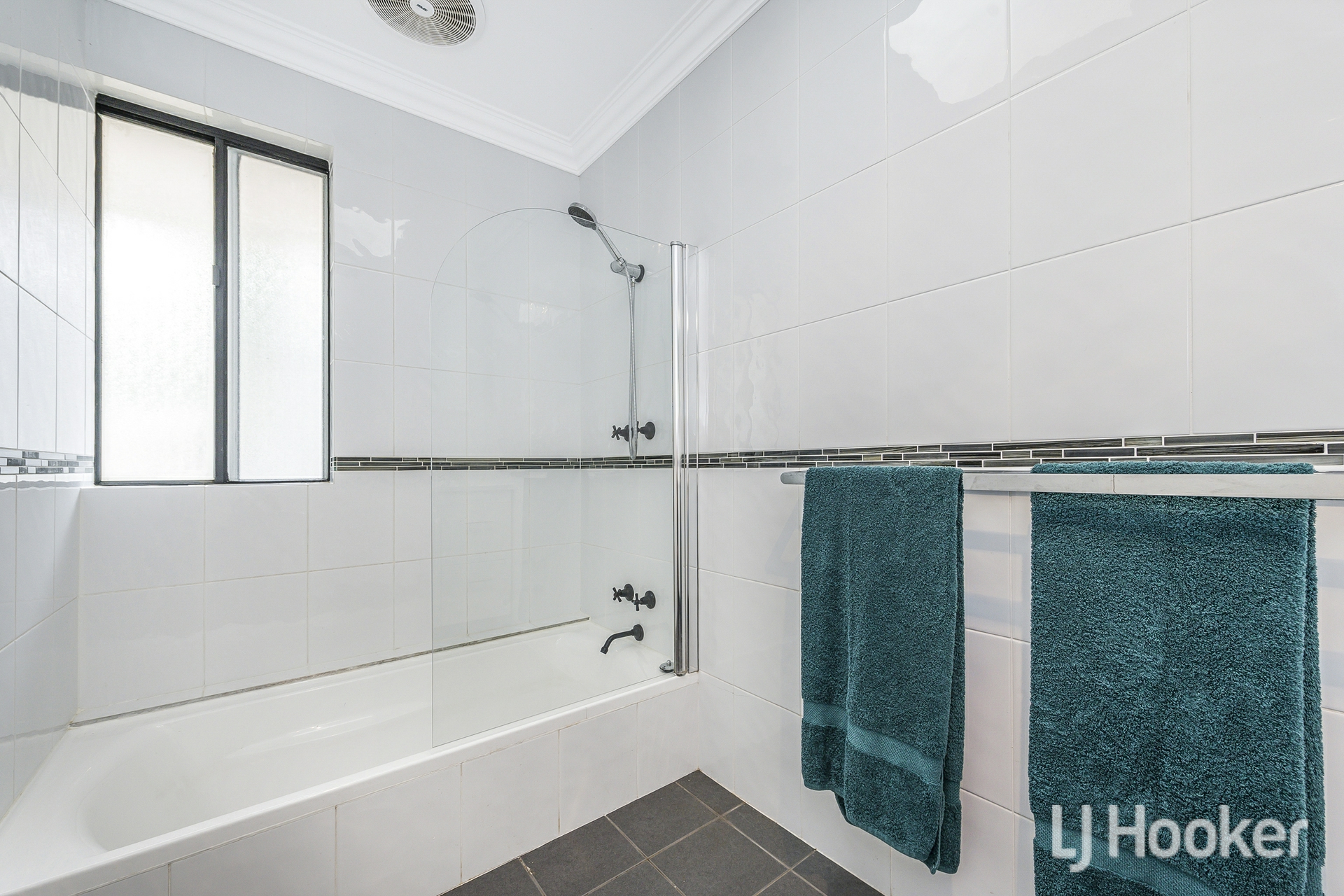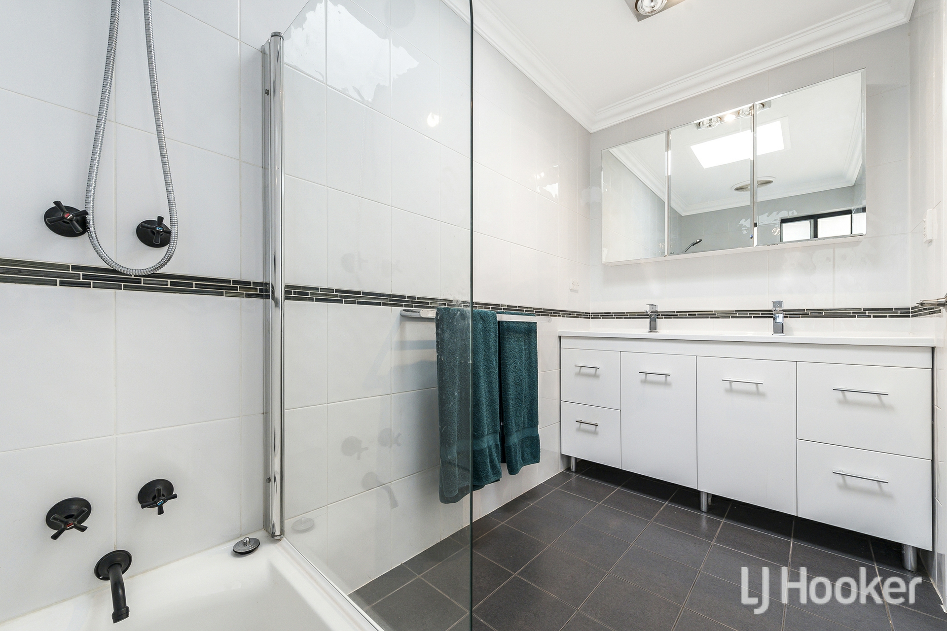 The laundry offers exceptional practicality with room for multiple appliances and even a plumbed in dishwasher. Across the hall, the main bathroom has been stylishly updated with floor to ceiling tiles, twin sinks set into a stone topped vanity, and a shower positioned over the bathtub with sleek black tapware.