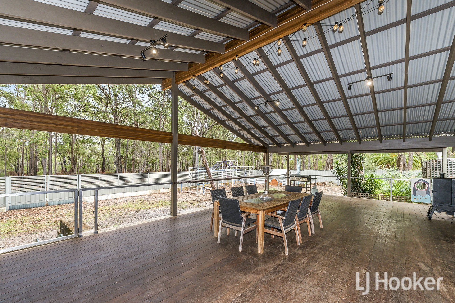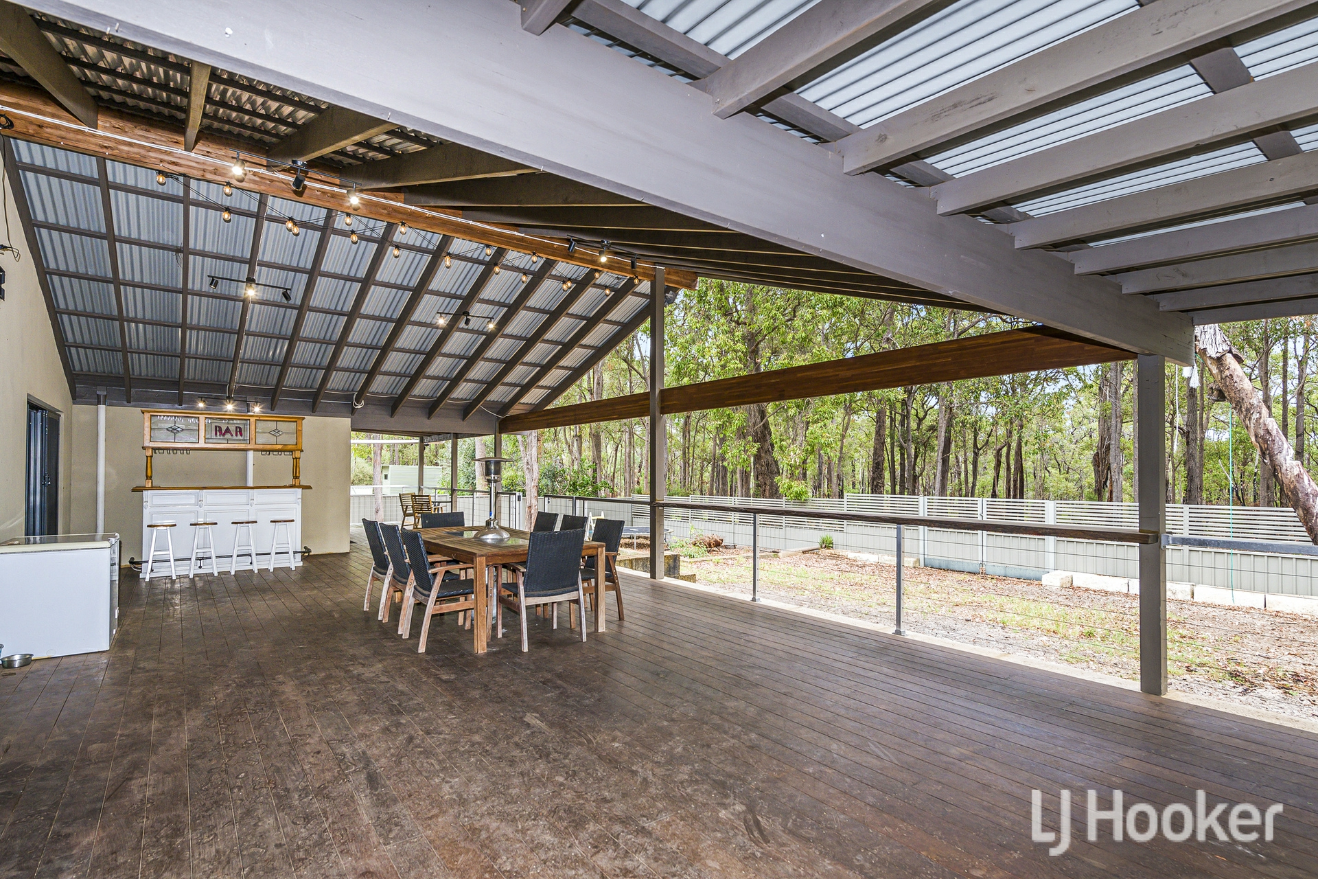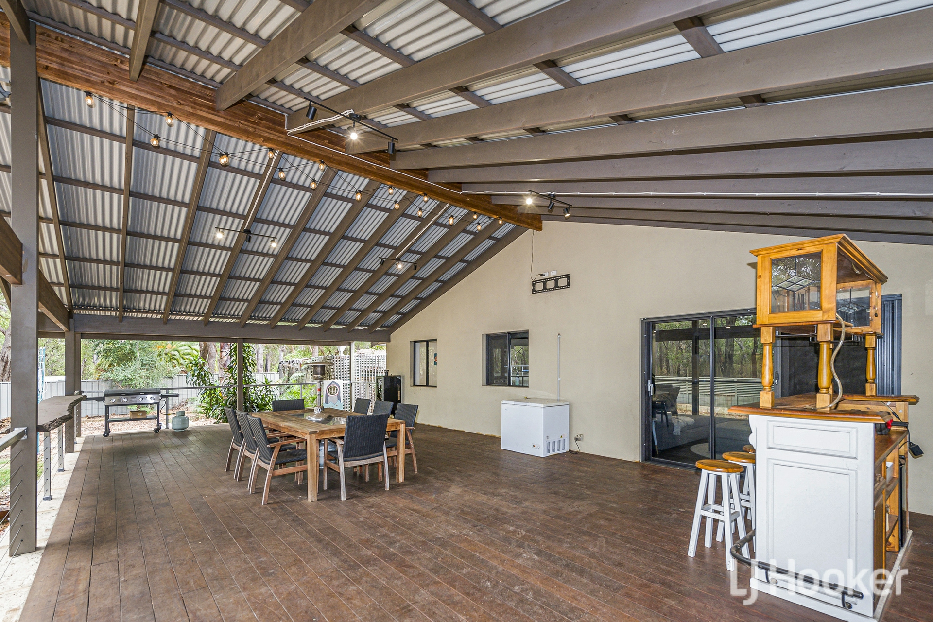 At the rear, a substantial gabled patio stretches almost the full width of the home. Whether hosting family gatherings or simply enjoying the tranquillity, the backdrop of the state forest enhances the feeling of living amongst the trees.