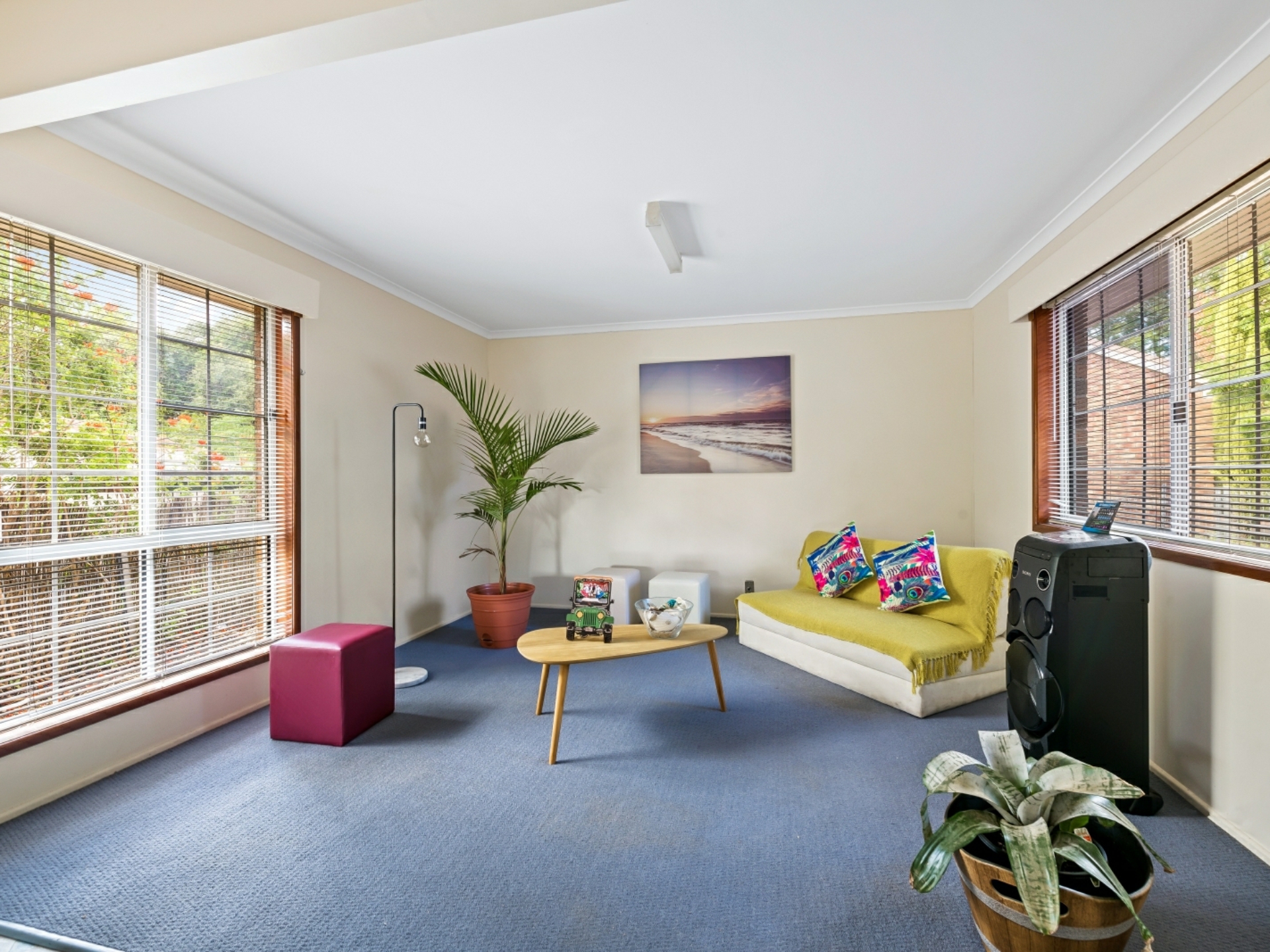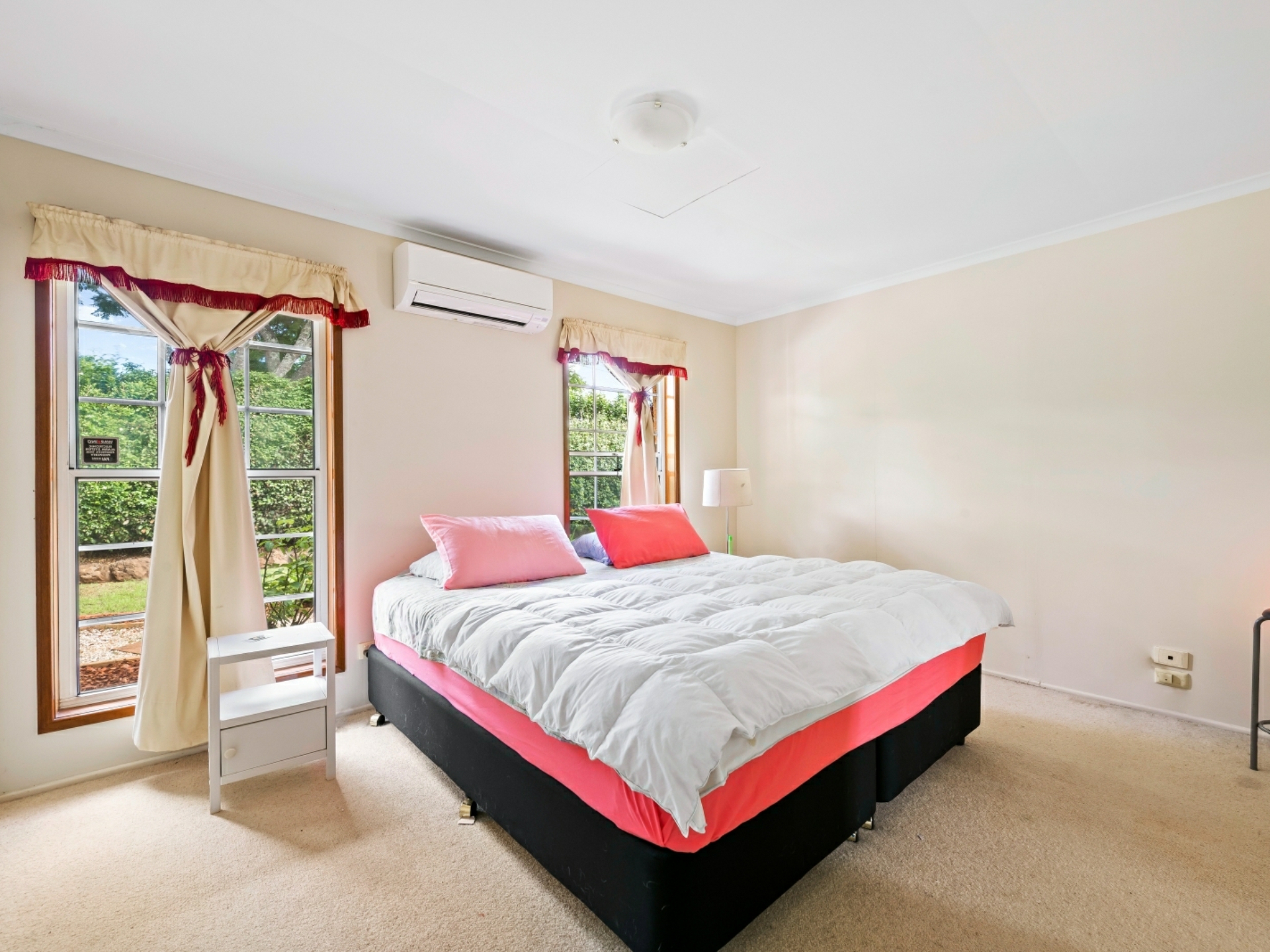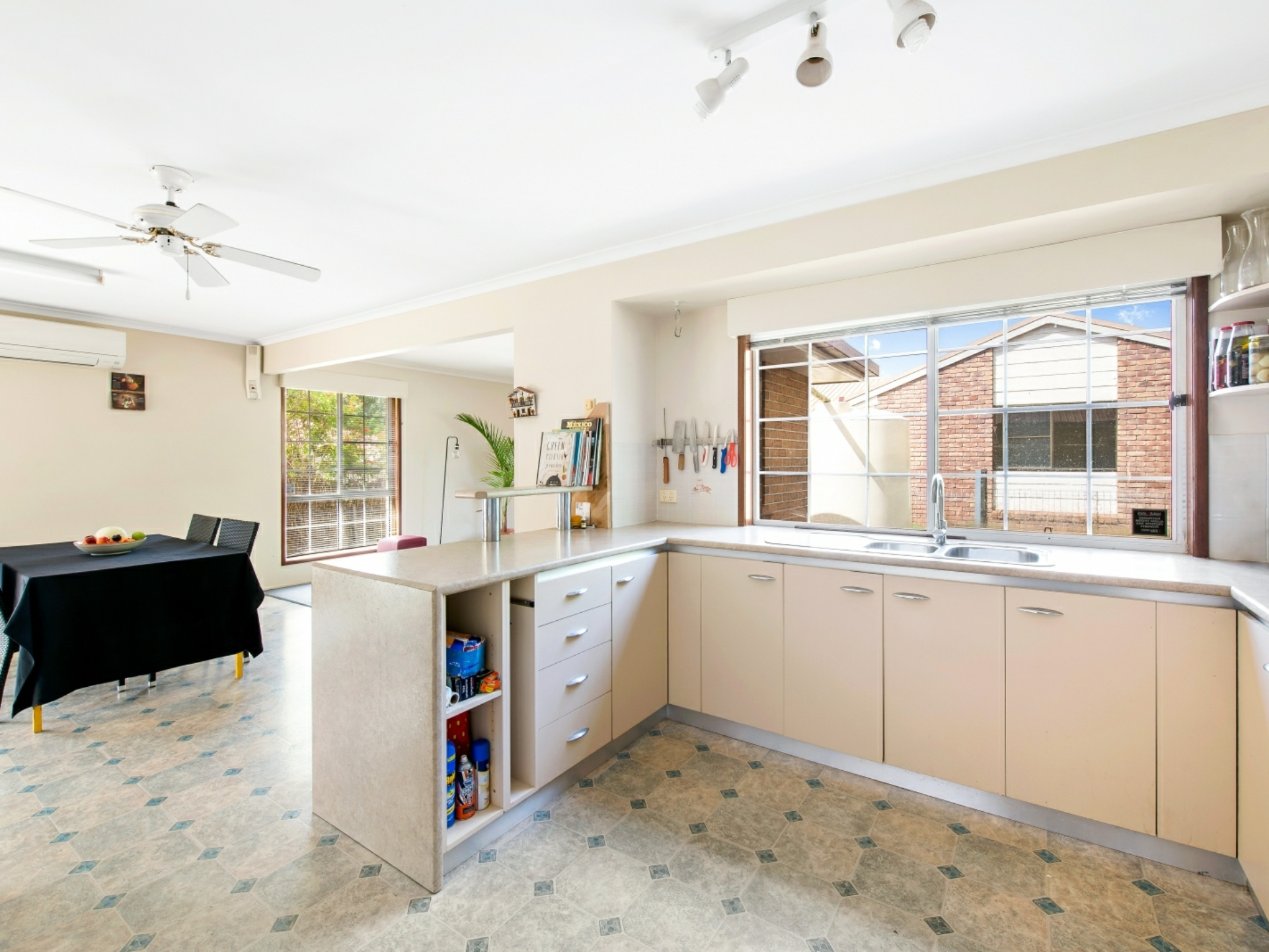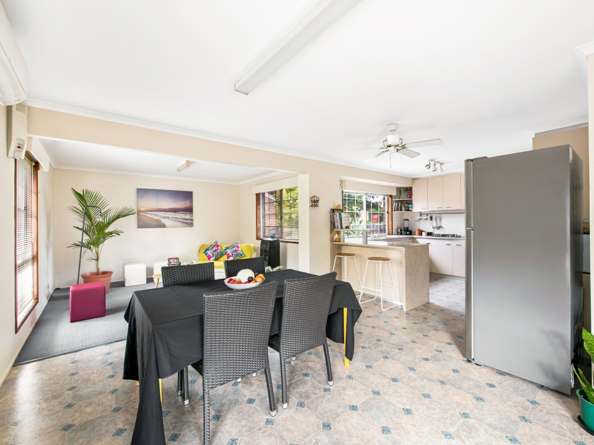 Through the security front door, the light and airy feel is enhanced by well-proportioned windows and open plan living areas. Recessed walls, a bay window and wall cut-outs are a stylish feature. The spacious living areas are separated by the contemporary kitchen, which includes a breakfast bar. A central air-conditioner provides comfortable living, as does practical flooring in the kitchen and dining areas - all other rooms are carpeted. The bedrooms have built-in robes and share a bathroom and separate toilet. A convenient link door into the bathroom, from the master bedroom, offers the benefits of an en suite. The master bedroom is air-conditioned, light filled and spacious.