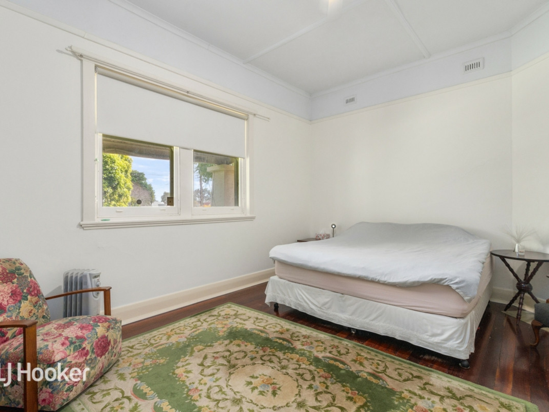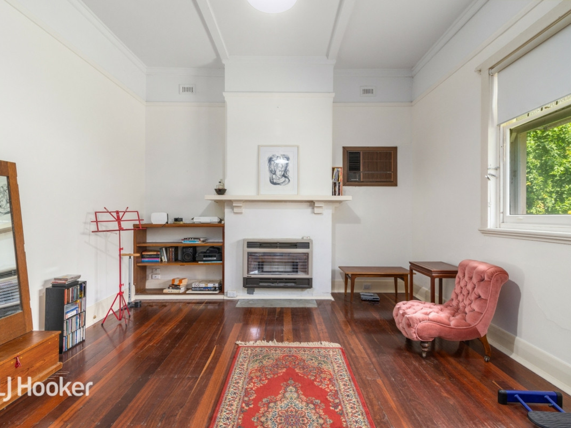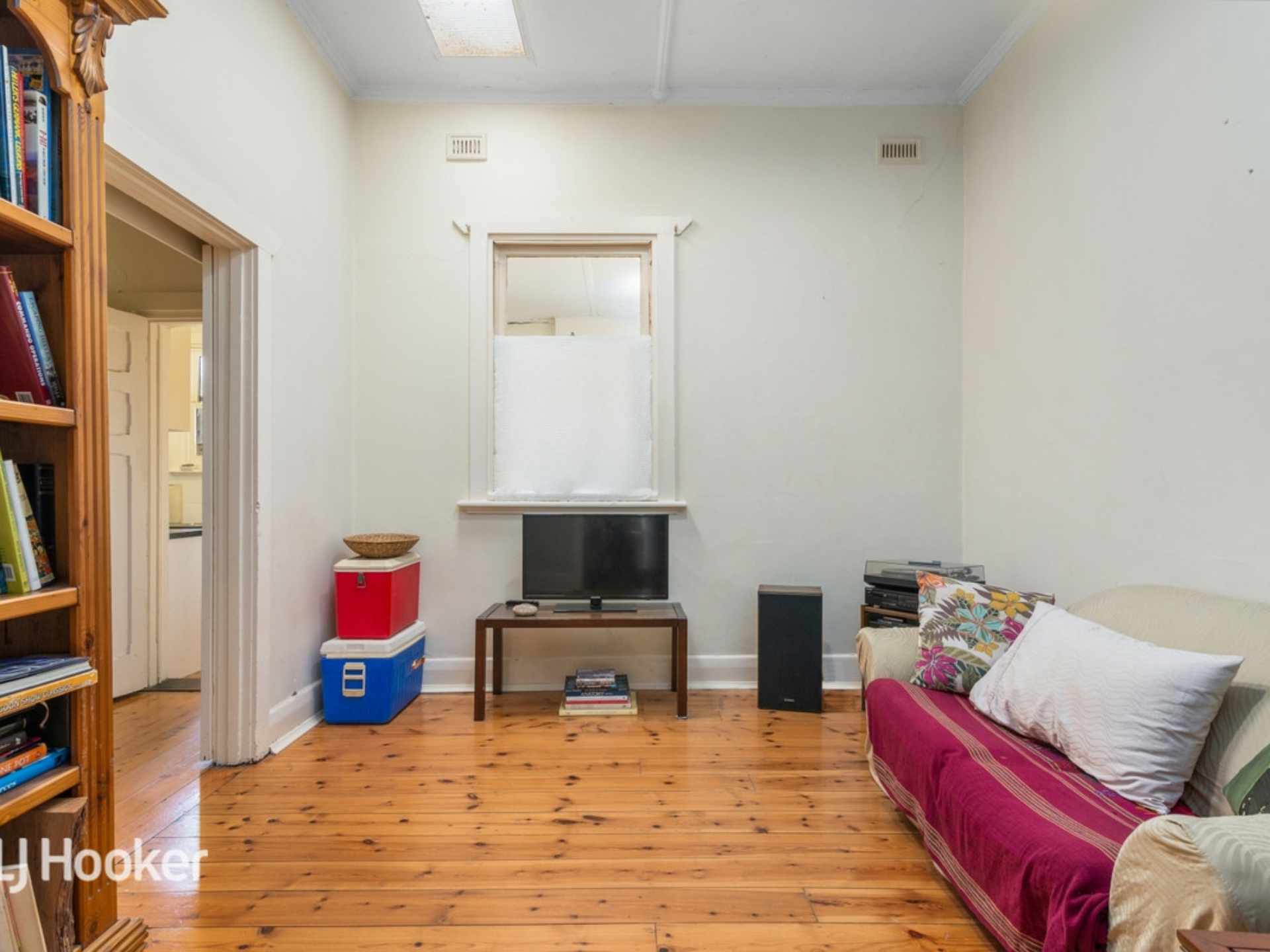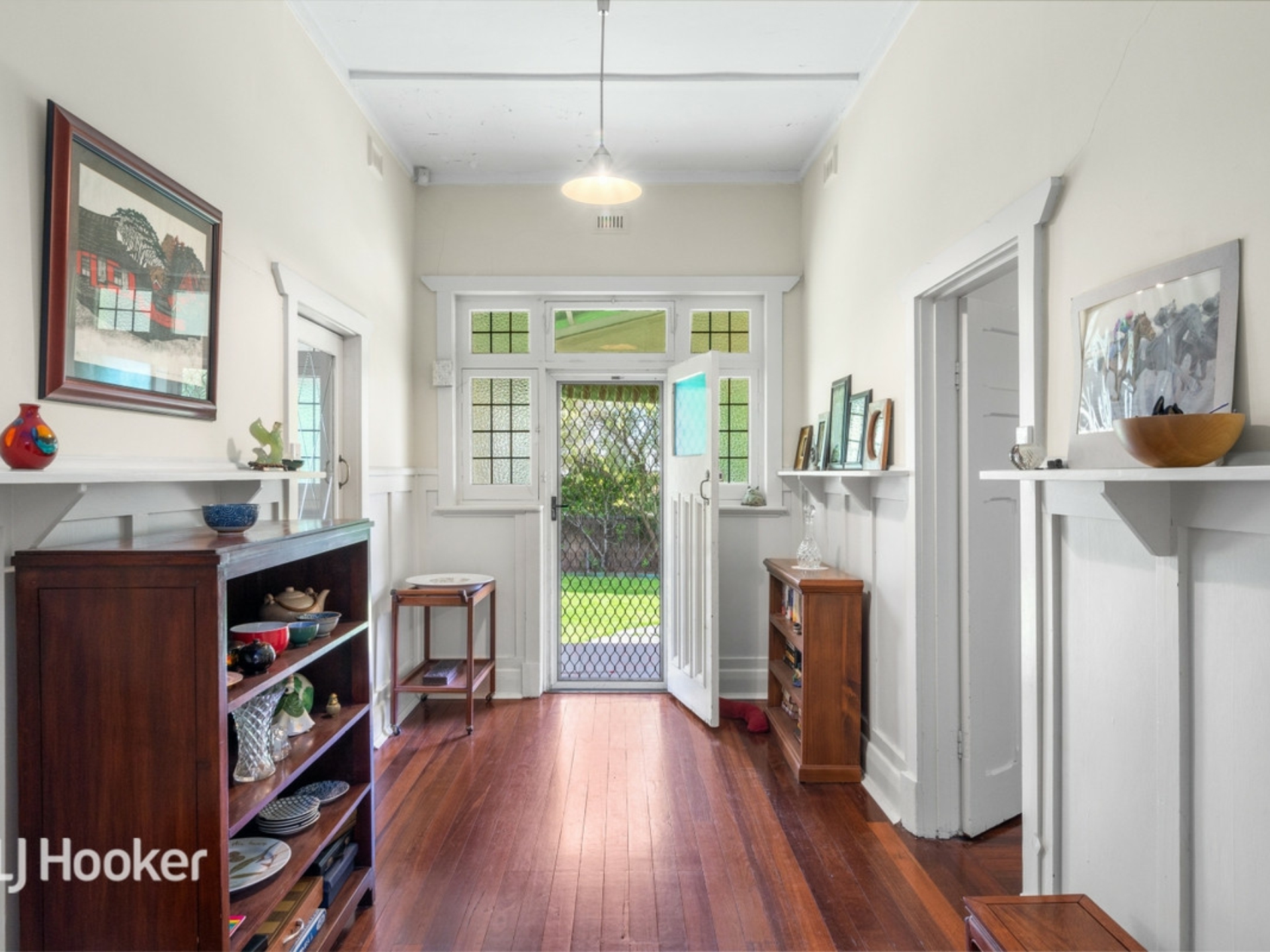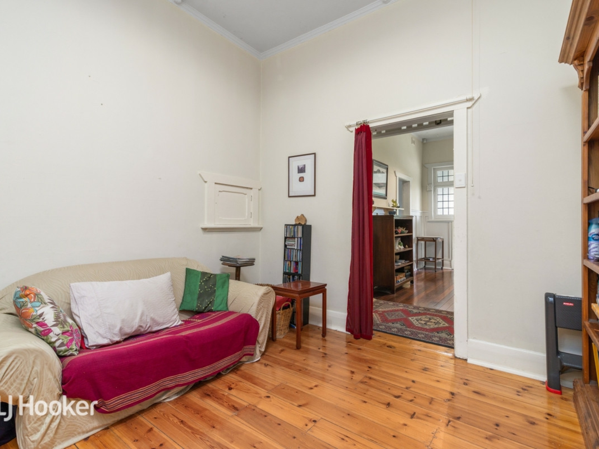 A formal sitting room and two large bedrooms lead off a wide central entrance hall All three rooms and the hall have jarrah floorboards.