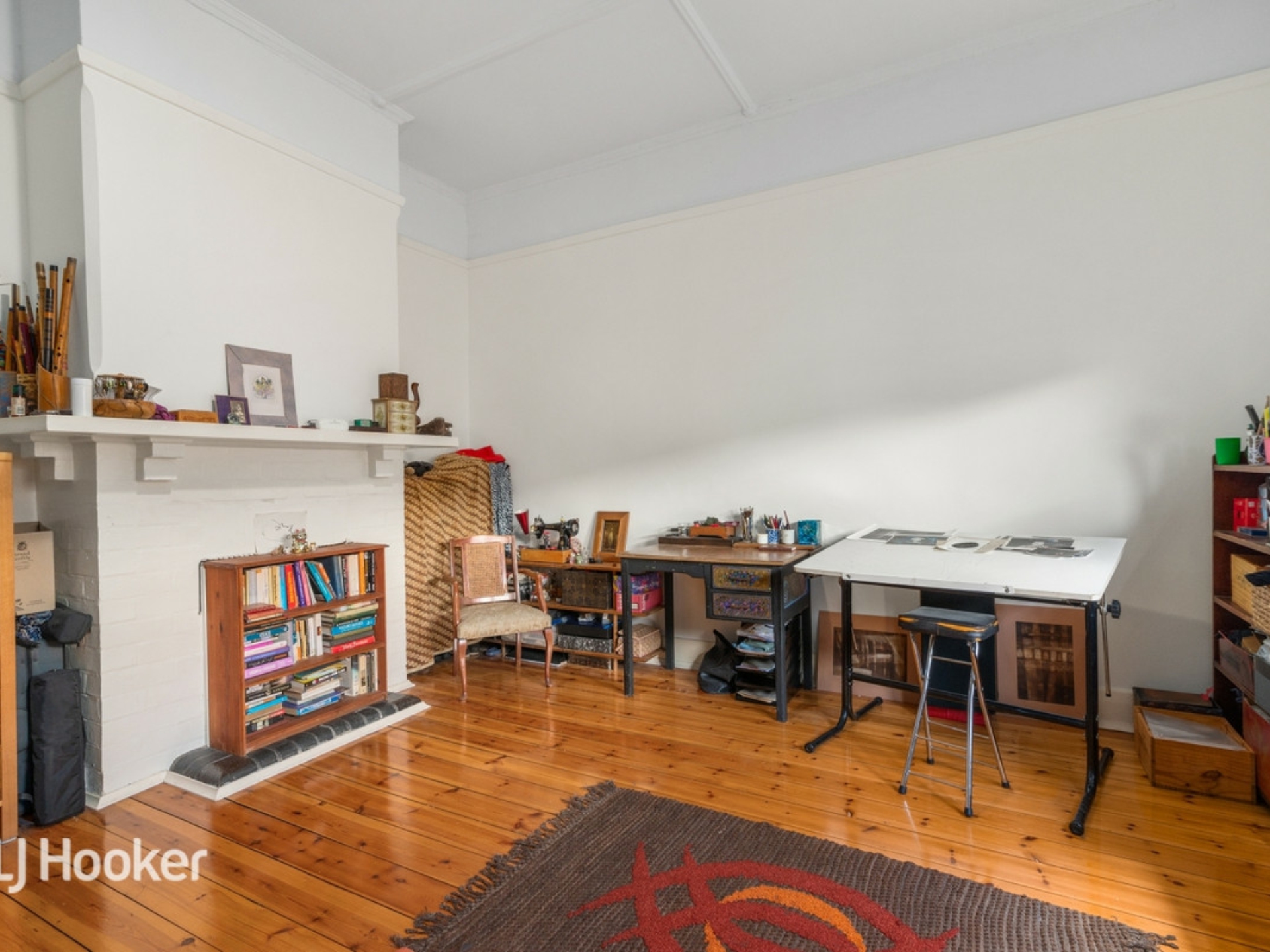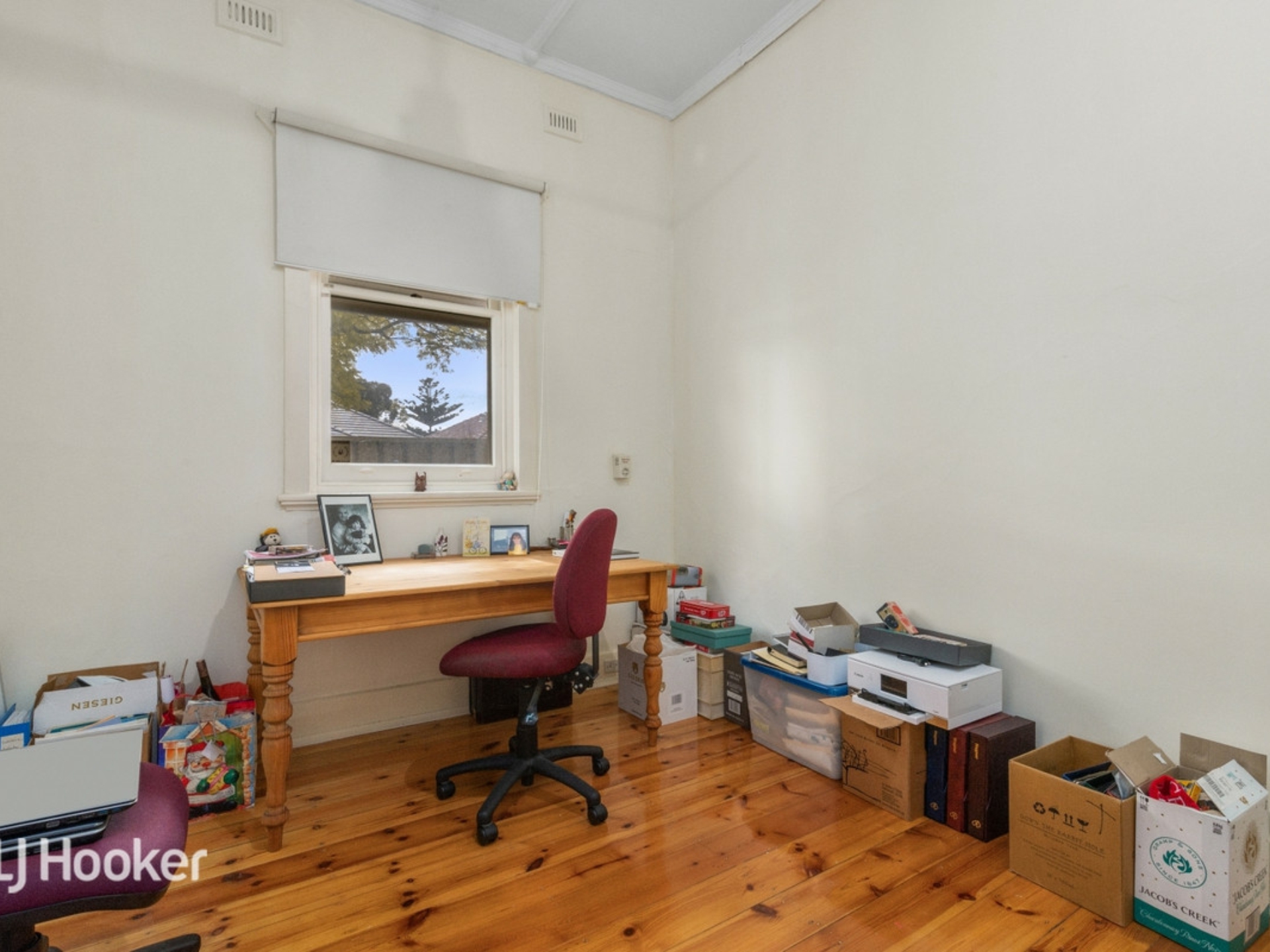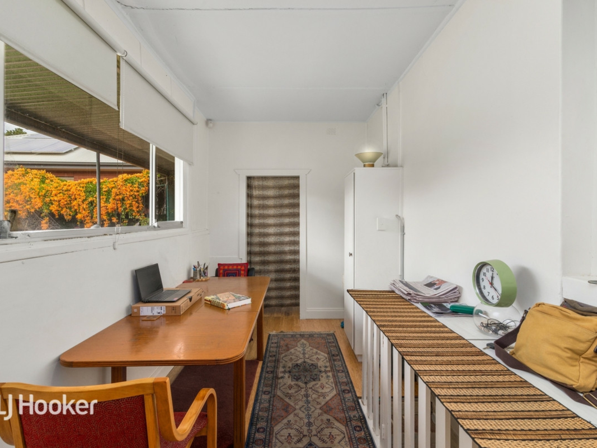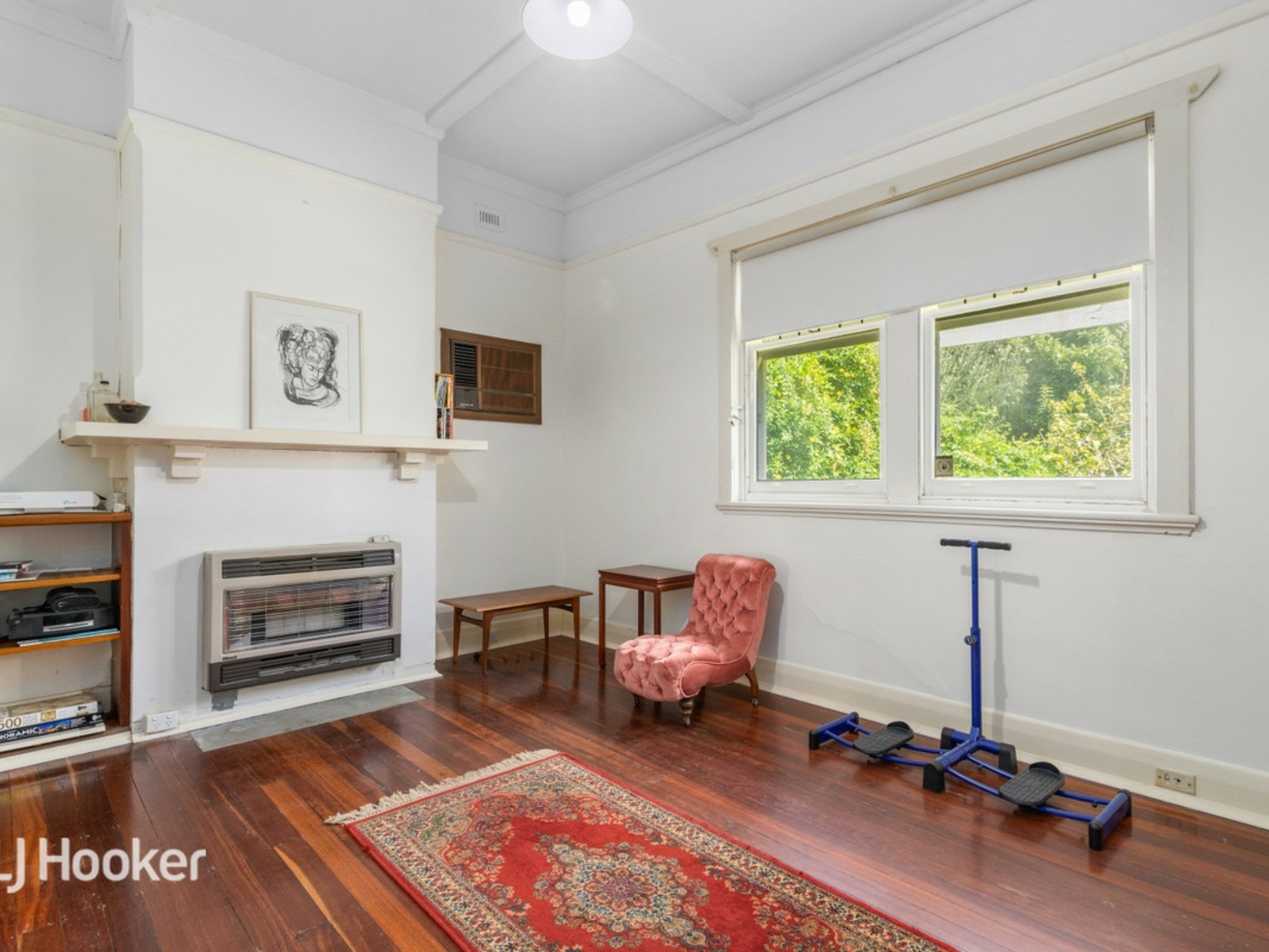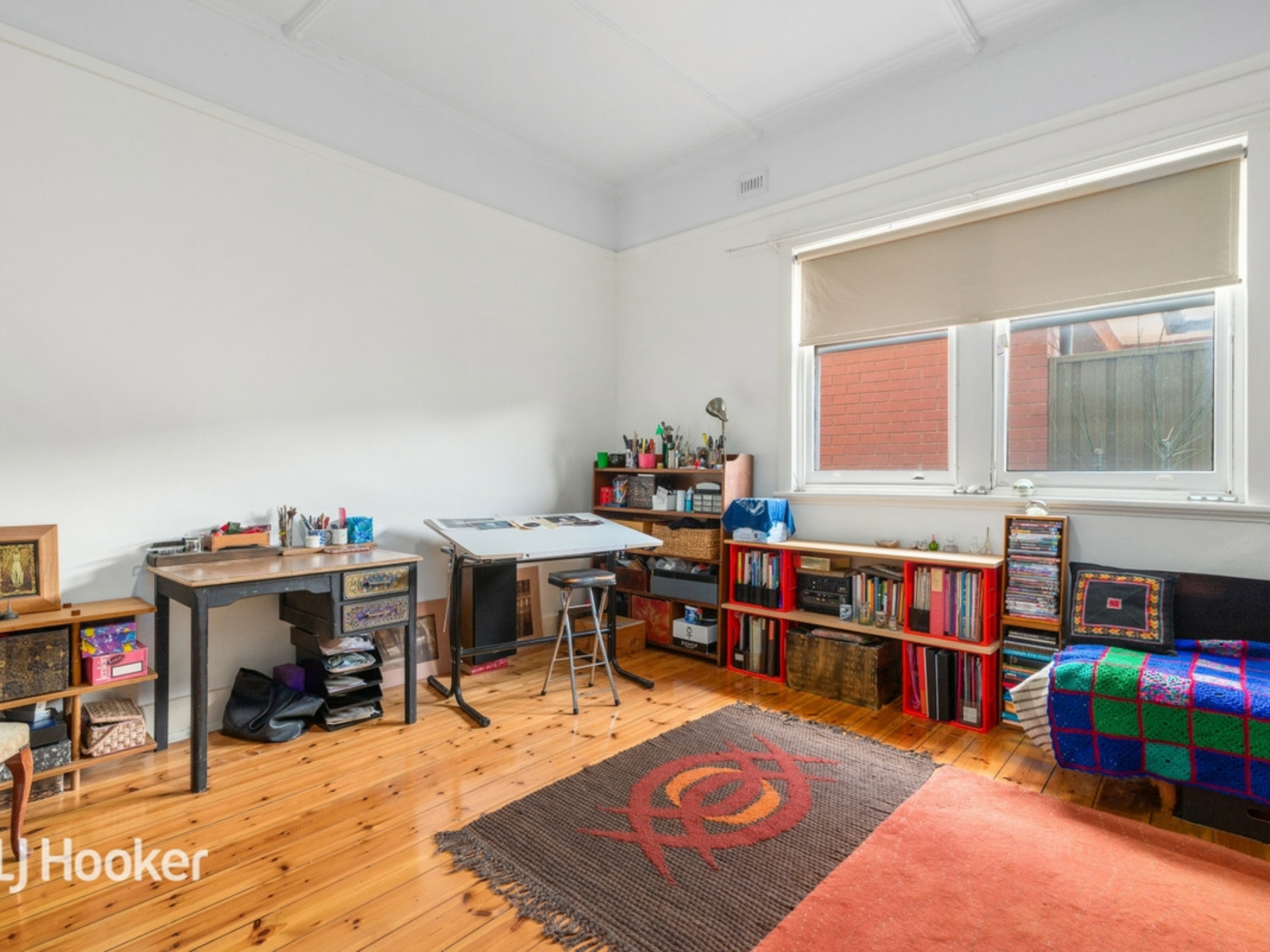 A formal sitting room and two large bedrooms lead off a wide central entrance hall All three rooms and the hall have jarrah floorboards.