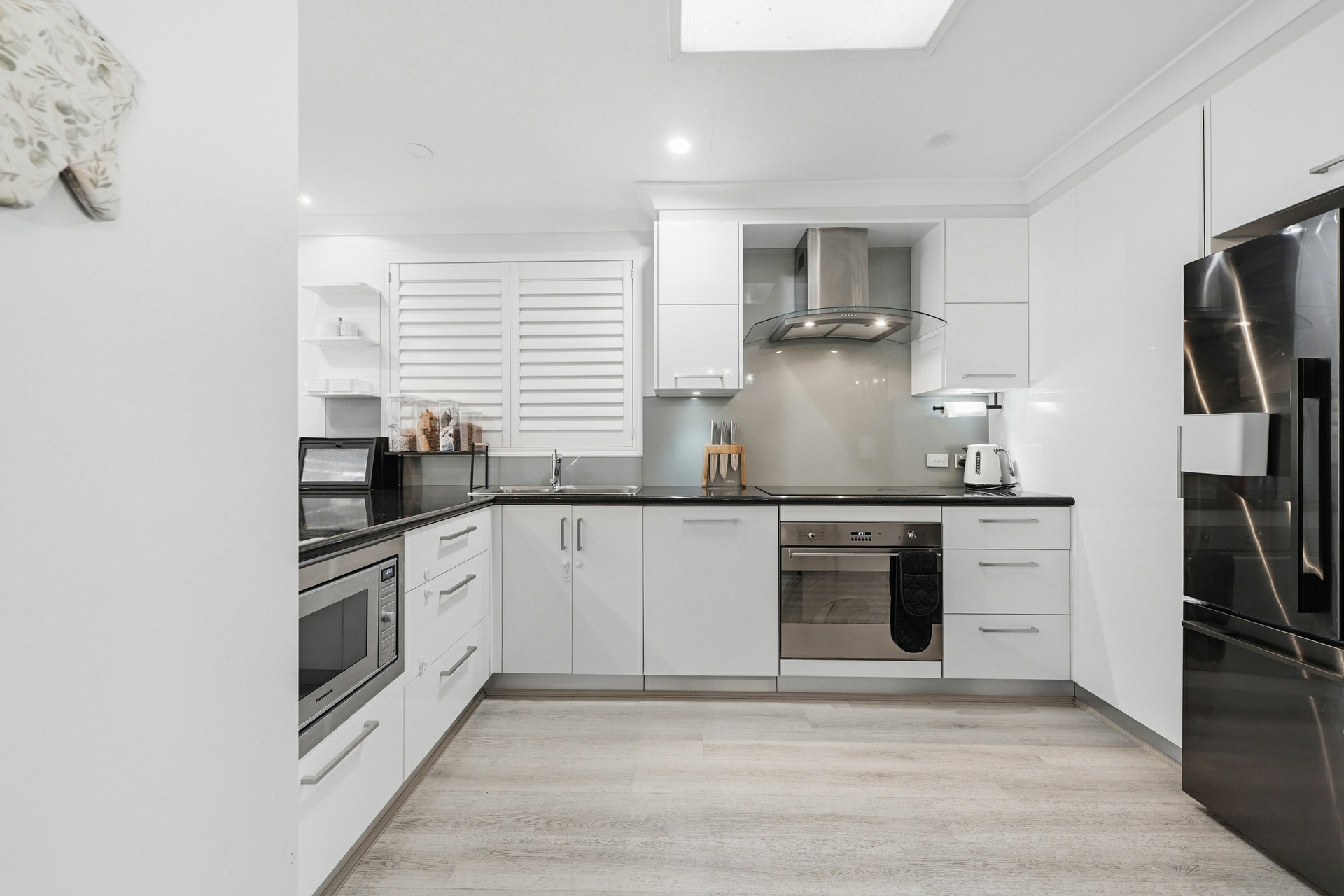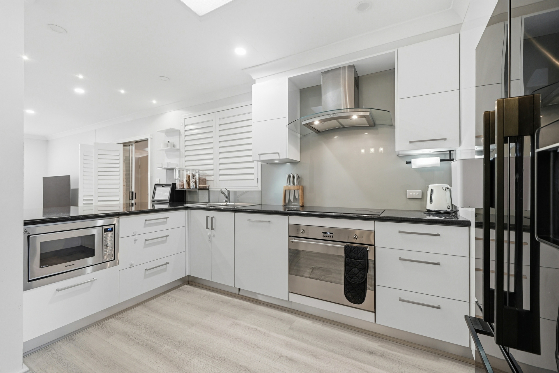 The kitchen is finished with sleek black quartz granite benchtops, stainless steel appliances, induction cooktop and electric oven, and a well-designed layout including a large pantry with clever Lazy Susan shelving to keep everything within easy reach.