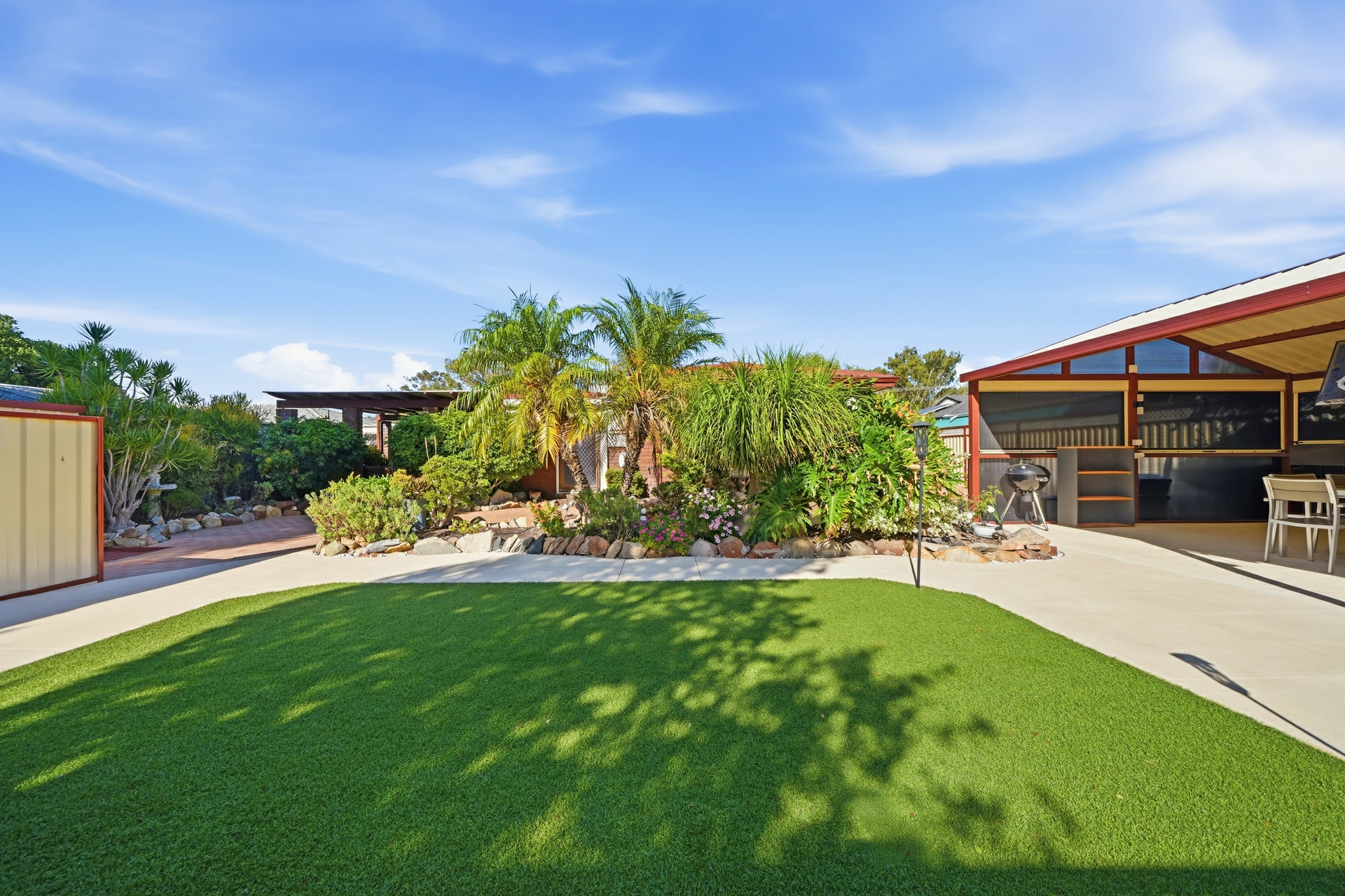 Limestone paving, astro turf, and plenty of room for entertaining or simply unwinding while the kids or pets play safely in perfectly surrounded and secure back yard