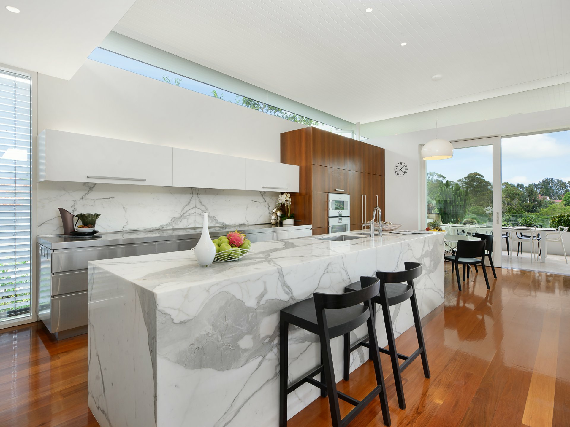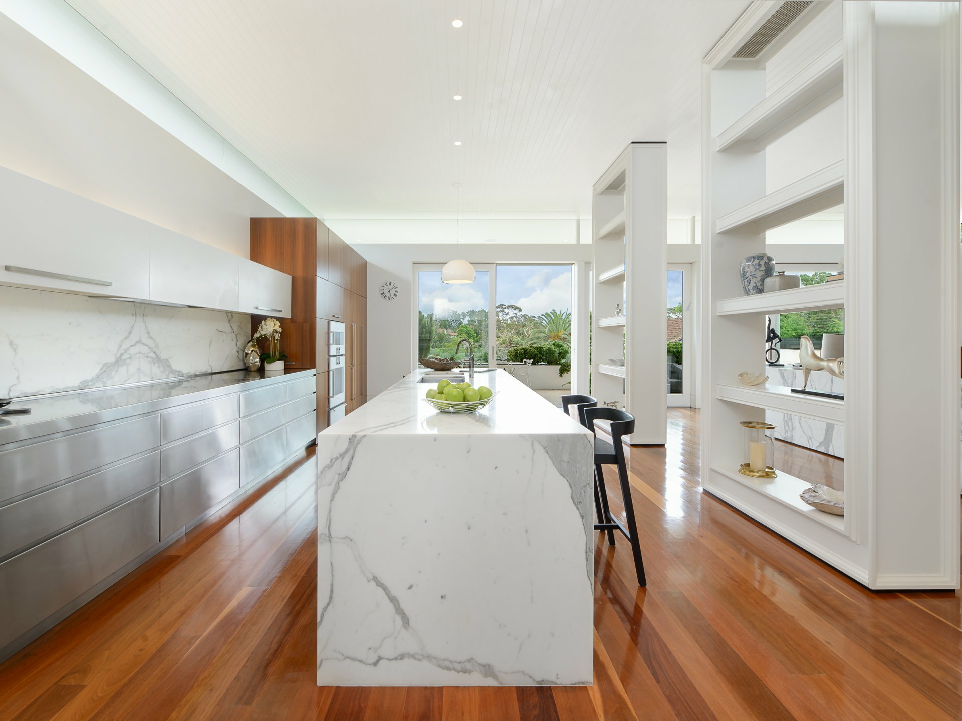 The magnificent kitchen features luxury Calacatta marble complementing the sleek stainless-steel finishes and luxury integrated Liebherr fridges, Gaggenau steamer and oven, and Siemens induction cooktop. The living room and kitchen areas are divided into separate living areas by floor-to-ceiling bespoke display units.