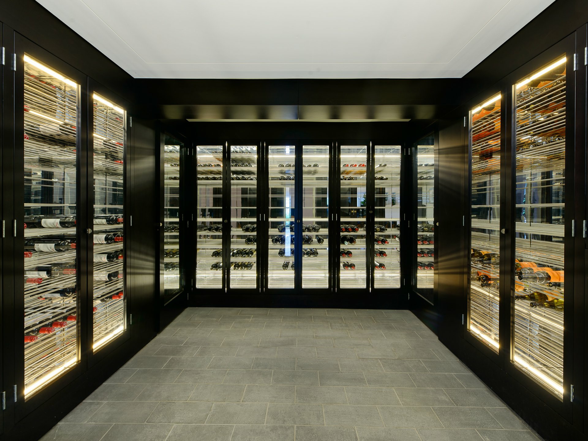 Style meets function in the 600-bottle wine cellar offering sleek glass finishes and an area for private entertaining or wine tasting.