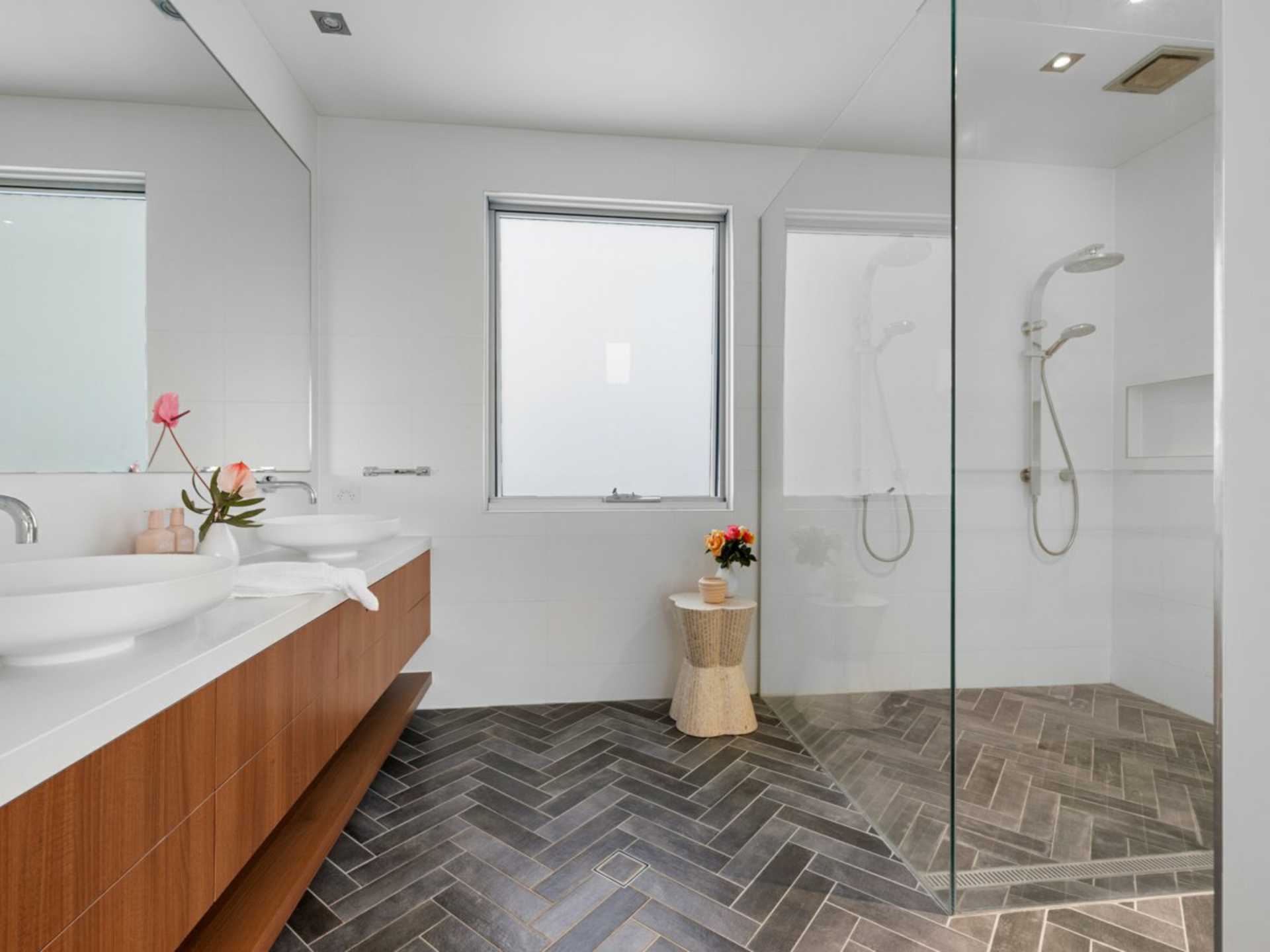 Three ensuited bedrooms include ducted air conditioning, ceiling fans & low maintenance timber look flooring.