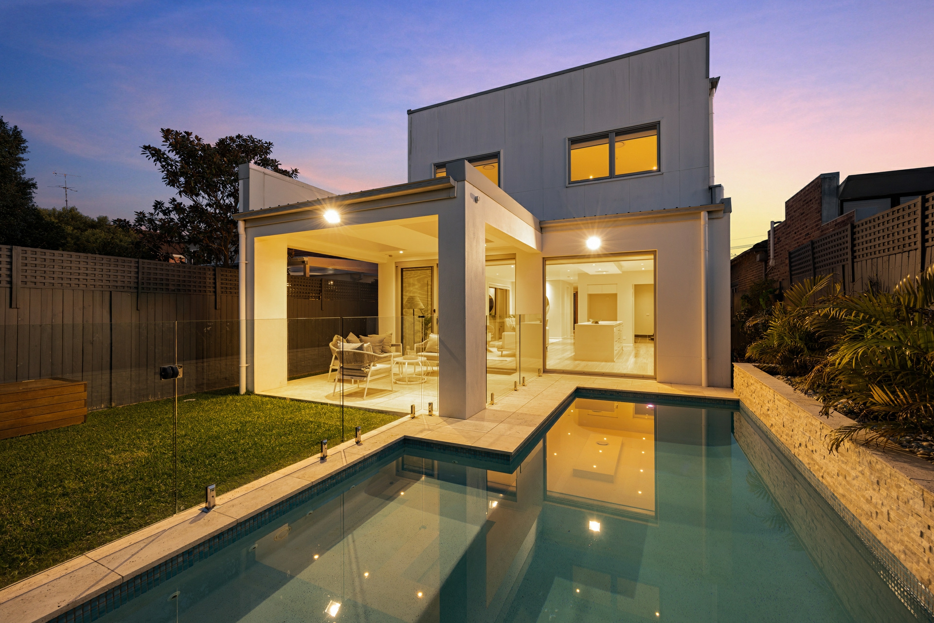 Set on a sun-drenched parcel with a prized north-facing rear, the home opens to a resort-style garden framed by lush landscaping, a sparkling freshwater pool, and travertine-paved entertaining terraces that invite year-round enjoyment. Inside, an intuitive floorplan offers a choice of living and retreat zones across both levels, with dedicated spaces for work, relaxation, and play.