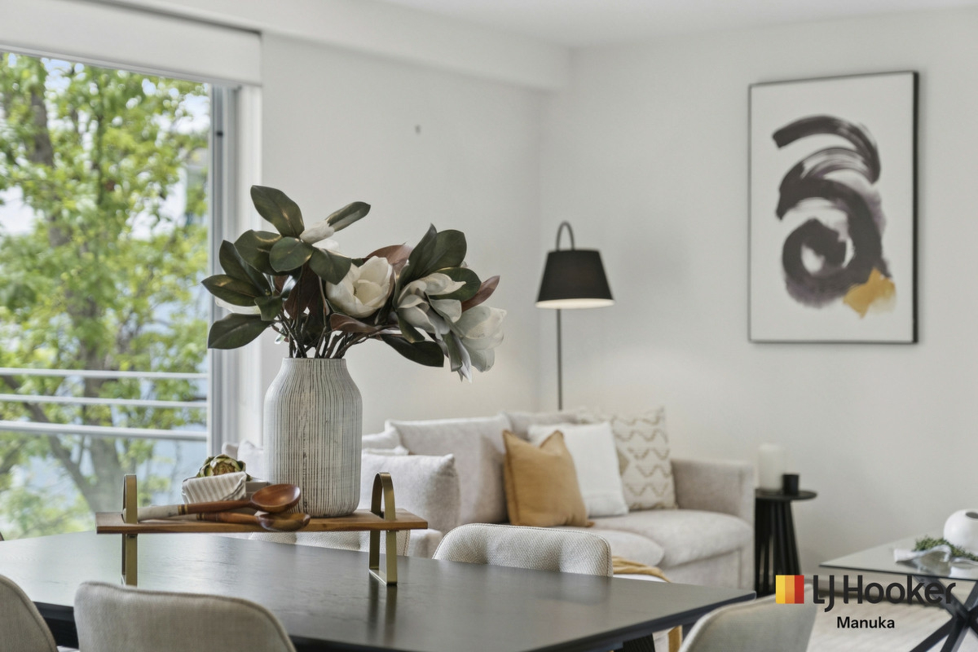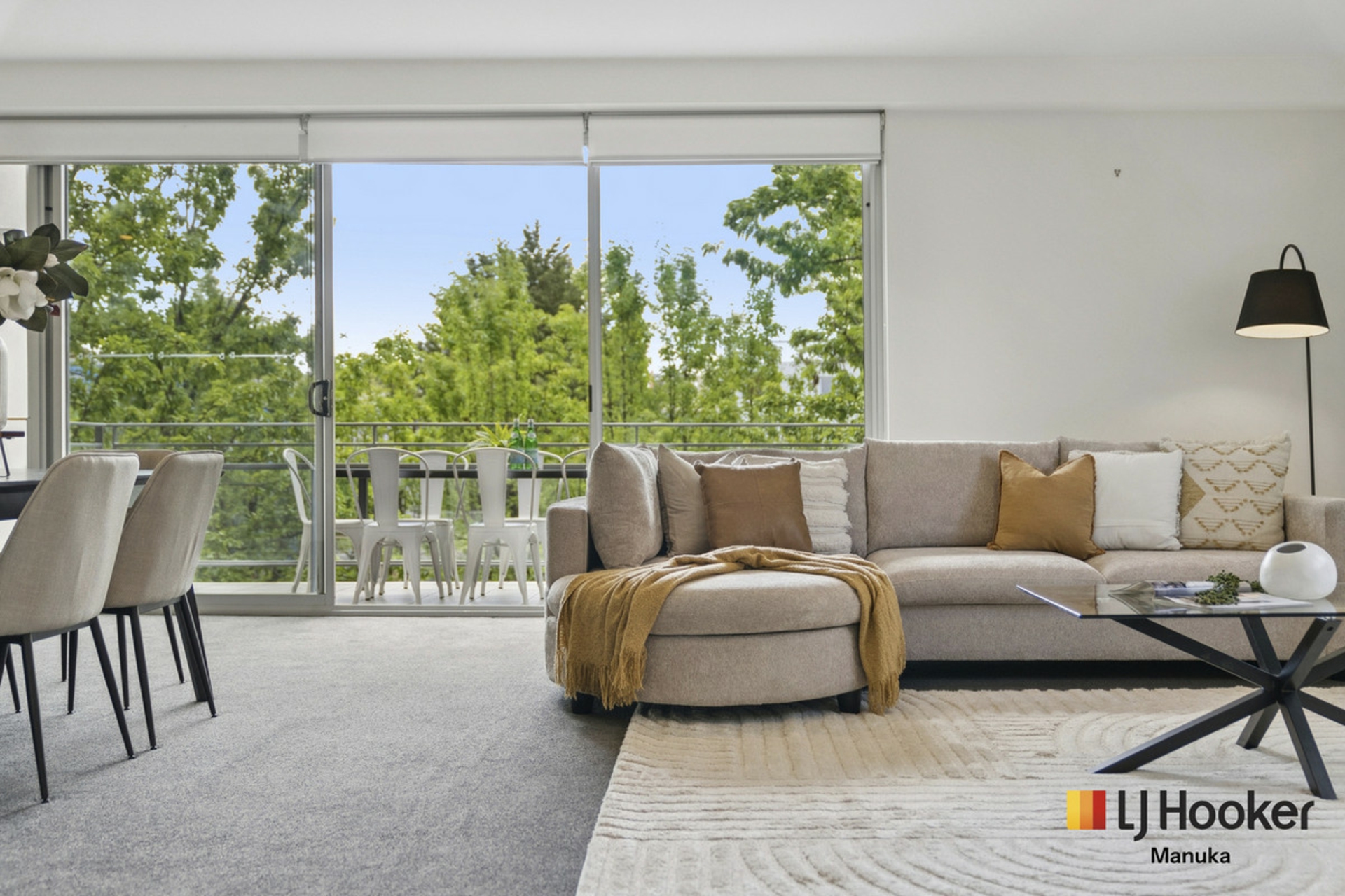The living area flows seamlessly to a large balcony, perfect for entertaining or simply enjoying the leafy outlook.