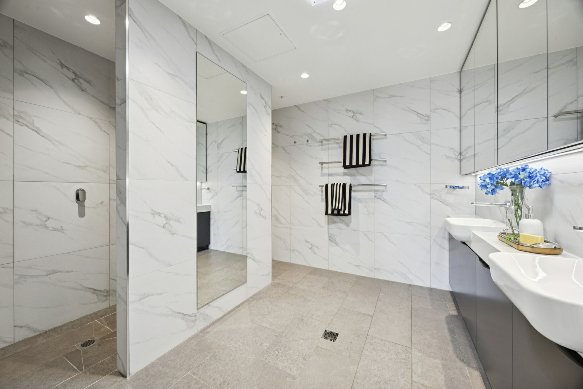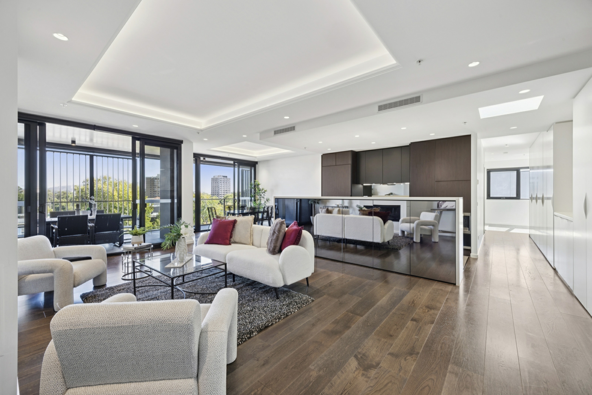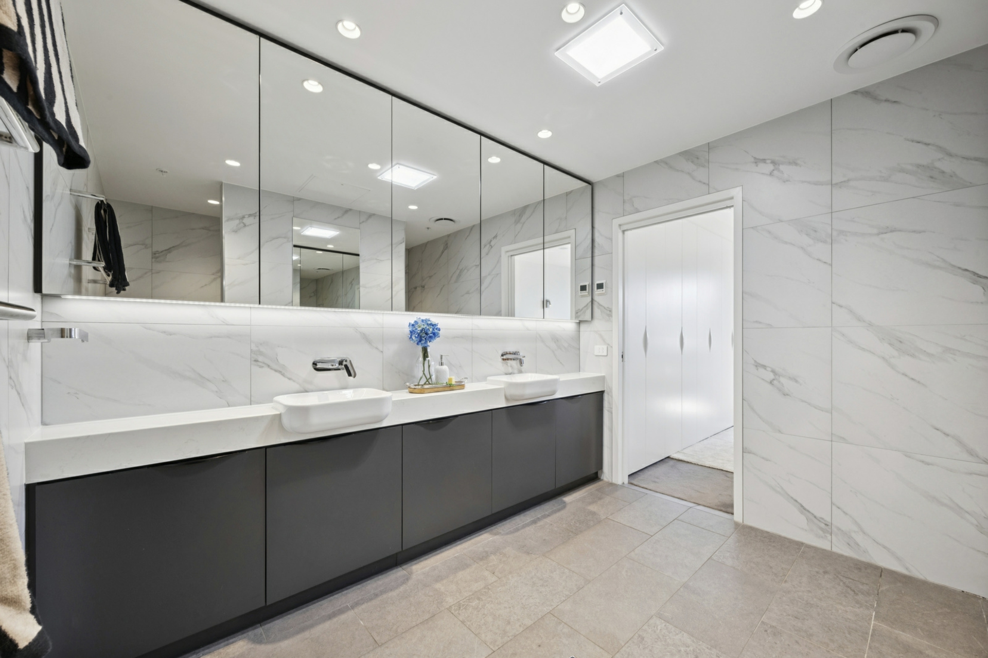 Accommodation is thoughtfully segregated for privacy, branching from a secondary living or media retreat, also enhanced by natural light via skylight. The luxurious master suite offers a private sanctuary, complete with a beautifully upgraded ensuite featuring double vanities and a striking full-height mirror. The remaining bedrooms are generously proportioned and serviced by a designer bathroom, with an additional powder room for guests. All bathrooms benefit from upgraded underfloor heating, adding a further layer of comfort and indulgence. Behind the scenes, enhanced wall insulation and acoustic upgrades ensure year-round comfort and a peaceful living environment.