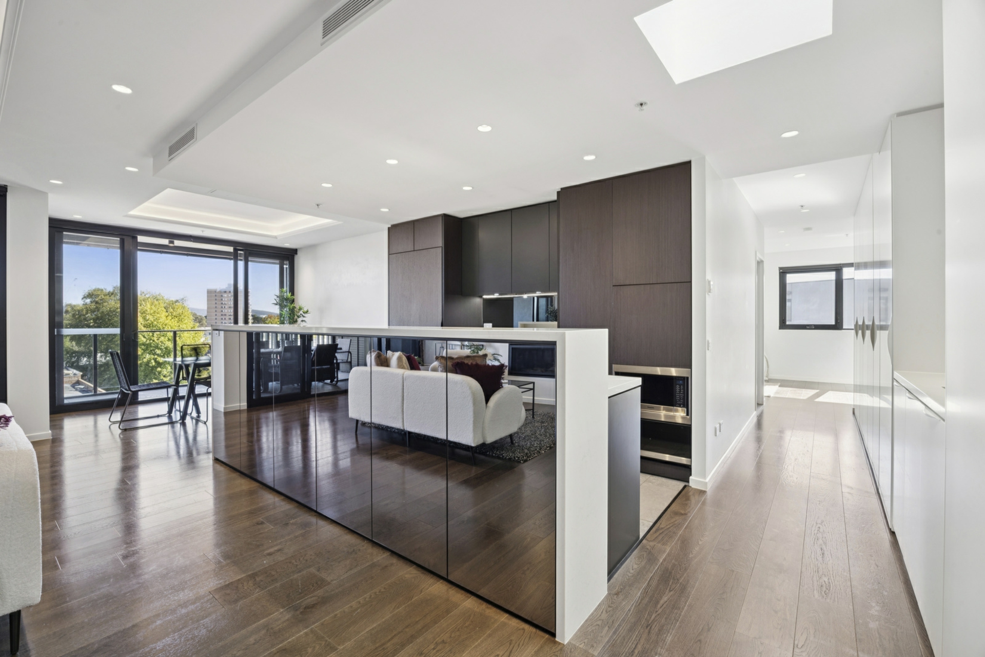 From the moment you enter, the home reveals a sense of scale and elegance, with a sun-drenched open plan living and dining domain complemented by a dedicated study nook. At its heart lies a statement kitchen of grand proportions - complete with premium integrated appliances, double ovens, expansive stone benchtops, and bespoke cabinetry. Coffered ceilings with LED feature lighting, a skylight, and a gas fireplace further elevate the ambience, while mirrored storage solutions add both style and functionality. Framed by sweeping, tree-lined vistas stretching toward Mount Ainslie, the living space offers a breathtaking backdrop to everyday life.