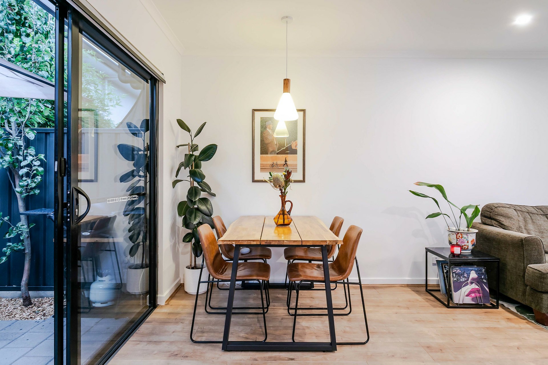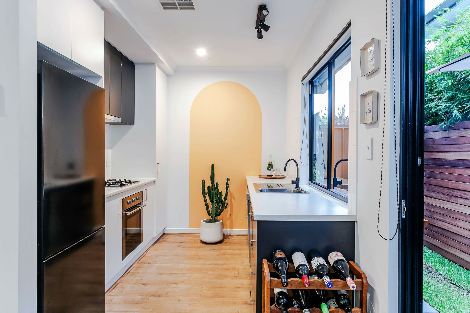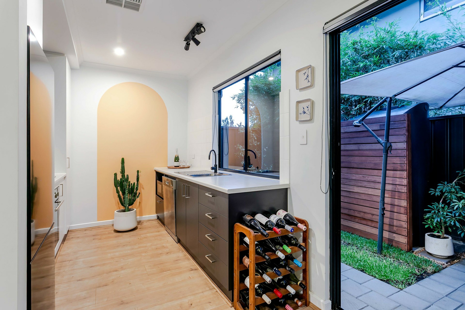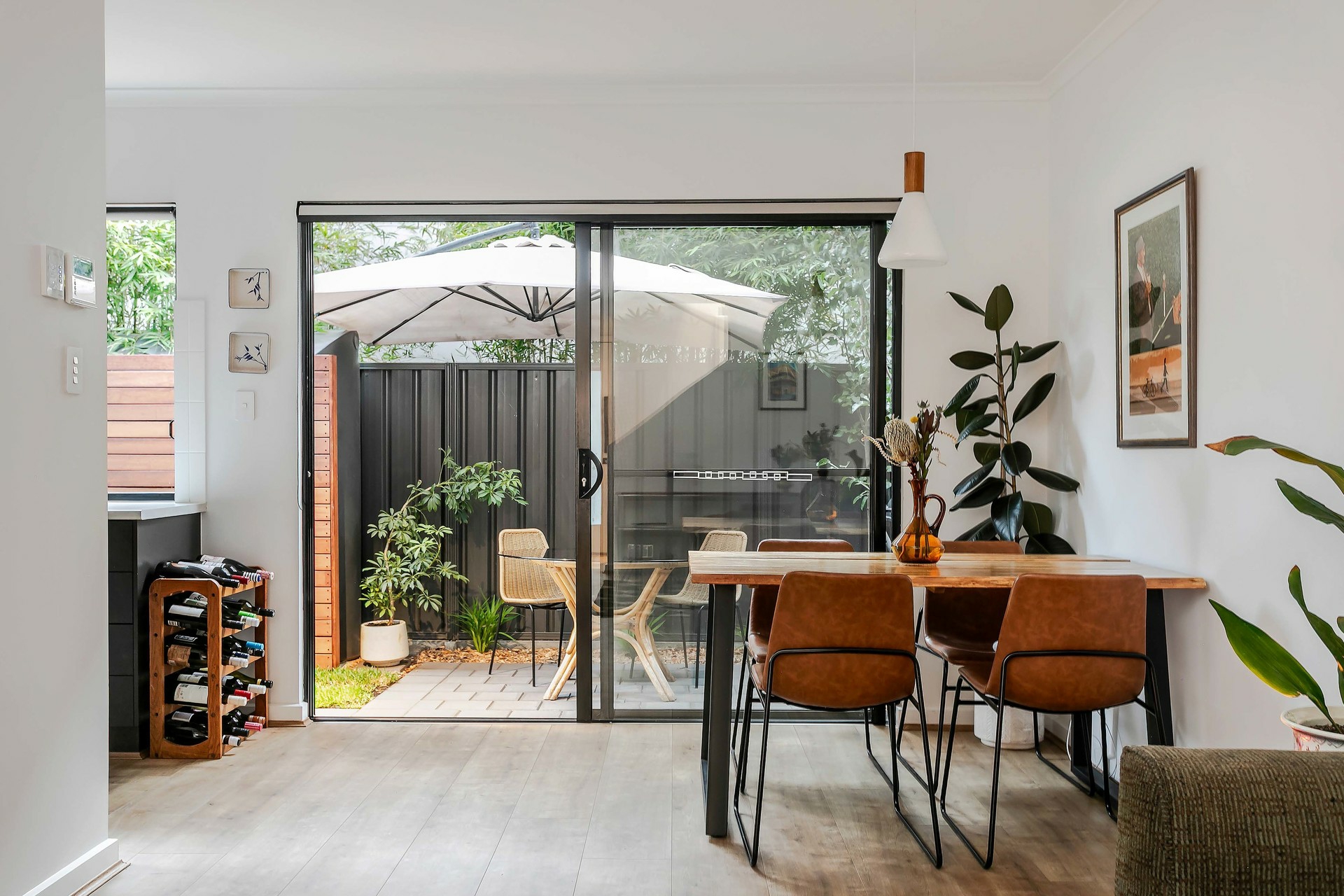 Outside, the courtyard offers a tranquil retreat, complete with a servery from the kitchen window, perfect for casual dining. Off-street parking is available with a secure garage.