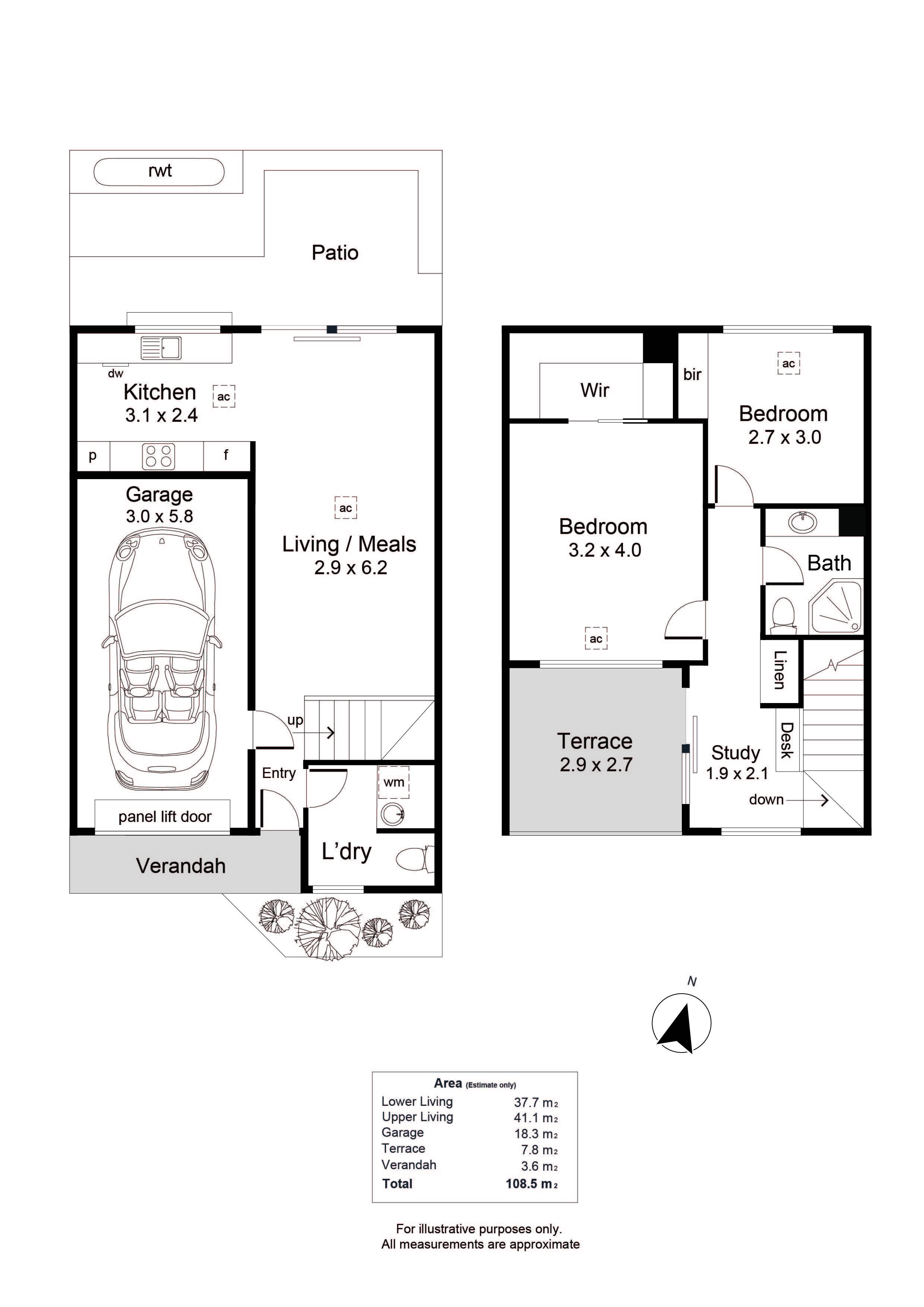 Upstairs, plush carpeting leads to a handy study nook and a private balcony, perfect for entertaining or a quiet morning coffee. Two generously proportioned bedrooms located upstairs, master with a walk-in wardrobe, and the second bedroom includes a built-in wardrobe. A central bathroom services the upstairs, and includes ample storage.