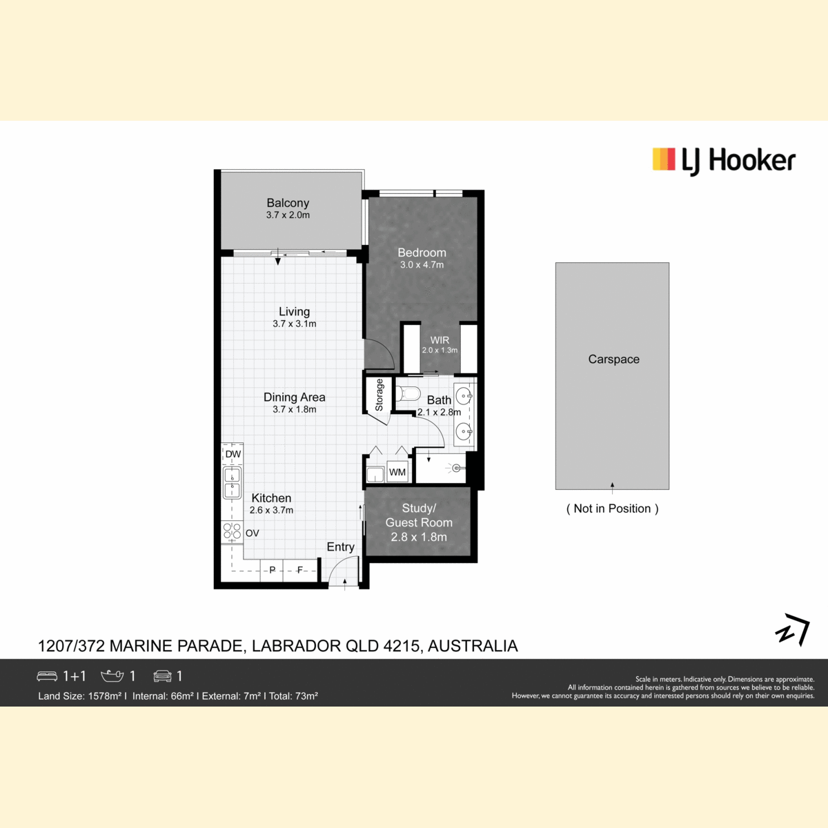 The apartment features a well designed layout with one spacious bedroom plus a versatile study, ideal for a home office, media room or guests. With a total floor area of approximately 73m�, the home offers generous proportions, quality finishes, and an abundance of natural light.