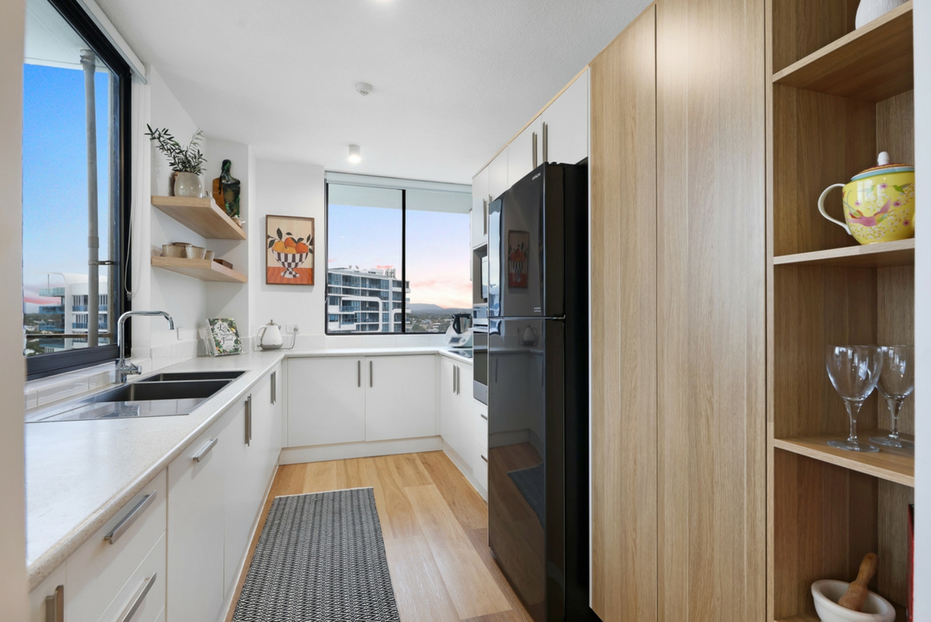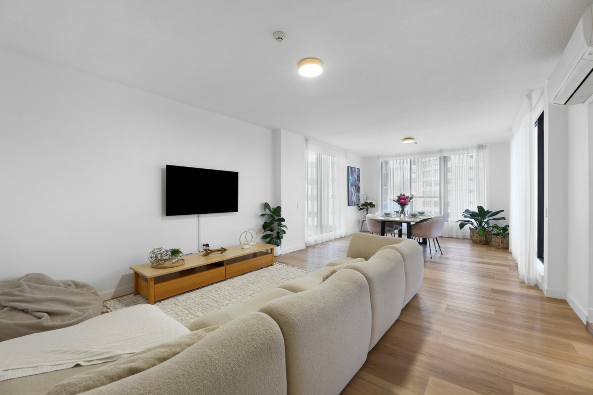 - Large windows flooding the apartment with natural light