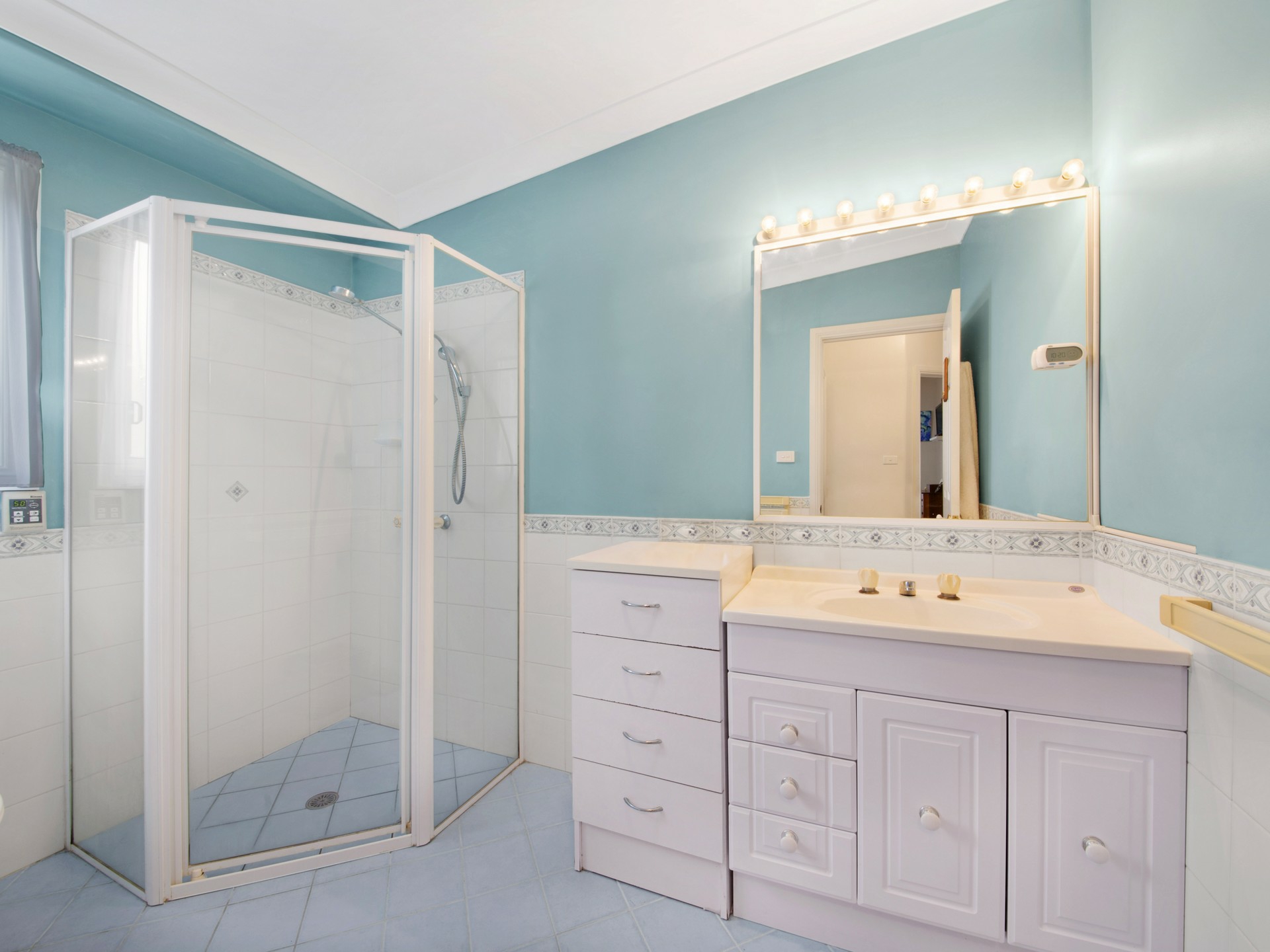 Large bathroom with double shower heads separate internal laundry and carport.