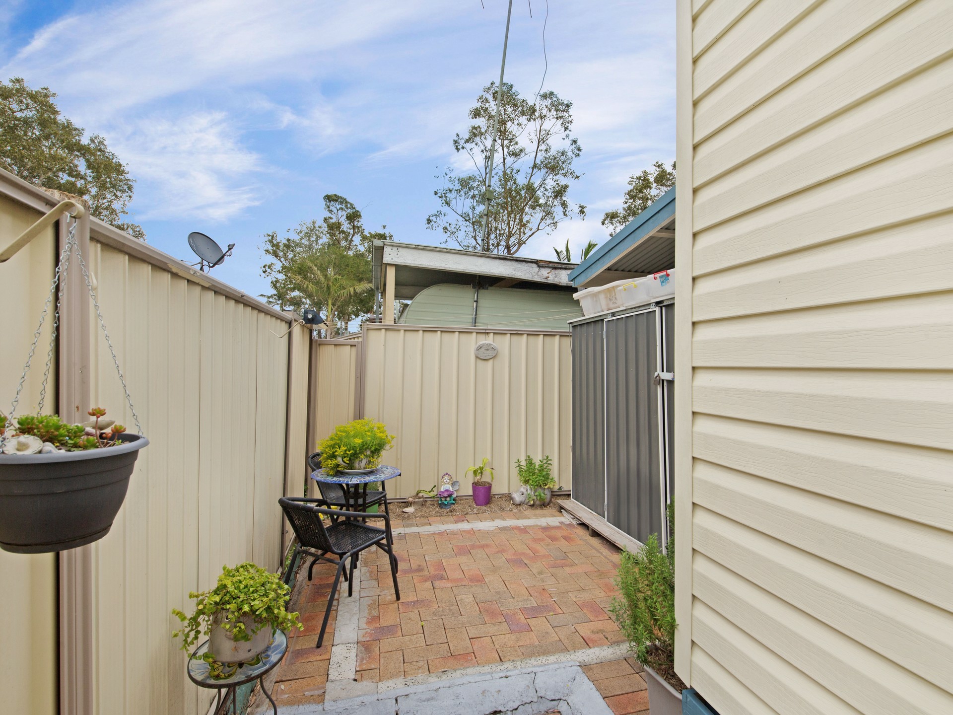 This lovely renovated Manufactured Home has all the creature comforts. It features two large sized bedrooms all with built-in robes, plus a study, open plan living room and dining area. The modern kitchen has gas cooking/electric griller and plenty of cupboard and bench space as well as a large fridge. Modern timber floating floorboards in lounge/dining room/kitchen/bedrooms, and tiles to wet areas .