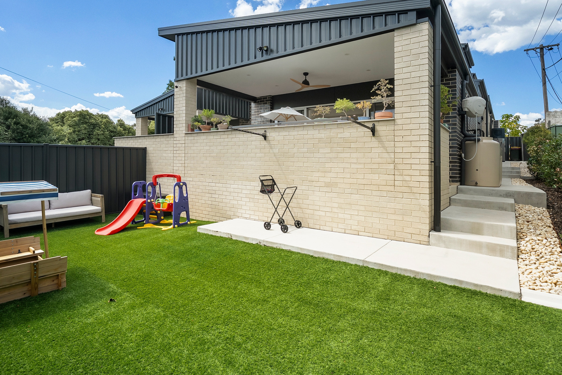 The backyard offers a grassed area for children or pets to play, while the unique addition of a catio provides a safe and secure outdoor space for furry family members.