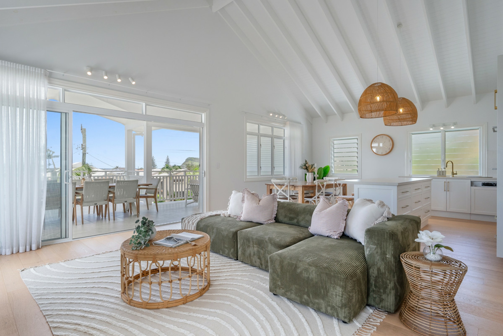 • Main Living Area: Featuring striking raked ceilings, a modern open-plan layout, and a kitchen equipped with stone benchtops, ample storage, and a convenient butler's pantry.