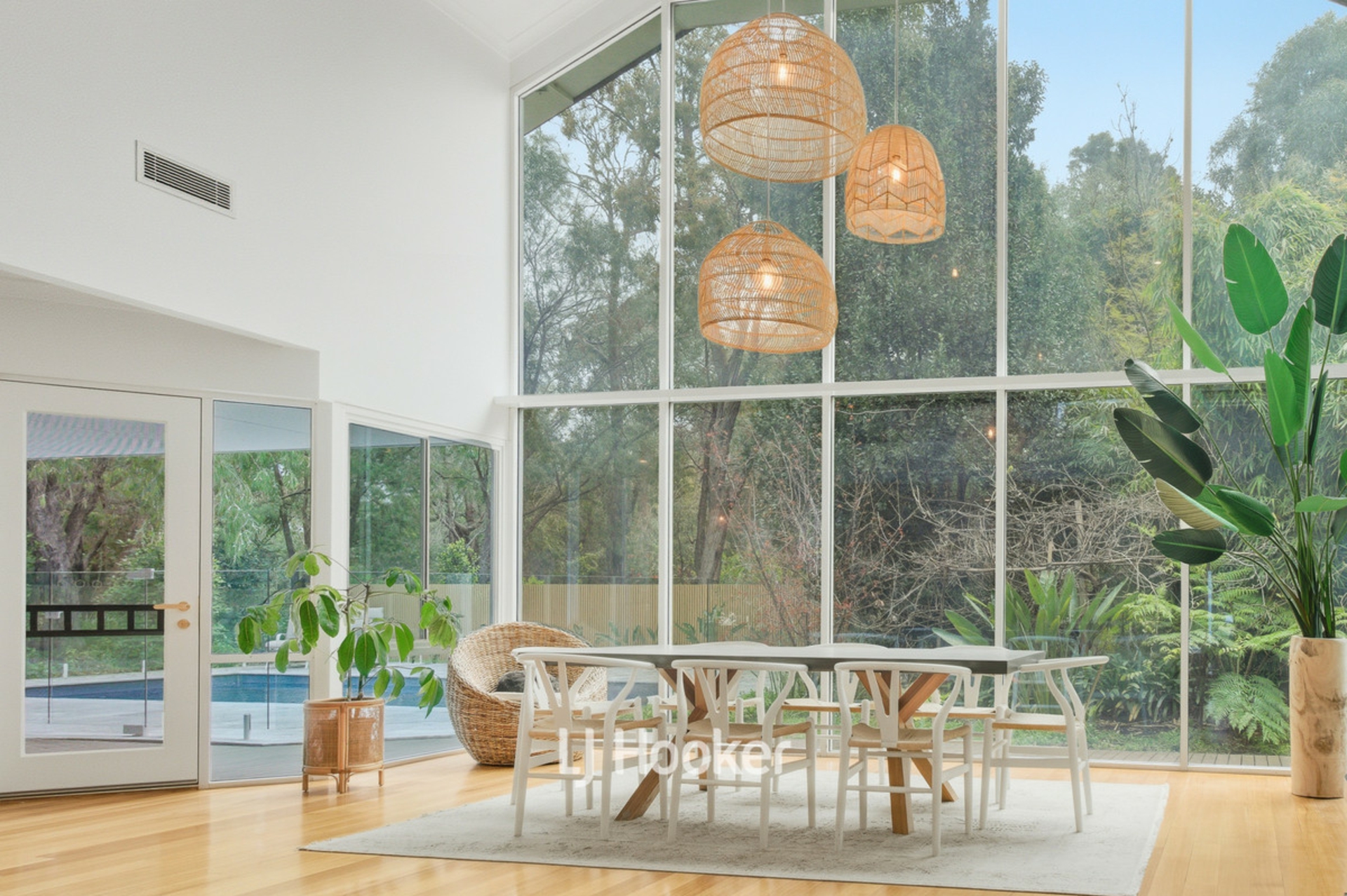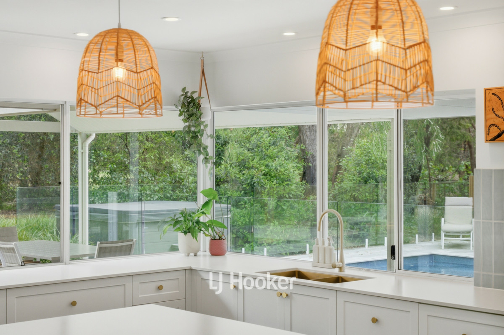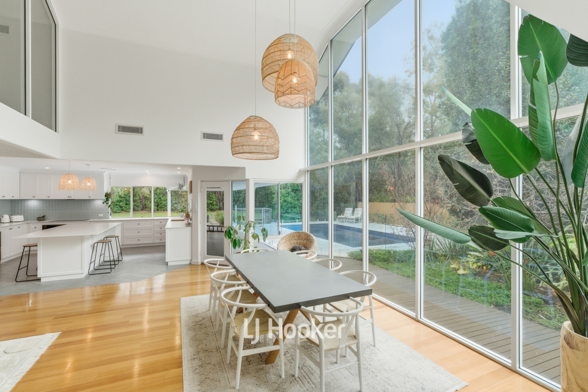 - Feature basket pendant lights over dining area