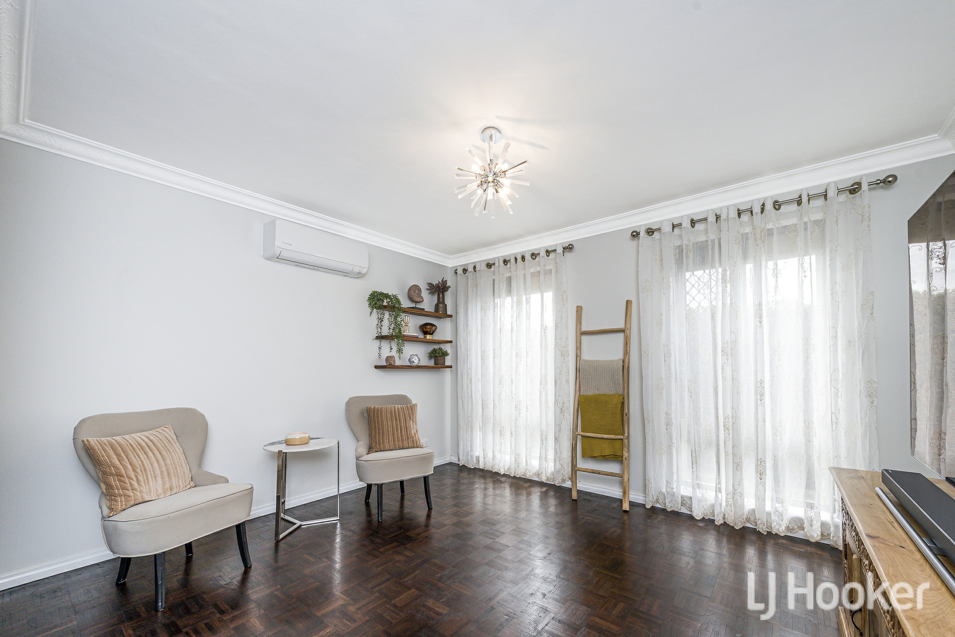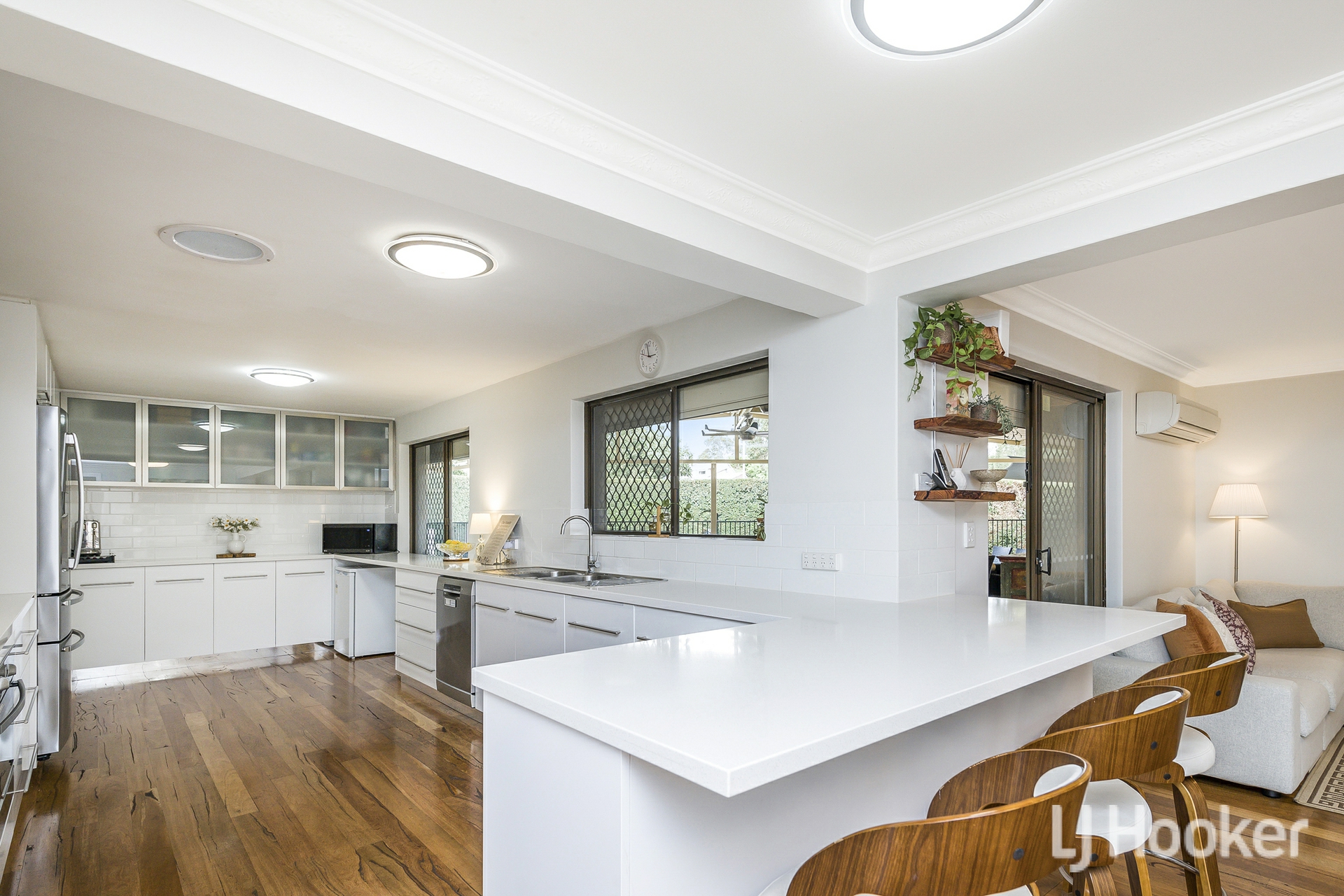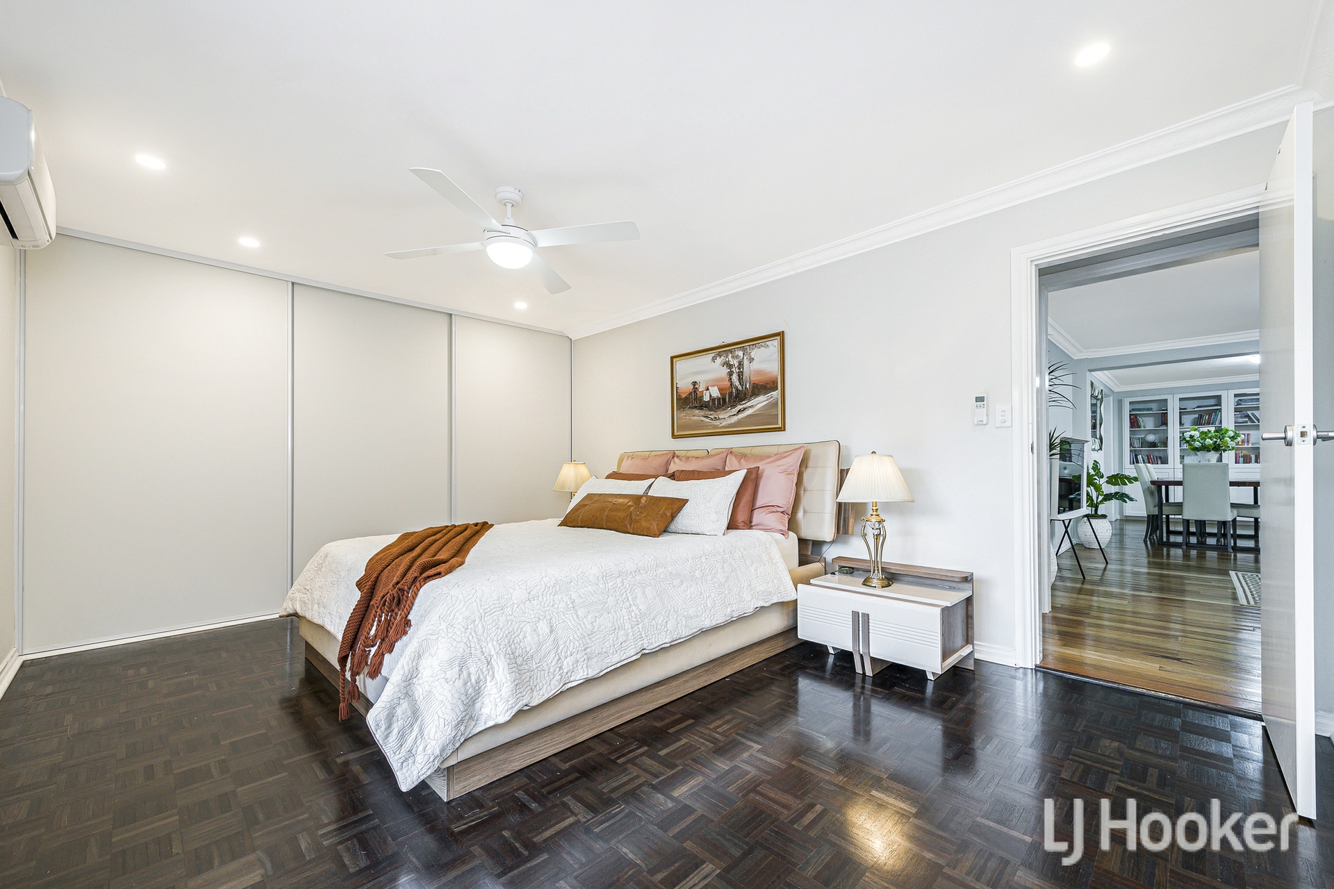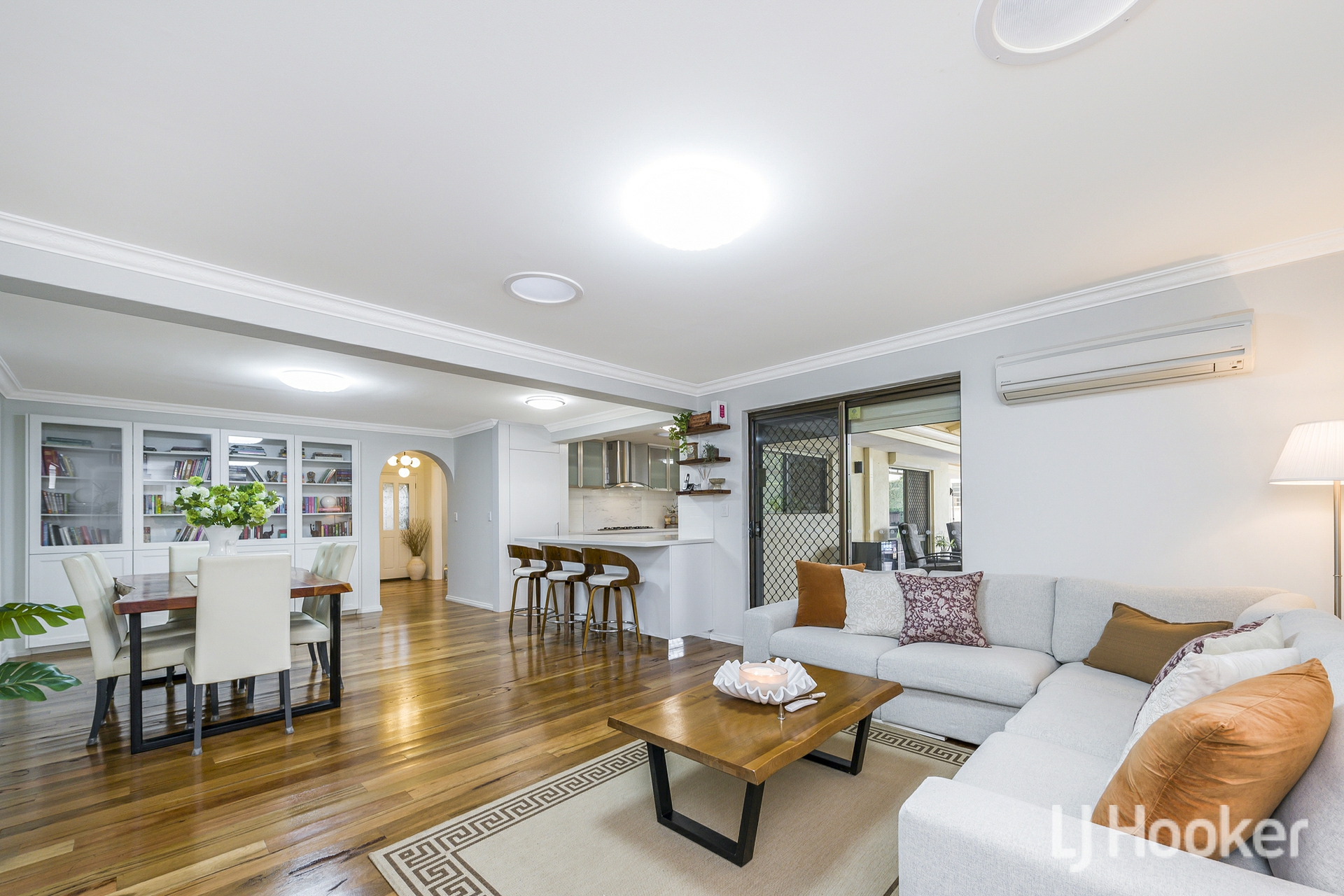 Inside, warmth meets functionality. Rich Jarrah flooring anchors the sunken front lounge, while a dedicated study/home office provides the ideal work-from-home retreat. All the living areas and bedrooms enjoys its own air-conditioning, ensuring year-round comfort no matter the season.